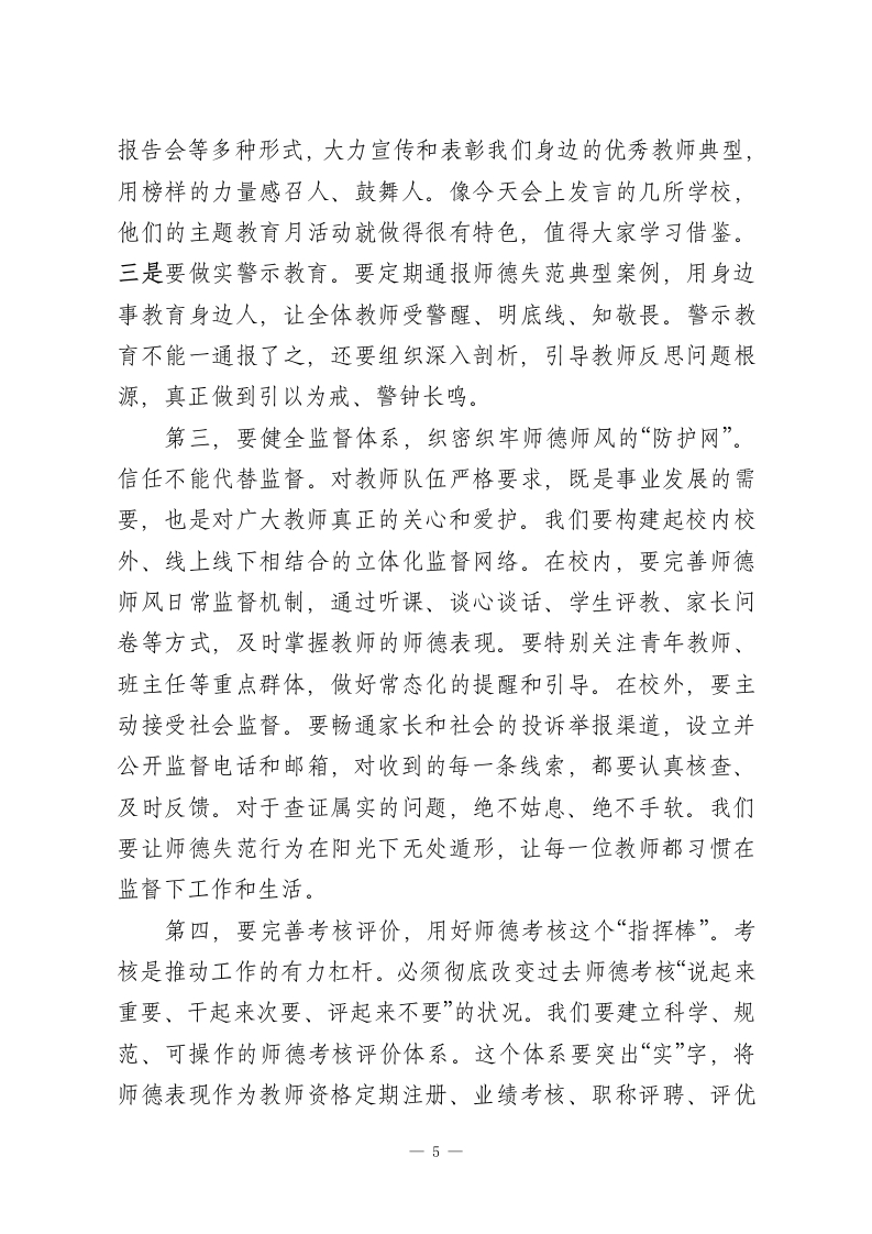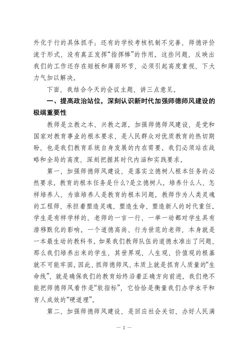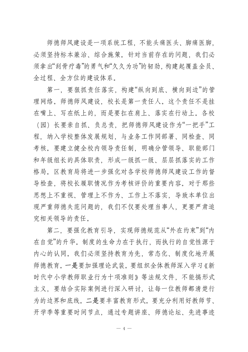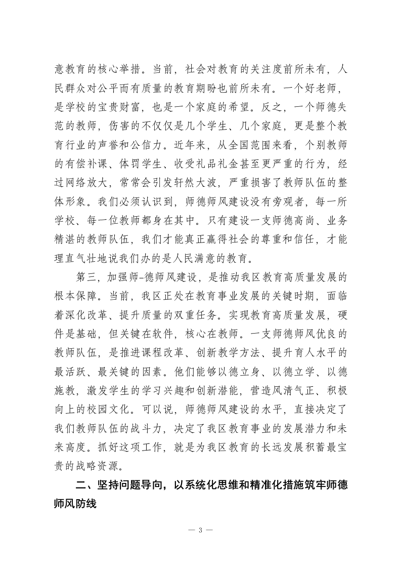 在XX区师德师风建设工作专题会议上的讲话同志们:今天,我们在这里召开全区师德师风建设工作专题会议。召开这次会议,既是贯彻落实国家、省、市关于加强新时代教师队伍建设系列决策部署的再深化、再落实,也是针对近期专项督导中发现的问题,进行的一次集中会诊和工作部署。会议的目的非常明确,就是要通过正视问题、剖析根源、明确方向,进一步统一思想、压实责任,以最坚决的态度、最务实的举措,全面加强我区师德师风建设,为办好人民满意的教育筑牢最坚实的根基。刚才,会议通报了近期专项督导发现的问题和几起违反师德师风的典型案例,XX中学、XX中心小学、XX中学等三所学校也分享了他们在师德师风主题教育月活动中的经验做法,讲得都很好,各有侧重,也很有启发。这些案例,虽然只是极少数,但性质严重,影响恶劣,为我们每一位教育工作者都敲响了警钟。三所学校的经验,展示了我们基层学校在师德师风建设上的积极探索和初步成效。总的来看,自主题教育活动启动以来,全区各学校严格按照“六个一”工作要求,精心组织,扎实推进,取得了阶段性成果。但我们必须清醒地认识到,成绩背后依然存在不容忽视的问题。比如,有的学校学习研讨覆盖面不广,存在“上热中温下冷”的现象;有的学校工作举措不实,满足于开会发文、签订承诺书,缺乏将师德规范内化于心、1