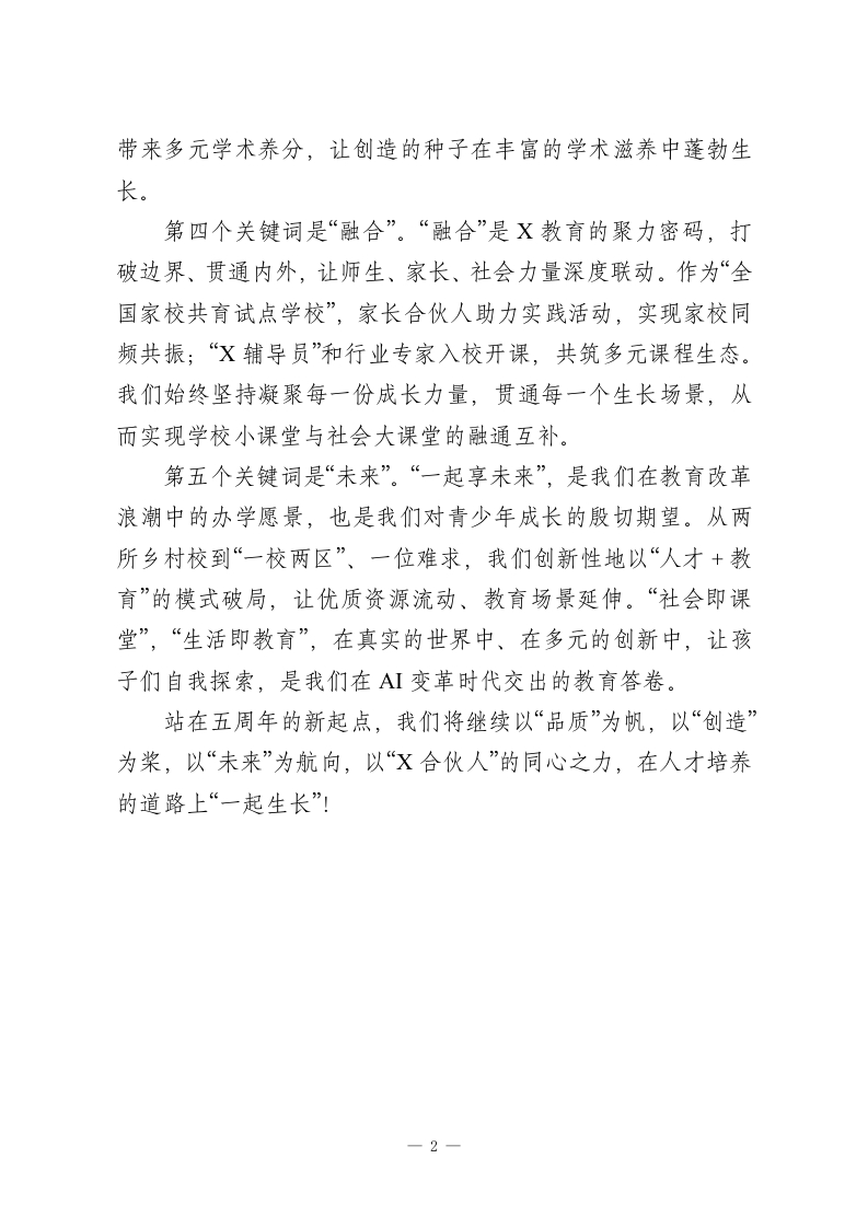 在X小学五周年办学成果展上的讲话:五大关键词点亮教育新图景尊敬的各位领导、来宾,亲爱的老师、同学们:大家上午好!非常感谢大家在百忙之中来到X,与我们共同回顾五周年办学历程。过去的五年来,在各级领导的关心与支持下,X的师生家校共生长,书写出属于我们的故事。今天,我们特邀各位“X”合伙人与我们一起,用五个关键词,交出我们的办学答卷。第一个关键词是“生长”。在X,我们秉持“以才育才,蓬勃生长”的办学理念,积极开展教育教学工作,致力于让学生们在真实的世界中,在充满童真童趣的文化中学习成长。“一起生长吧”,不仅是学生们耳熟能详的校歌和“X口号”,更是校园内每天飘荡的旋律,是每个生命向阳而生的光彩。第二个关键词是“品质”。作为年轻的学校,我们构建了“名师引领为塔尖、骨干教师为塔身、全体教师发展为塔基”的金字塔人才发展战略。作为“X省教育科研实践基地校”,我们吸纳了大量研究生学历教师加盟,着力培育高层次师资力量,为“X品质”筑牢坚实核心。第三个关键词是“创造”。我们秉持“创造无限可能”的育人追求,让创新精神在多元实践中落地生根。在造船、造车和创业等项目化学习中,同学们在动手实践中解锁工程乐趣,在真实场景中锤炼创新品格。借助人才优势,我们进一步创新课程体系。从“X辅导员”到“六大学院制课程”,让高校人才1