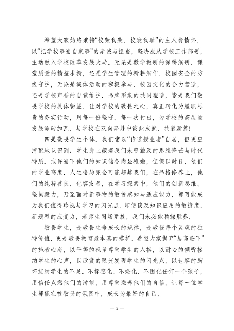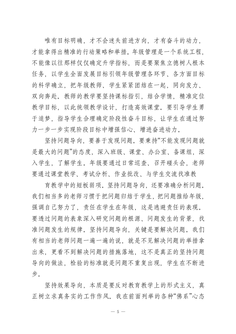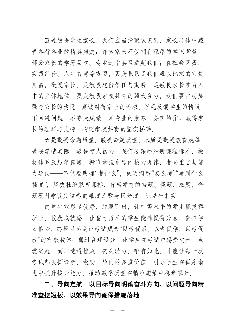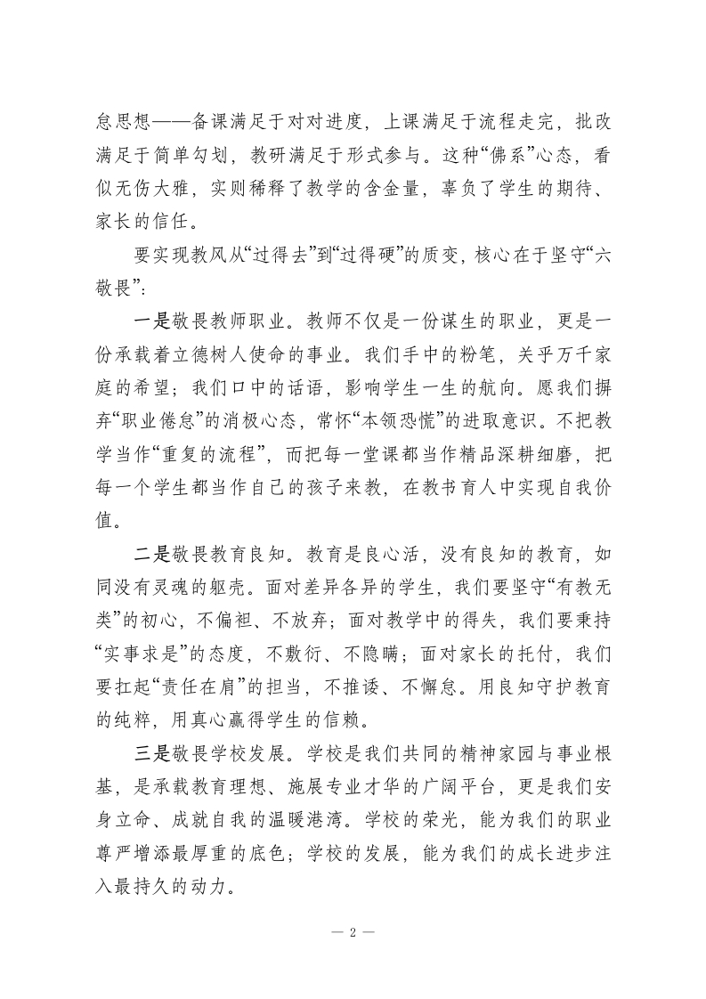 在高二年级期中考试分析会上的讲话各位老师,大家晚上好!过去一段时间,高二年级全体同仁始终坚守育人初心、扛起教学重任,在各自的岗位上挥洒汗水、默默耕耘,用责任与担当筑牢了年级发展的坚实根基。蹲点领导X书记始终深耕一线、靠前指挥,在教学统筹、问题协调中亲力亲为,以务实作风为大家保驾护航;年级组长履职尽责、精细管理,在教学调度、学情分析、活动组织中事事周全、件件落实;班主任更是以校为家、倾心守护,早出晚归,耐心细致化解学生矛盾,真心实意沟通家长,用脚步丈量责任、用真心温暖人心;全体任课教师深耕课堂、潜心教研,备课中精益求精、课堂上循循善诱,课后耐心辅导、作业批改时细致入微,用专业与坚守诠释着教育者的初心。正是这份上下同心、同向同行的凝聚力,这份不计得失、全力以赴的奉献精神,让高二年级在教学工作中稳步推进、成效初显。今天大家齐聚一堂,既是对过往工作的复盘总结、对期中考试暴露的问题深入剖析,更是为了凝聚共识、校准航向,再鼓干劲、再启新程。结合高二年级前段的教学实际与本次分析暴露的问题,我重点讲四个方面的内容,与大家共勉共进。一、教风立魂:从“过得去”到“过得硬”,以“六敬畏”,夯实育人根基教风是教学质量的“生命线”,是学校发展的“精气神”。当前,我们的教风整体向好,但部分环节仍存在“差不多“过得去”的懈1