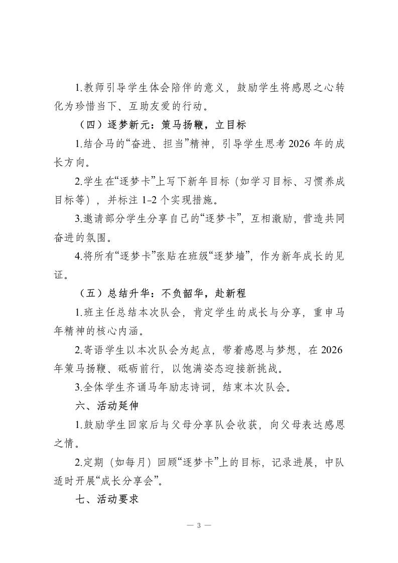 “骏马踏春,感恩同行”2026元旦主题队会教案一、活动目标1.认知目标:了解马年的民俗文化、成语典故及经典诗词,知晓元旦辞旧迎新的寓意。2.情感目标:回顾2025年成长历程,体会陪伴与关怀的温暖,激发感恩之心与奋进意识。3.能力目标:提升语言表达与分享交流能力,学会结合马的精神树立清晰的新年目标。二、活动准备1.学生准备:提前搜集马年相关资料(民俗、成语、诗词等),梳理个人2025年成长收获、难忘瞬间及感恩对象,准备1-2分钟分享内容。2教师准备:制作包含马年元素、年度成长主题的PPT,准备“逐梦卡”(每人1张)、马年主题小贴纸,布置教室(融入骏马剪纸、“龙马精神”标语等)。3.其他:安排专人负责活动拍照存档,确保照片清晰可用于后续归档。三、活动时间2025年12月29日下午班队会时间(40分钟)四、参与对象本中队全体学生一1