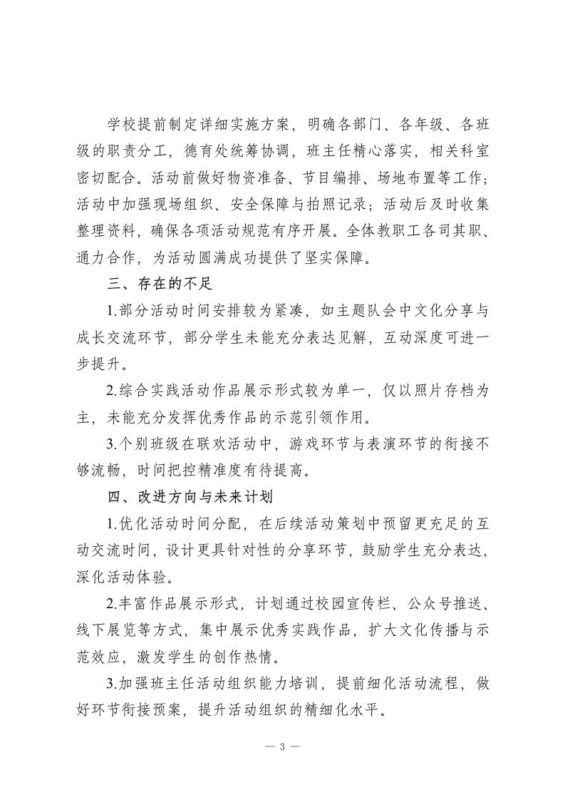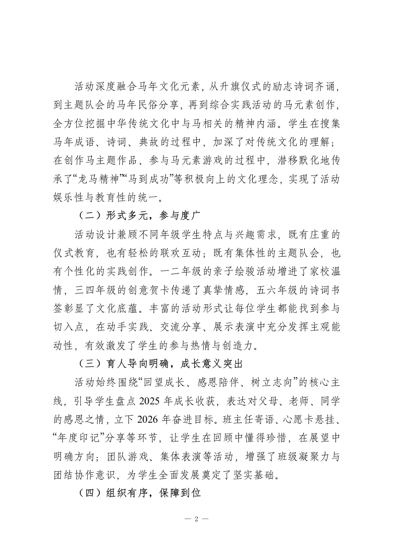 “骏马迎春,逐梦新元”2026年学校庆元旦系列活动总结2025年12月29日至31日,我校以“骏马迎春,逐梦新元”为主题,精心组织开展了涵盖仪式、文化、实践、娱乐等多维度的庆元旦系列活动。全体师生积极参与、同心同行,在辞旧迎新的浓厚氛围中传承文化、感恩成长、共话梦想,活动取得圆满成功。现将活动总结如下:一、活动开展概况本次系列活动紧扣马年“奋进、拼搏、昂扬向上”的精神内核,围绕“立德树人”根本目标,设计了六大板块核心内容。“骏马扬旗,共启新元”元旦升旗仪式拉开活动序幕,以庄重仪式凝聚师生奋进力量;“骏声传情,福润校园”红领巾广播用温暖声音传递感恩与祝福;“骏马踏春,感恩同行”中队主题队会深化文化交流与成长感悟;“骏彩飞扬,梦想绽放”元旦联欢会营造欢乐祥和的新年氛围;“童心向党,骏礼献福”综合实践活动结合不同年级特点,开展亲子绘骏、创意贺卡、诗词书签等特色活动;“骏马蹄疾启新程,学子欢腾庆元旦”文艺汇演精彩收官,全方位展现师生风采。活动覆盖全体师生,参与率达100%,累计收集各类活动资料、作品千余件,充分达成了“激发青春活力、传承传统文化、培养优良品质”的活动目标。二、活动亮点与成效(一)主题鲜明,文化内涵深厚一1