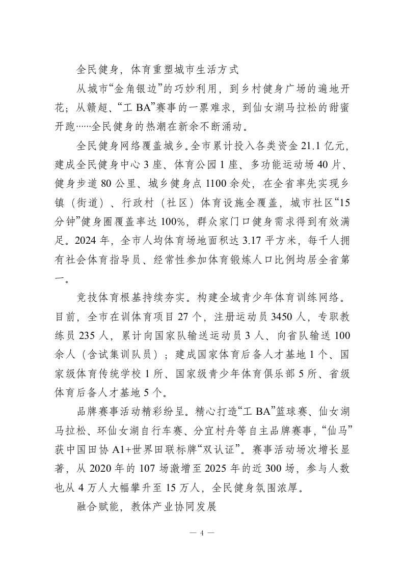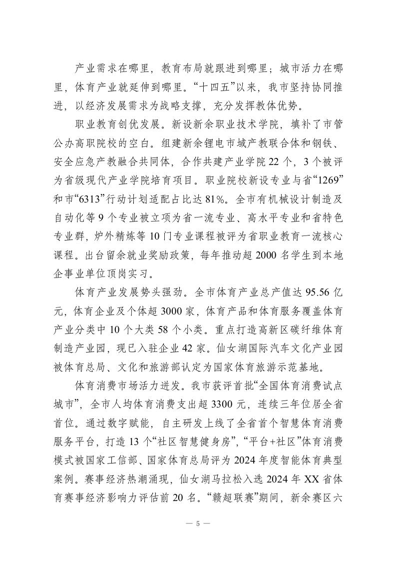 “十四五”时期教体事业高质量发展总结:让教育阳光普照,让体育活力满城教育是民生之基,体育是活力之源。“十四五”以来,我市坚持以人民为中心的发展思想,全面落实立德树人根本任务,践行体育为民惠民初心,深化教体融合,交出了一份成果丰硕、亮点纷呈的高质量发展答卷。立德树人,构建“五育融合”新格局育人之本,在于立德铸魂。把思政教育“小课堂”和社会“大课堂”有效融合起来,把德育工作做得更到位、更有效。我市推动“大中小幼”思政课一体化共同体建设,创新开展新余本土“行走的思政课堂”活动,充分利用本土红色资源,让思政课活起来、实起来。全市共有19所学校获评省级红色基因传承示范校,红色基因深深融入学生血脉。少儿艺术已成为全市一张响当当的文化“金名片”。少儿舞蹈在“小荷风采”全国展演中累计荣获5项金奖,少儿体操连续十六年荣获XX省青少年体操锦标赛团体总分第一名。推动学校、家庭、社会形成育人合力,XX区入选全国学校家庭社会协同育人实验区。校园就是实验室,学生都是小小科学家。我市坚持科学教育全域推进,打造4所国家级科学教育实验校和1个国家级科学教育实验区。创新推出“天工少年”科学教育品牌,编印并发放《天工开物文化学生读物》7.4万册,实现全学段覆盖,厚植—1