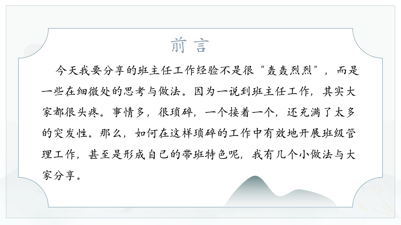 【班主任】工作经验分享PPT:于细微处开出“班级管理之花”tangqi883小时前发布关注私信15.50MB22页03511 第1页 / 共22页 第2页 / 共22页 第3页 / 共22页 第4页 / 共22页 第5页 / 共22页 试读已结束,还剩17页,您可下载完整版后进行离线阅读 【班主任】工作经验分享PPT:于细微处开出“班级管理之花”此内容为付费资源,请付费后查看¥9.9¥19.9VIP会员免费立即购买您当前未登录!建议登陆后购买,可保存购买订单付费资源© 版权声明本站是一个信息分享及获取的平台,不确保部分用户上传资料的来源及知识产权归属,资料由老师投稿,公开渠道整理,网友上传,如果侵犯到您的权益,请联系客服删除THE ENDPPT课件 文本预览 于细微处开出“班级管理之花一一班主任工作经验分享班主任:X老师时间:2025.12 查看更多 收起部分 喜欢就支持一下吧点赞11 分享QQ空间微博QQ好友海报分享复制链接收藏