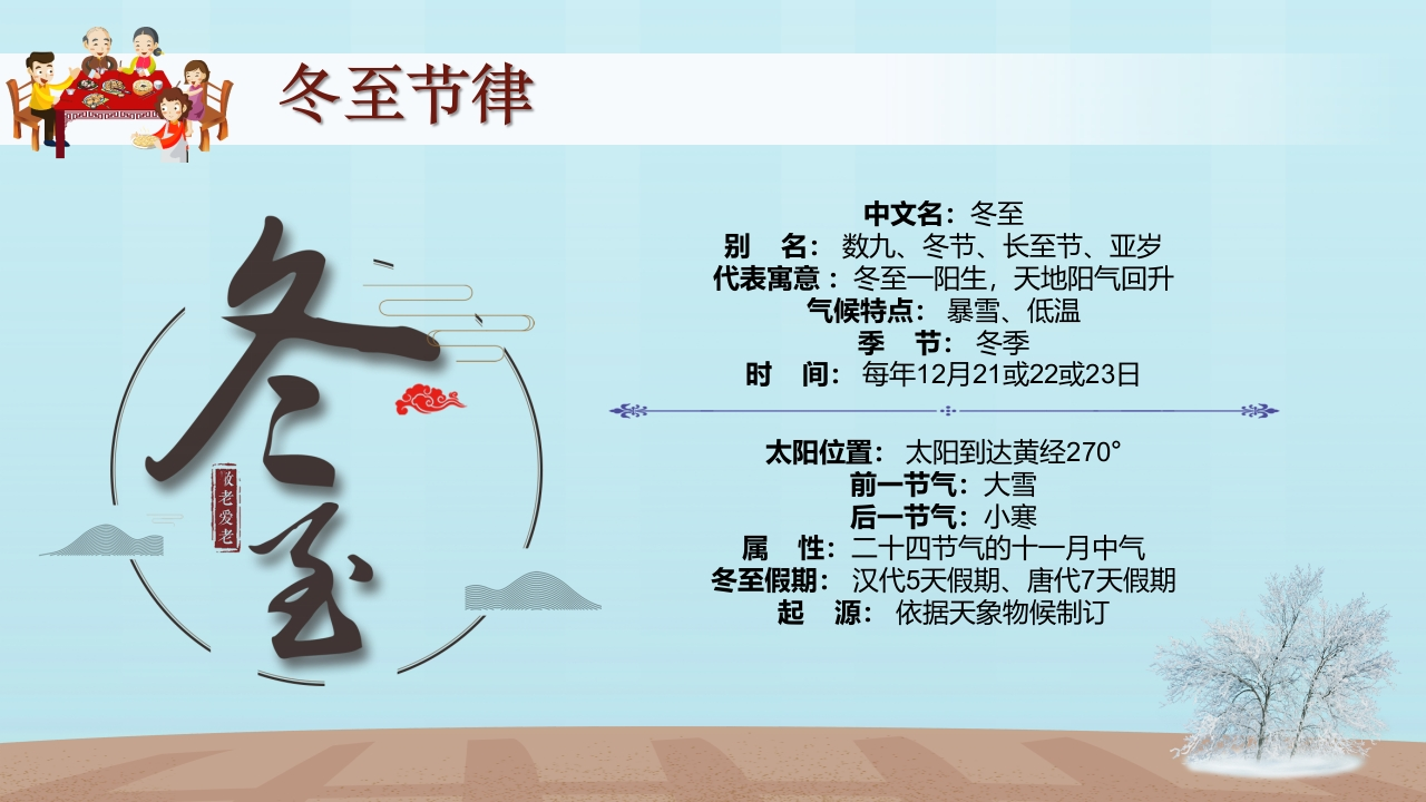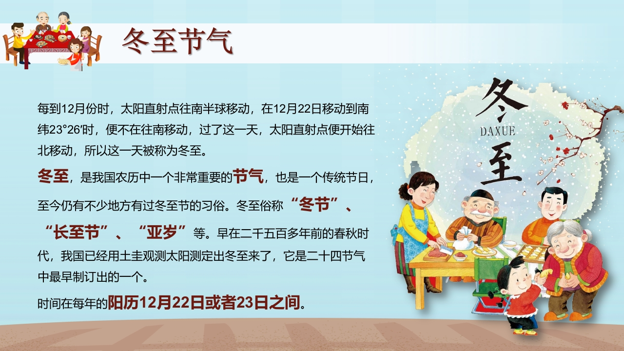 【通用】【传统节气-冬至】主题班会《知传统节气,品趣味冬至》tangqi884小时前发布关注私信14.52MB26页04515 第1页 / 共26页 第2页 / 共26页 第3页 / 共26页 第4页 / 共26页 第5页 / 共26页 试读已结束,还剩21页,您可下载完整版后进行离线阅读 【通用】【传统节气-冬至】主题班会《知传统节气,品趣味冬至》此内容为付费资源,请付费后查看¥9.9¥19.9VIP会员免费立即购买您当前未登录!建议登陆后购买,可保存购买订单付费资源© 版权声明本站是一个信息分享及获取的平台,不确保部分用户上传资料的来源及知识产权归属,资料由老师投稿,公开渠道整理,网友上传,如果侵犯到您的权益,请联系客服删除THE ENDPPT课件 文本预览 ⊙中国传冬至节亦称冬节、交冬,是中国传统的二十四节气之一,曾有“冬至大如年“的说法宫廷和民间历来十分重视,从周代起就有祭祀活动,二十四节气⊙包园司 查看更多 收起部分 喜欢就支持一下吧点赞15 分享QQ空间微博QQ好友海报分享复制链接收藏