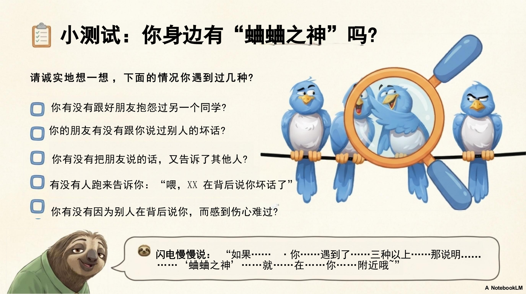 【通用】【交友友谊】主题班会:远离背后蛐蛐_让友谊在阳光下绽放-疯狂动物城2主题tangqi884小时前发布关注私信17.96MB20页02613 第1页 / 共20页 第2页 / 共20页 第3页 / 共20页 第4页 / 共20页 第5页 / 共20页 试读已结束,还剩15页,您可下载完整版后进行离线阅读 【通用】【交友友谊】主题班会:远离背后蛐蛐_让友谊在阳光下绽放-疯狂动物城2主题此内容为付费资源,请付费后查看¥9.9¥19.9VIP会员免费立即购买您当前未登录!建议登陆后购买,可保存购买订单付费资源© 版权声明本站是一个信息分享及获取的平台,不确保部分用户上传资料的来源及知识产权归属,资料由老师投稿,公开渠道整理,网友上传,如果侵犯到您的权益,请联系客服删除THE ENDPPT课件 文本预览 远离“背后蛐蛐”一让友谊在阳光下绽放主题班会:友谊与沟通89NotebookLI 查看更多 收起部分 喜欢就支持一下吧点赞13 分享QQ空间微博QQ好友海报分享复制链接收藏