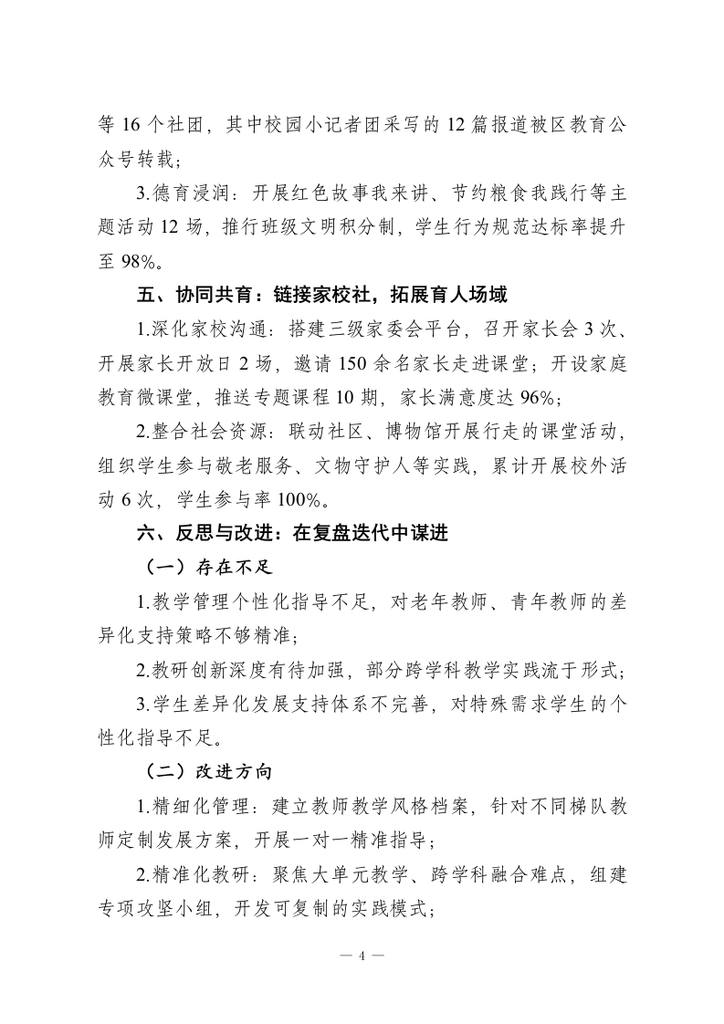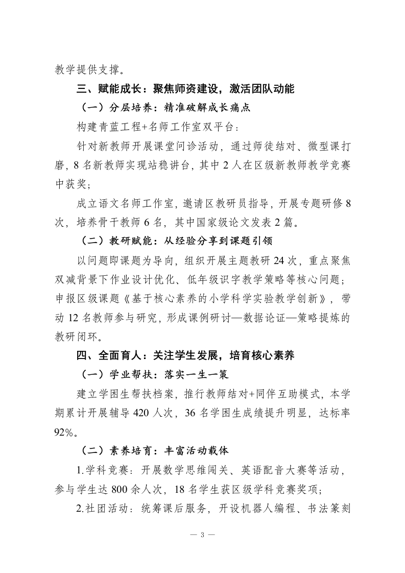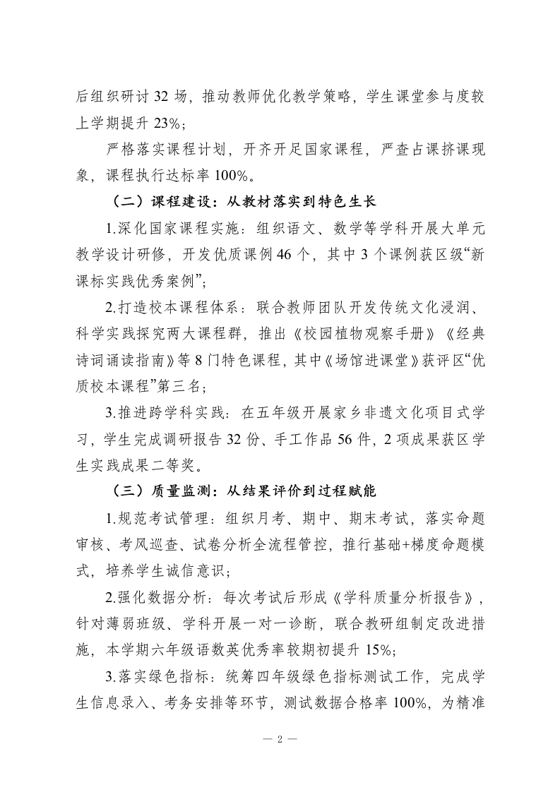 2025-2026学年第一学期小学教导处主任个人工作总结本学期,我在学校领导班子的引领下,以夯实教学根基、赋能师生成长、提升育人质量为核心目标,立足教导处统筹协调、指导服务的职能,深耕教学管理、聚焦师资建设、关注学生发展,各项工作有序推进。现将本学期履职情况总结如下:一、铸魂育人:坚守教育初心,强化思想引领1.自身素养锤炼:始终忠诚党的教育事业,以《教育法》《教师法》为准则,践行教育即服务理念,坚持抬头做人、低头做事的工作原则。本学期系统学习新课标核心理念与双减深化政策,撰写学习笔记3万余字,在教师例会上开展政策解读2次,推动教育理念落地。2.示范引领作用:严格遵守学校管理制度,要求教师做到的率先垂范,累计代课12节、参与早读督查40余次,无迟到早退现象,获评学校师德标兵。二、精耕细作:抓实教学管理,筑牢质量生命线(一)常规管理:从规范执行到品质提升构建日常督查+专项反馈+整改跟进的闭环机制:每月联合教研组长开展教案、作业检查,采用定性评价+问题清单模式,本学期累计抽查教案126份、作业2800余本,针对备课目标模糊、作业分层不足等问题形成《教学改进建议手册》,整改完成率100%;推行推门听课制度,覆盖全学科教师,累计听课68节,课一1
