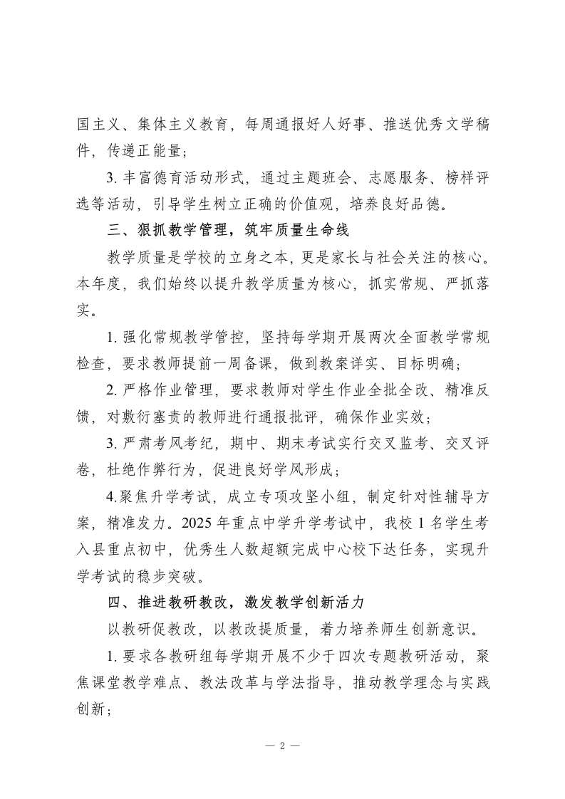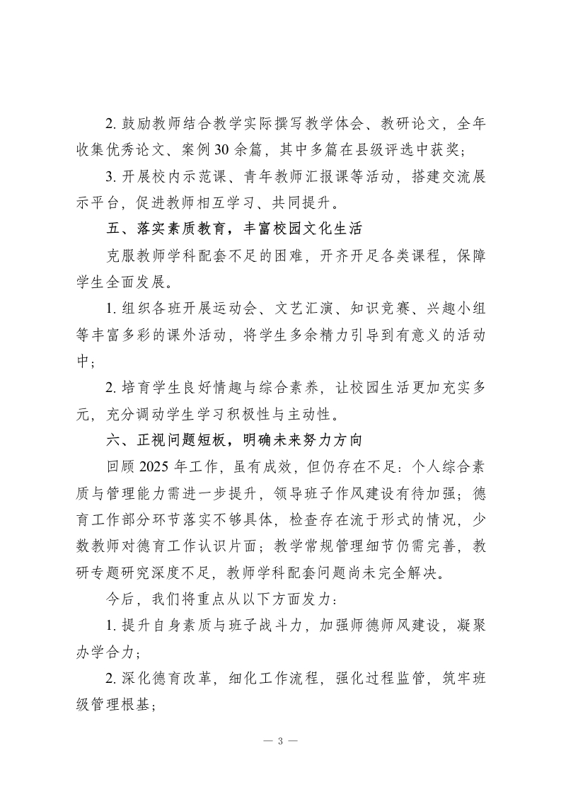 2025初中校长年终工作总结:以质立校,以绩惠民今年,本人始终坚守教育初心,认真贯彻党和国家教育方针政策,遵纪守法、爱岗敬业,团结带领全体教职工拼搏进取、真抓实干,全面推进素质教育,在年度重点中学升学考试中斩获佳绩,各项工作取得阶段性成效。现将本年度工作总结如下:一、强化队伍建设,提升教师综合素质教师是教育教学的核心力量,提升教师素养是学校发展的根本。1.组织教职工常态化开展政治业务学习,聚焦新课标、教育政策与师德规范,强化教师育人责任感;2.大力支持教师参与各学科新课程培训、外出研学等学习活动,鼓励教师拓宽知识视野、更新教育理念,全年累计组织各类培训40余人次,全面提升教师政治水平与业务能力。二、深化德育管理,营造优良育人环境牵头学校德育工作,由德育处具体负责班级与学生的日常检查管理,确保德育工作落地见效,推动校风、学风持续向好。1.加强班主任队伍建设,每月定期召开工作例会,研讨教与学情况、交流管理经验、分析学生思想动态,总结成绩与不足;2.要求各班常态化开展《中小学生日常行为规范》养成教育,充分利用国旗下讲话、校园广播、宣传栏等阵地,开展爱1