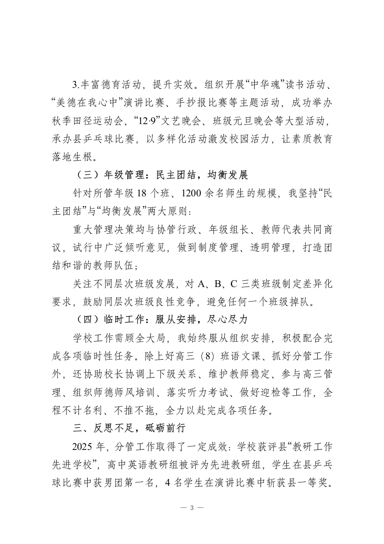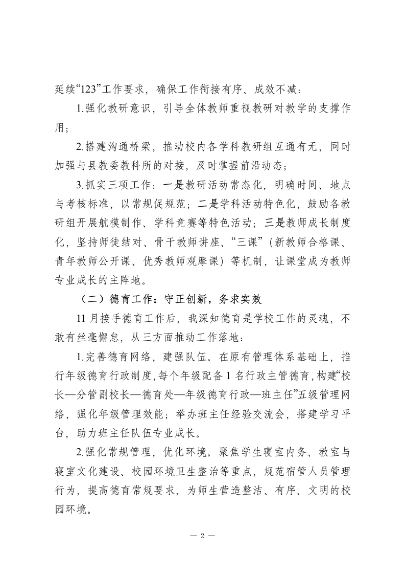 2025分管德育副校长述职报告:守责笃行,聚力育人尊敬的各位领导、老师们:大家好!时光荏苒,2025年已近尾声。这一年,是学校稳步发展、锐意进取的一年,也是我个人角色调整、深耕实干的一年。因学校领导班子调整,我告别了分管三年的教研工作,转而接管德育工作。无论岗位如何变化,我始终坚信,唯有找准定位、真抓实干,才能不负信任与重托。现将全年任职情况总结汇报如下,请大家评议、指正。一、找准定位,筑牢履职根基身为副校长,我始终坚守“不越位、不缺位、不错位”的原则,明确自身三重角色:作为校长的助手,精准把握学校发展思路,主动调研、积极思考,为校长决策提供建设性意见;作为中层的向导,针对具体工作提供可操作的指导建议,帮中层干部减轻压力、提高效率;作为教师的伙伴,倾听大家的工作困惑,肯定工作成绩,尽力协调解决实际困难,凝聚干事合力。二、真抓实干,深耕分管工作(一)教研工作:善始善终,稳扎稳打交接教研工作前,我始终秉持“质量立校、教研兴校”理念,-1