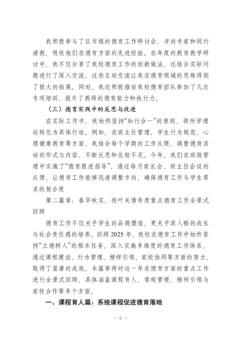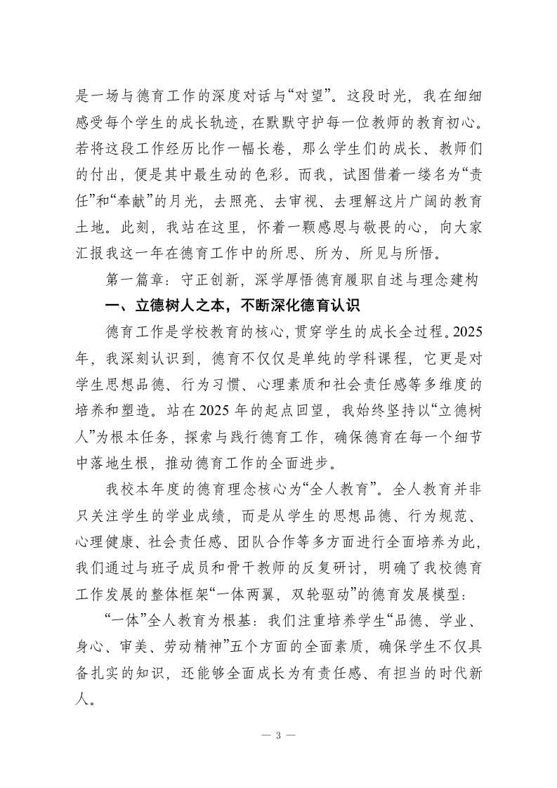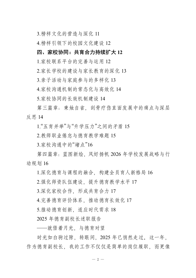 2025年度德育副校长述职报告就借着月光,与德育对望目录第一篇章:守正创新,深学厚悟德育履职自述与理念建构3一、立德树人之本,不断深化德育认识3二、深学修德,笃行致远4(一)持续深化德育专业学习4(二)积极参与德育工作实践与研讨5(三)德育实践中的反思与改进5第二篇章:春华秋实,枝叶关情年度重点德育工作全景式回顾5一、课程育人篇:系统课程促进德育落地61.德育课程体系的优化与实施62.德育课程渗透到各学科课堂73.实践育人课程的深化与拓展7二、常规育人篇:精准抓细日常行为规范81.一日行为规范的系统化管理82.红领巾监督岗与班级自我管理83.常规行为检查与家校反馈机制94.行为规范的长效化与创新9三、榜样育人:正向典型引领全校风尚91.榜样评选与宣传常态化102.榜样事迹的传播与价值引领10—1