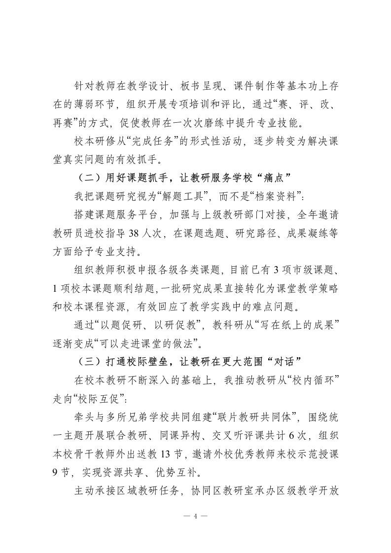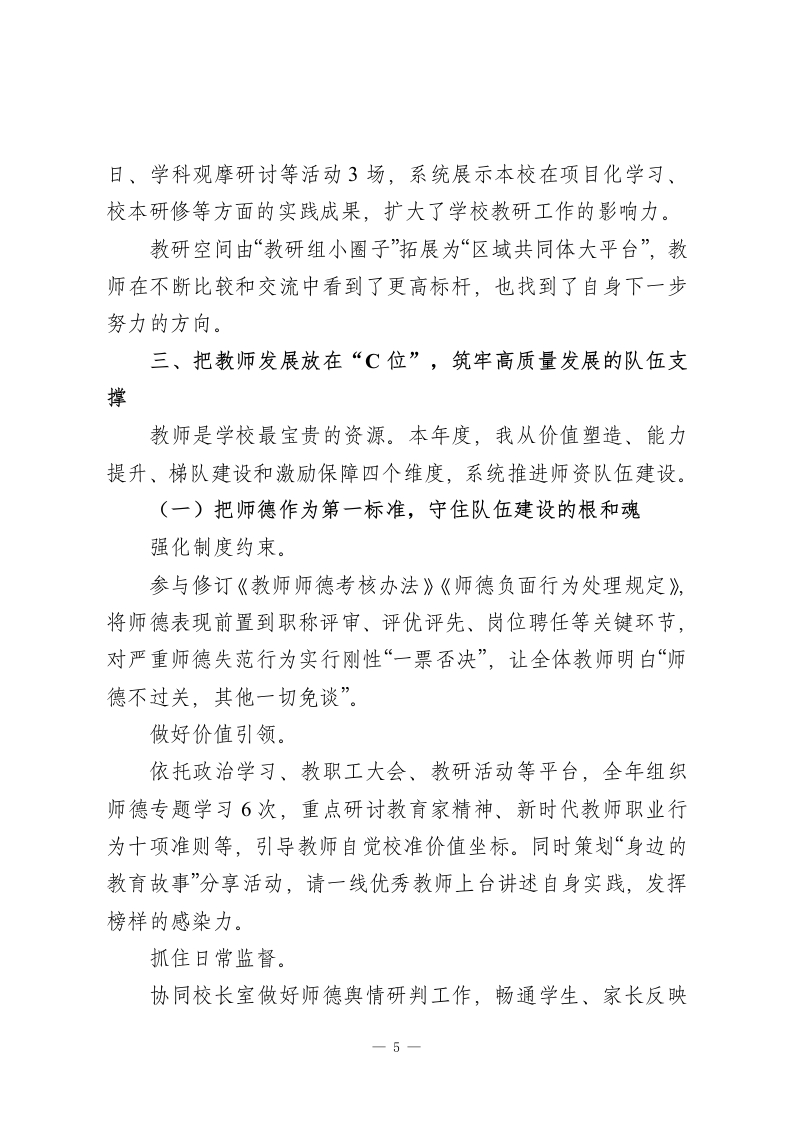 2025年度教学副校长工作汇报尊敬的各位领导、各位同事:2025年,是教育高质量发展系统深化、全面提速的一年,也是学校聚焦核心素养、推进课堂变革由“形变”走向“质变”的关键一年。在上级教育行政部门的正确领导下,在学校党政班子的通力配合和全体教职员工的大力支持下,我始终把“立德树人”作为一切工作的原点和归宿,以教学改革为牵引,以提高育人质量为主线,统筹推进教学管理、教科研与教师队伍建设等分管工作。这一年,我尽量把时间和精力更多地放在课堂、教研组和教师队伍之中,边实践、边研究、边总结,推动教学工作由“规范达标”迈向“内涵提升”。现将本年度履职情况作以汇报,恳请各位领导和同事批评指正。一、抓牢教学管理“主抓手”,夯实学校发展的质量底座我始终把教学管理视为学校运行的“中枢系统”,围绕“规范坚实、过程可控、质量可感”三个关键词,推动管理从粗线条走向精细化。(一)以新课标为牵引,推动课堂形态更新紧扣新课程标准和核心素养要求,我重点围绕“思维型课堂”和跨学科项目学习两条主线组织教师开展实践探索:组织教师系统研读新课标,结合学科特点明确本学科“培养什么样的核心素养、通过什么样的课堂实现”的路线图,引导教1