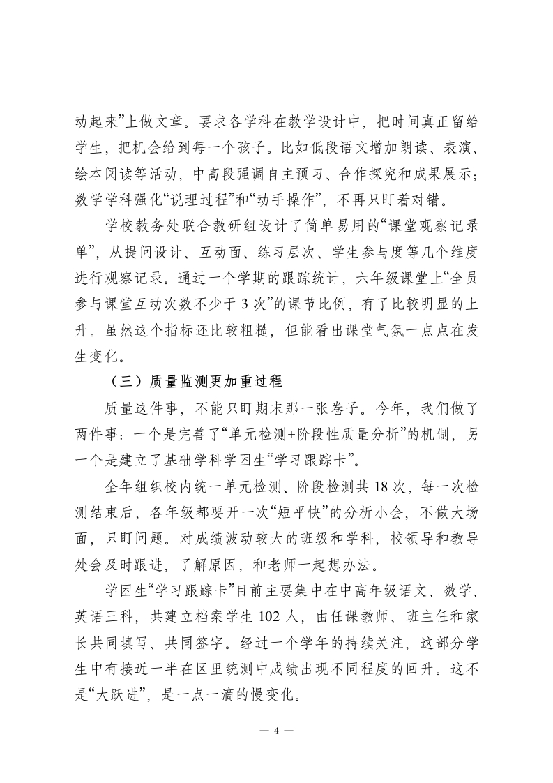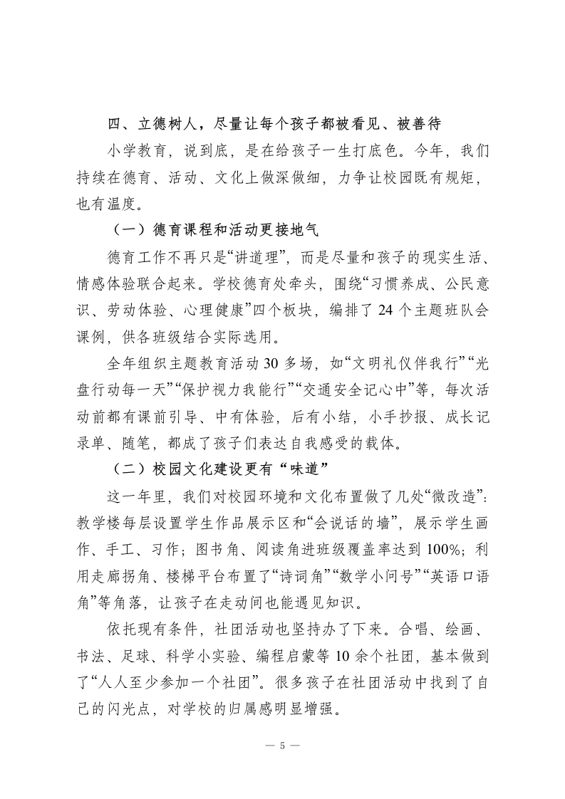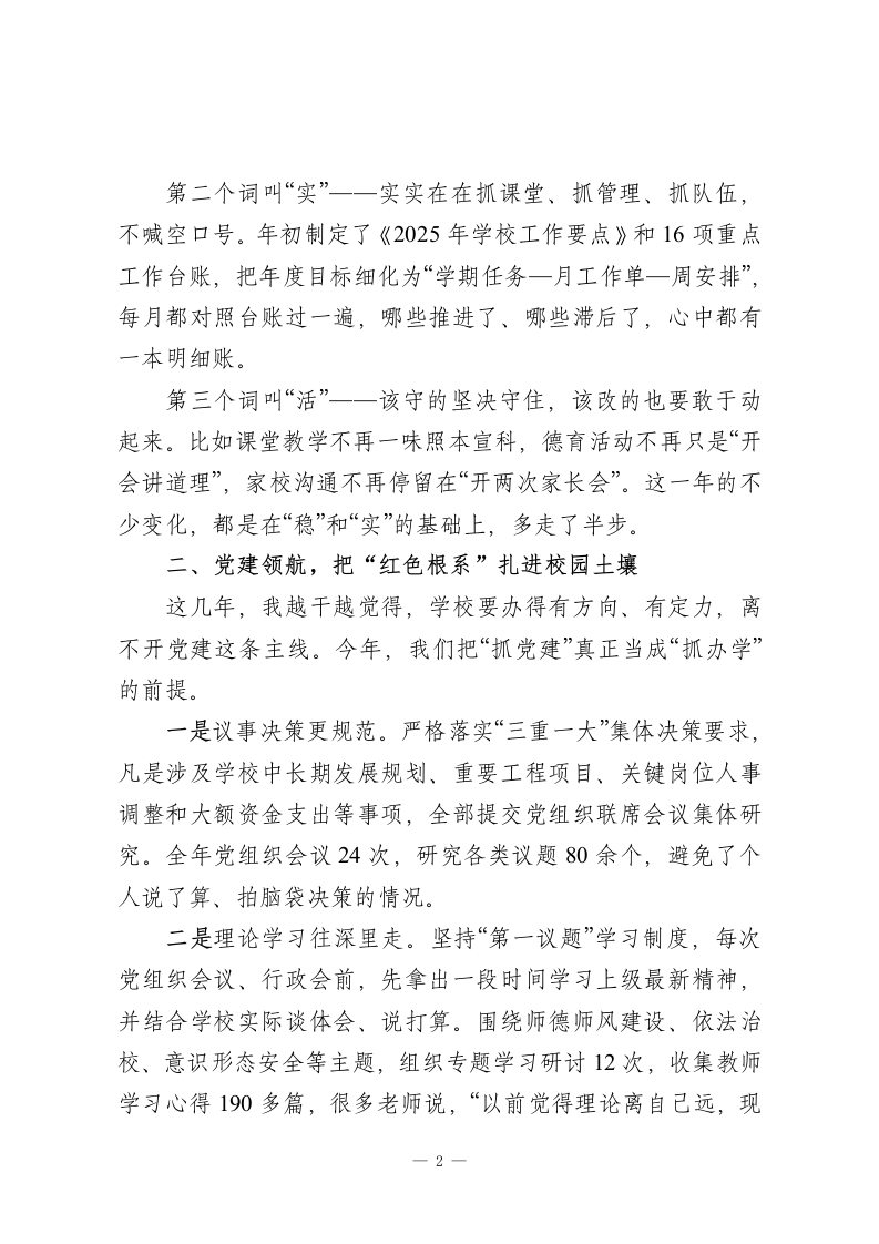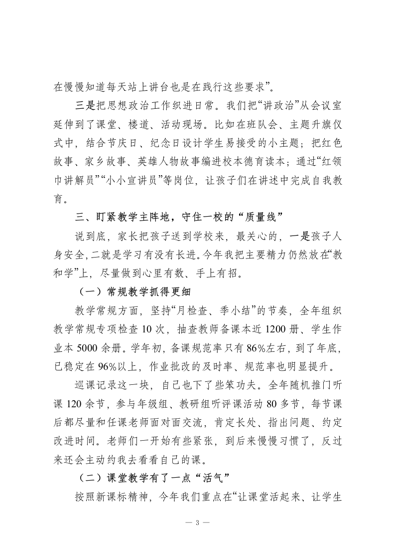 2025年度小学校长述职暨全面工作汇报:守住一校烟火气,办好家门口的优质小学!尊敬的各位领导、各位同事:时间过得真快,眨眼又到岁末。回头看2025年,这一年,对我们这样一所普通小学来说,真的不轻松:新课标进一步落地,“双减”进入深水区,家长对“有质量、负担又不能重”的期望一点没降。作为校长,我每天心里都清楚:学校办得怎么样,最终是要靠一件件具体的小事来见真章的。在上级教育部门的指导下,依托学校党组织的坚强领导,依靠全体教职员工的团结拼搏,我始终围着“立德树人”这个根,把眼睛盯在课堂,把心用在师生身上,把力气花在制度优化和细节落实上。一年来,学校各项工作总体平稳、基础更加扎实,孩子们在一点点长高,老师们在一步步成长。我把自已这一年的履职情况,作一个较为全面的汇报,请各位多批评、多提醒。一、理清办学思路,让学校发展始终不“跑偏”坦白讲,一所学校办得怎么样,先要想明白“往哪儿去、怎么走”。这一年,我始终围着三个词打转:稳、实、活。第一个词叫“稳”一一稳住办学方向、稳住安全底线、稳住质量红线。所有重大事项,都坚持走集体决策的程序,全年召开校务会议、行政碰头会共计46次,讨论学校发展规划、重大项目推进、重要经费使用等议题70多项,做到心里有数、脚下不乱。一1