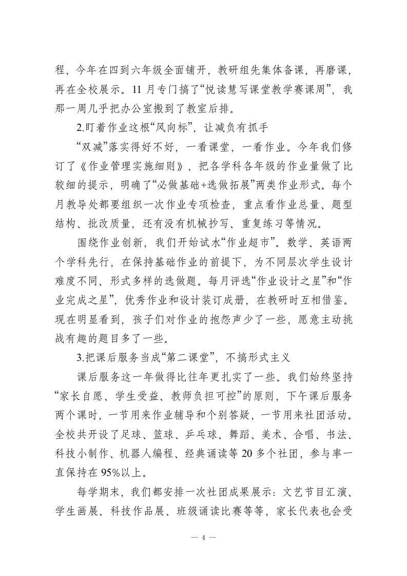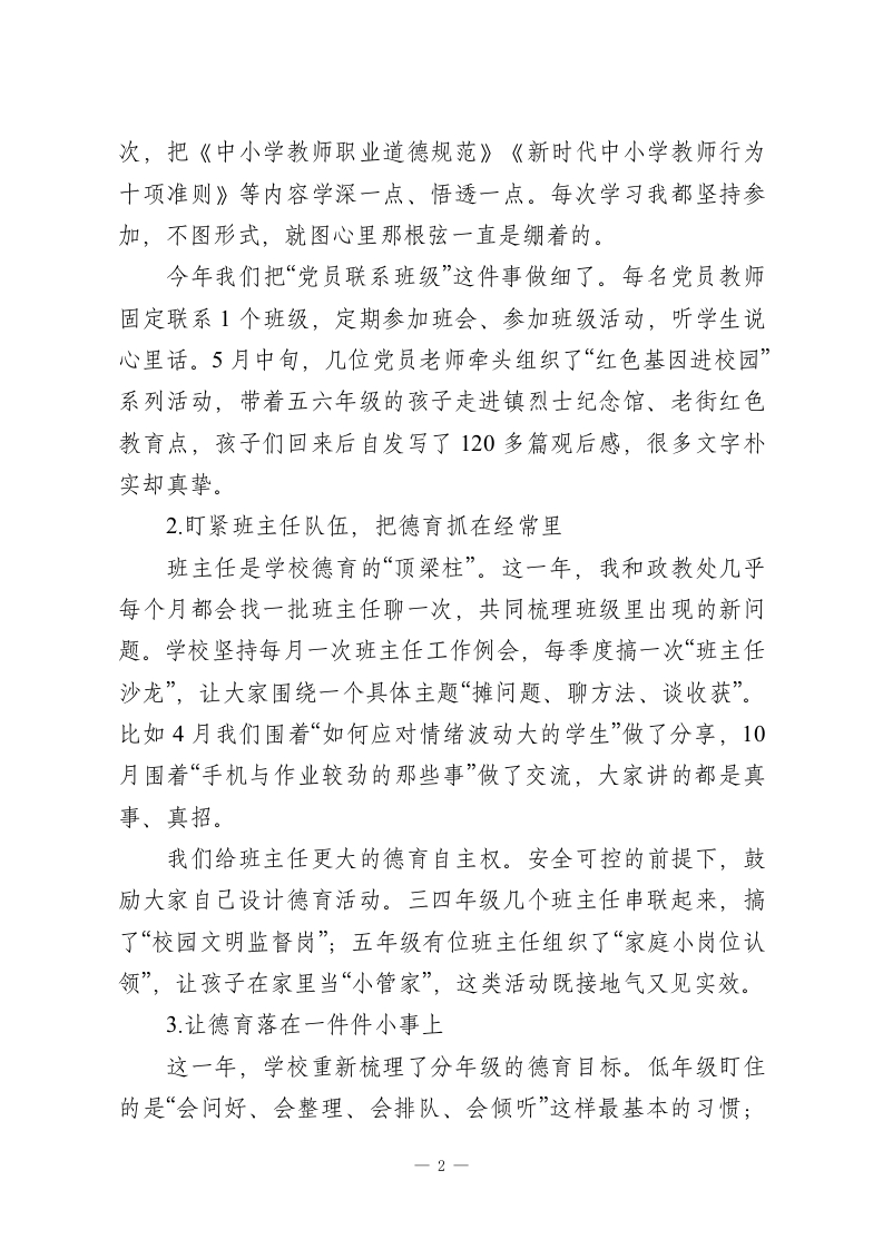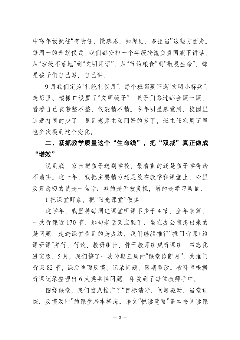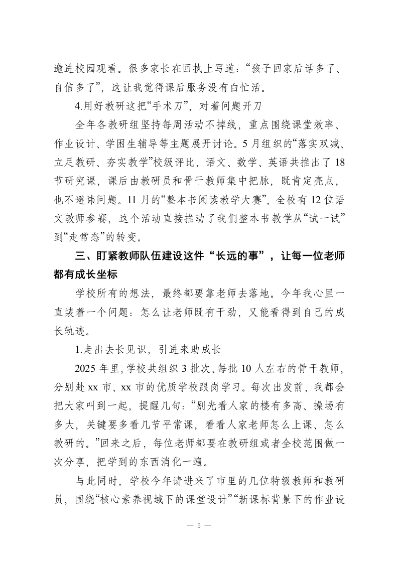 2025年度校长述职报告:守正中求变,用心办好这所“小而美”的学校!尊敬的各位领导、各位老师:大家好!转眼又到岁末盘点的时候,这一年,对我来说,是奔波劳碌的一年,也是心里比较踏实的一年。每天早上七点多站在校门口,看着孩子们一声声“校长好”,晚上九点多从校园最后一盏灯下经过,心里总会提醒自己一句:这所学校托付给了我们,办好办坏都不是小事。2025年,在上级教育主管部门的关怀指导下,在全体教职员工的共同努力下,我们紧紧围绕着“立德树人、质量立校、文化兴校"”这几条主线做文章,把安全工作抓得更紧一些,把课堂教学盯得更细一些,把教师队伍带得更实一些。全年校园没有发生一起较大安全责任事故,教育教学质量总体稳中有进,家长满意度问卷中“基本满意”和“满意”的比例达到96%。下面我就这一年的履职情况和学校工作,从几方面做个实事求是的汇报,有不妥的地方,请各位领导、老师多多指正。一、扛牢立德树人主责,让每一个孩子都有被看见的机会这学年,我一直盯着一件事不放,那就是“人”这两个字。学校再热闹,最后还是要看孩子有没有变得更有责任感、更懂感恩、更守规则。1.党建引路,把价值方向立稳学校党支部全年共开展集中学习18次,主题党日活动111