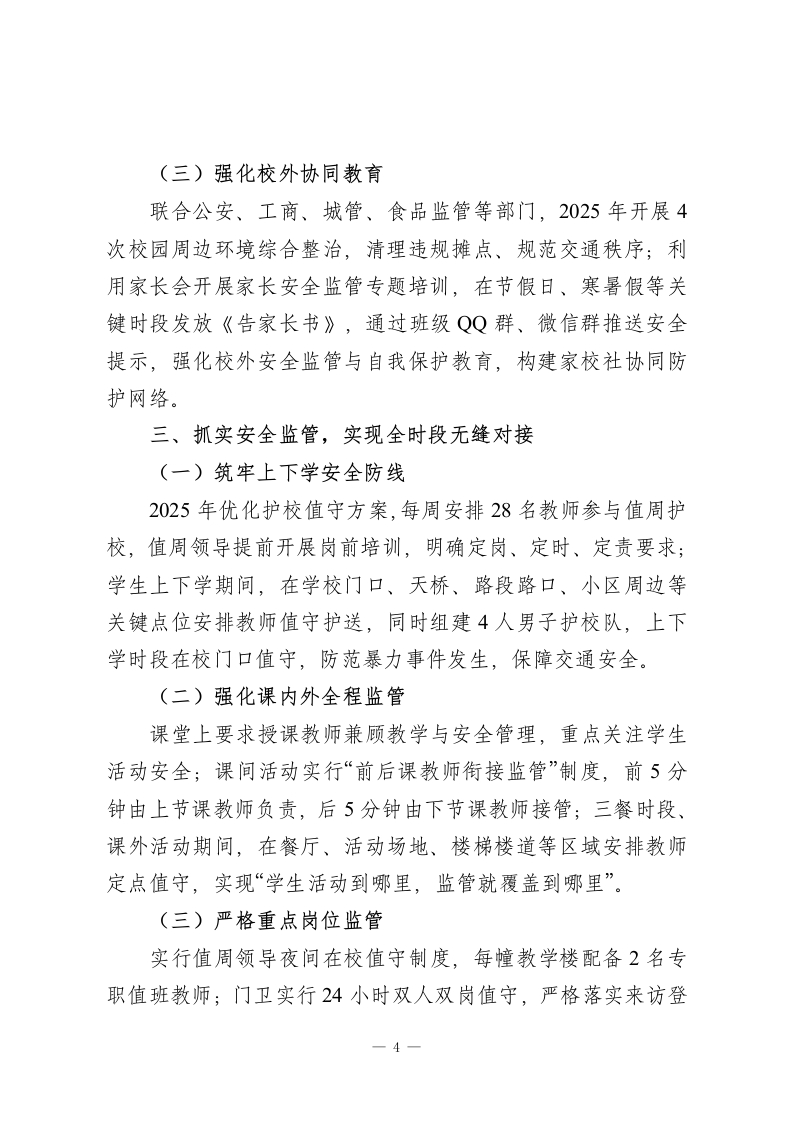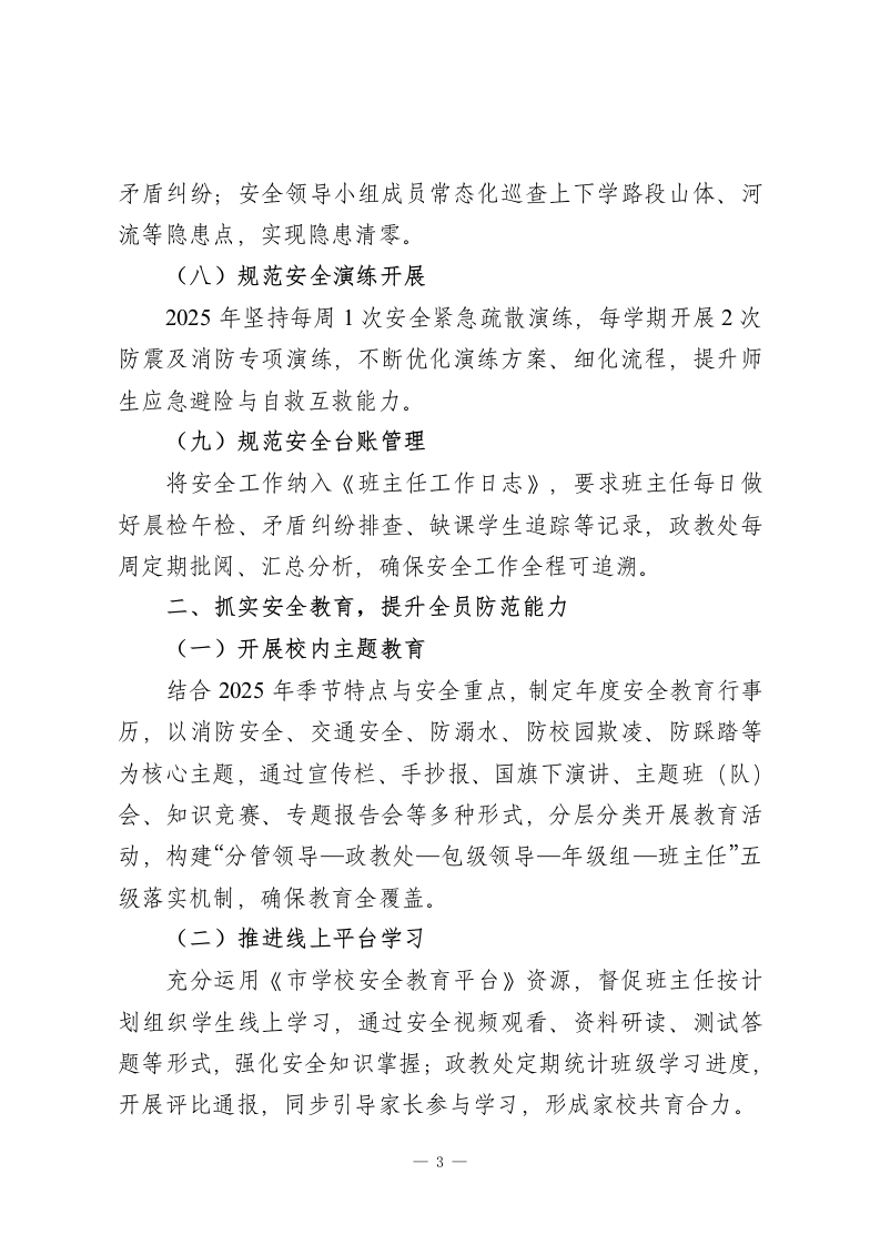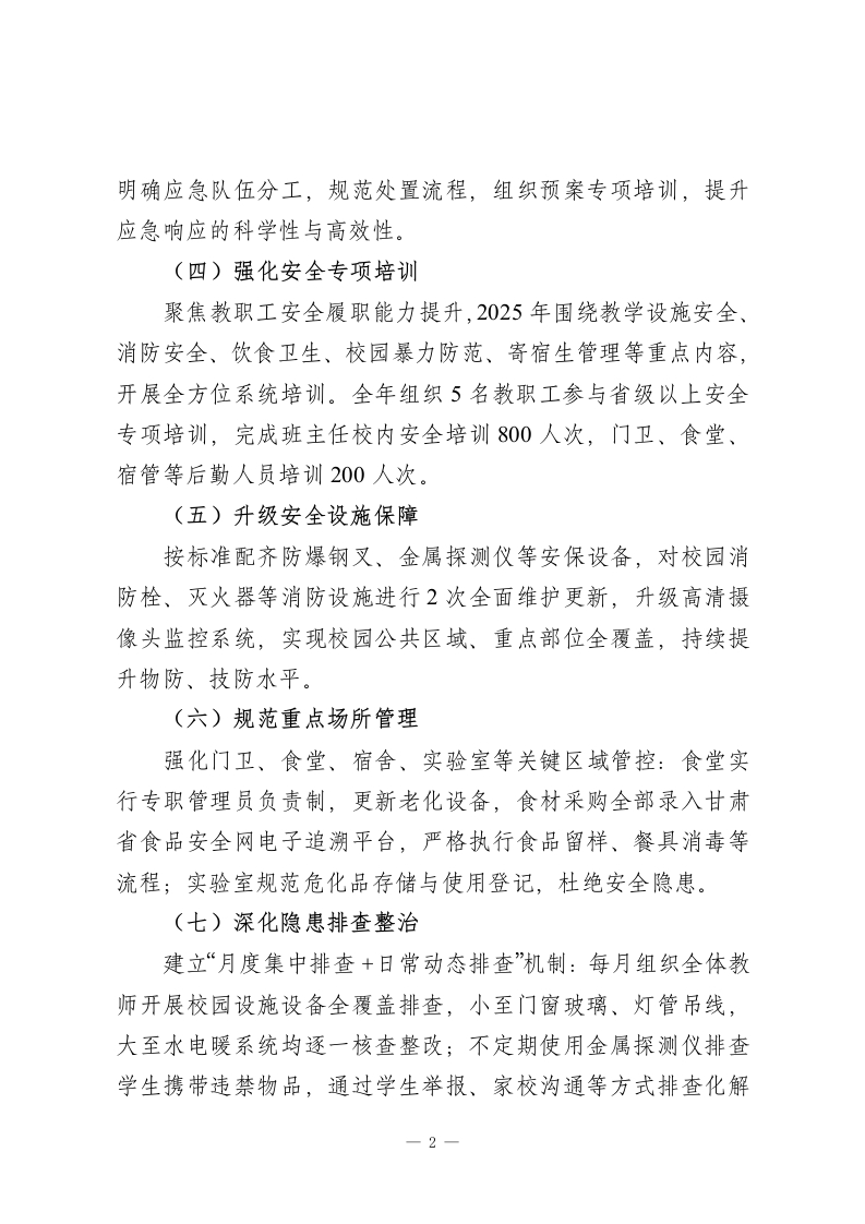 2025年度学校安全工作总结2025年,学校始终坚守安全底线,将安全工作作为各项工作的重中之重,纳入常规核心日程。本年度聚焦安全预防、安全教育、安全监管三大关键环节,持续强化全校师生员工的安全防范意识与能力,全面提升校园安全管理规范化水平。现将2025年学校安全工作总结如下:一、抓实安全预防,筑牢全方位防护网络(一)完善安全制度体系依据上级部门最新工作要求及学校实际,2025年进一步修订完善了教室、实验室、食堂、宿舍等重点场所设备设施隐患排查制度,以及食品卫生、交通安全、门卫管理、学生请假登记等专项制度,形成覆盖全场景的安全管理规范,确保各项工作有章可循、有规可依。(二)压实层级安全责任构建“全员参与、全域覆盖”的责任体系,与校内安全相关岗位人员层层签订《2025年度安全目标责任书》,明确岗位职责与工作标准,实现“层层设岗、岗岗有人、人人有责”,确保安全检查及时到位、隐患整改闭环落实,全力保障师生人身及学校财产安全。(三)健全应急处置预案结合2025年应急管理新形势,修订完善突发事件、恶劣天气、防汛防火、防震防踩踏、外出活动等各类应急处置预案,1