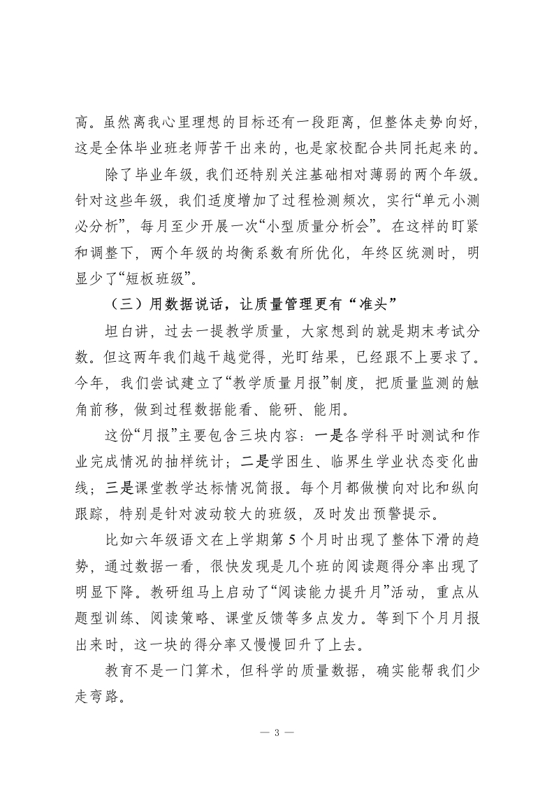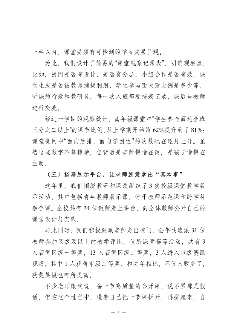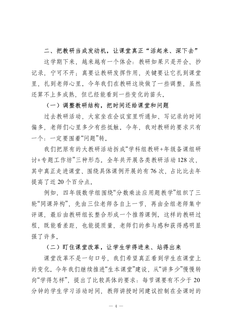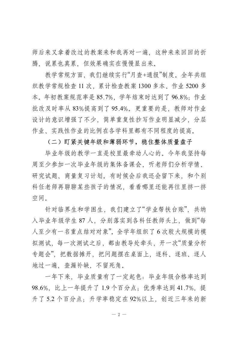 2025年教学副校长年度述职报告:守住课堂底色,拓宽成长路径!2025年,对我们学校来说,是教学工作压力不小、步子却迈得比较实的一年。新课标落得更细了,“双减”到了深水区,家长、社会对学校教学质量的关注度一直在往上走。作为分管教学的副校长,这一年,说不紧张是不可能的。这一年里,我始终把“向课堂要质量、向教研要成长、向管理要效益”这三句话牢牢记在心里,当作自己抓教学工作的主线。校长把教学这块交到我手上,我心里始终绷着一根弦:不能只开会、只发文件,关键还是要沉到一线,盯住课堂、盯住老师、盯住质量。下面,就这一年的履职情况,做一个汇报。一、紧扣教学主责主业,守住质量这条“生命线”(一)人往课堂里走,常规抓在日常里这学年下来,我把相当一部分时间放在课堂上。全年累计听评课152节,其中随机推门课97节,约谈式预约课55节,基本覆盖了各学段、各学科,既有骨干教师的“标杆课”,也有青年教师的“磨合课”。听课,我自己给自己定了三个要求:一是课前必须看备课本,心里有个底;二是课中既看教师教,也看学生学,必要时顺便翻一翻学生的笔记和作业;三是课后当天必须和任课老师面对面交流不少于15分钟,肯定亮点、指出问题、提出改进方向。今年和一线教师课后交流记录一共留下了138份,有的老1