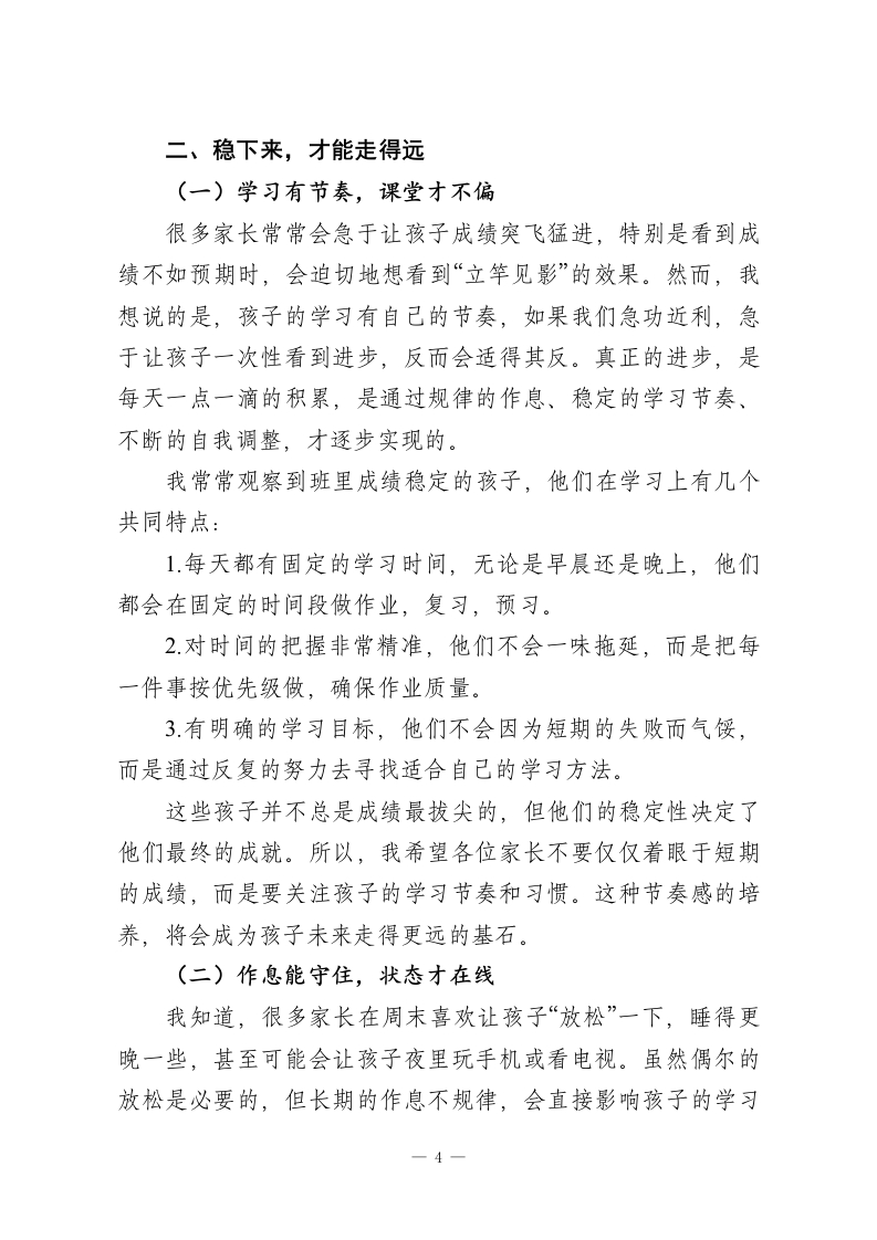 2025年秋季期中家长会发言稿一一不急一时,不误一程首先,非常感谢大家在百忙之中抽出时间,来到今天的家长会。孩子的成长离不开你们的支持与陪伴,而作为老师,我也一直在思考:如何更好地陪伴孩子们,帮助他们在这段人生旅程中走得更远。今天,我想用《疯狂动物城2》中的一段经典台词,来和大家分享我的想法:“在动物城,每一个动物都有无限的可能。”这句话让我深刻感受到,每一个孩子,都拥有无限的潜力和可能性。就像电影里的角色,不论是兔子朱迪还是狐狸尼克,他们都不被出生和外界的期待所束缚,反而通过努力和勇气,打破了固有的框架,找到了属于自己的道路。这句话同样适用于我们的孩子们。尽管每个孩子的起点不同,性格各异,成绩也有高低,但他们每个人,都拥有通过自己的努力,探索世界、追求梦想、超越自我的无限可能。今天的家长会,我们不只是讨论期中考试的成绩,更是在探讨如何挖掘孩子们的潜力,如何帮助他们发现自己的优势和兴趣,如何在未来的道路上,为他们搭建一个更广阔、更有可能的舞台。期中考试,只是一个小小的里程碑,它的意义不在于分数,而在于我们如何从中汲取经验,如何继续在孩子的成长路上,播下希望与勇气的种子。再次感谢各位家长的支持,接下来的时间里,让我们一起聊一聊,如何与孩子一起,走得更远,飞得更高。-1