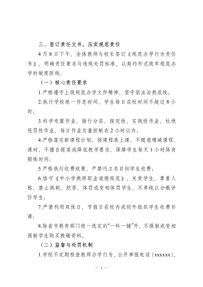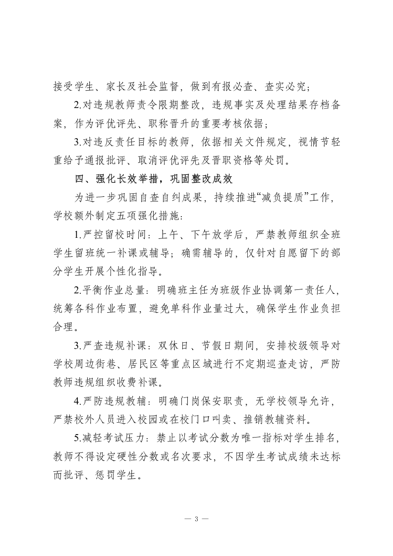 2025年学校规范办学行为自查自纠报告:规范办学守初心,减负提质促成长为深入贯彻落实省、市、区关于加强学校管理的相关文件精神,切实规范办学行为、减轻学生过重课业负担,推进素质教育高质量发展,我校于2025年全面开展规范办学行为自查自纠活动。现将具体情况报告如下:一、深化理论学习,统一思想认识(一)领导班子带头学学校领导班子率先垂范,专题学习规范办学行为、减轻学生负担、推进素质教育的相关文件与通知精神,统一思想、提高站位,明确自查自纠工作的重要性与紧迫性。(二)全体教师集中学通过教师例会、班主任专题会议,组织全体教师深入学习上级政策要求,从依法治校、依法执教的高度,深刻认识规范办学行为的必要性,引导教师将“减负提质”理念融入日常教育教学。二、开展问卷调查,精准掌握实情4月8日下午,教导处组织人员深入各班级,每个班级随机抽取10名学生,发放“规范办学行为,减轻学生负担”调查问卷。学生实事求是填写后,教导处及时回收问卷,进行系统分析与汇总,梳理出师生反映的突出问题,并第一时间向相关教师反馈,为针对性改进工作提供数据支撑。1