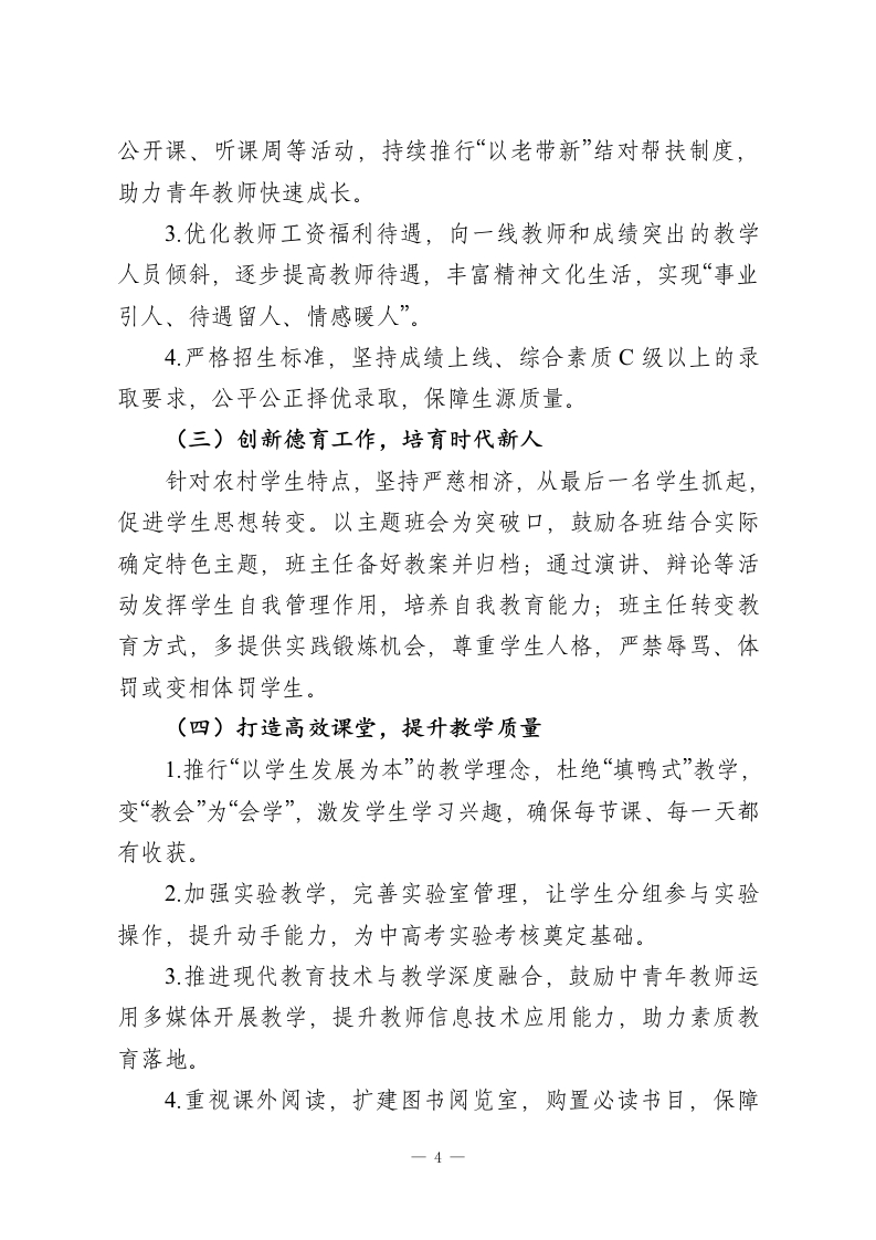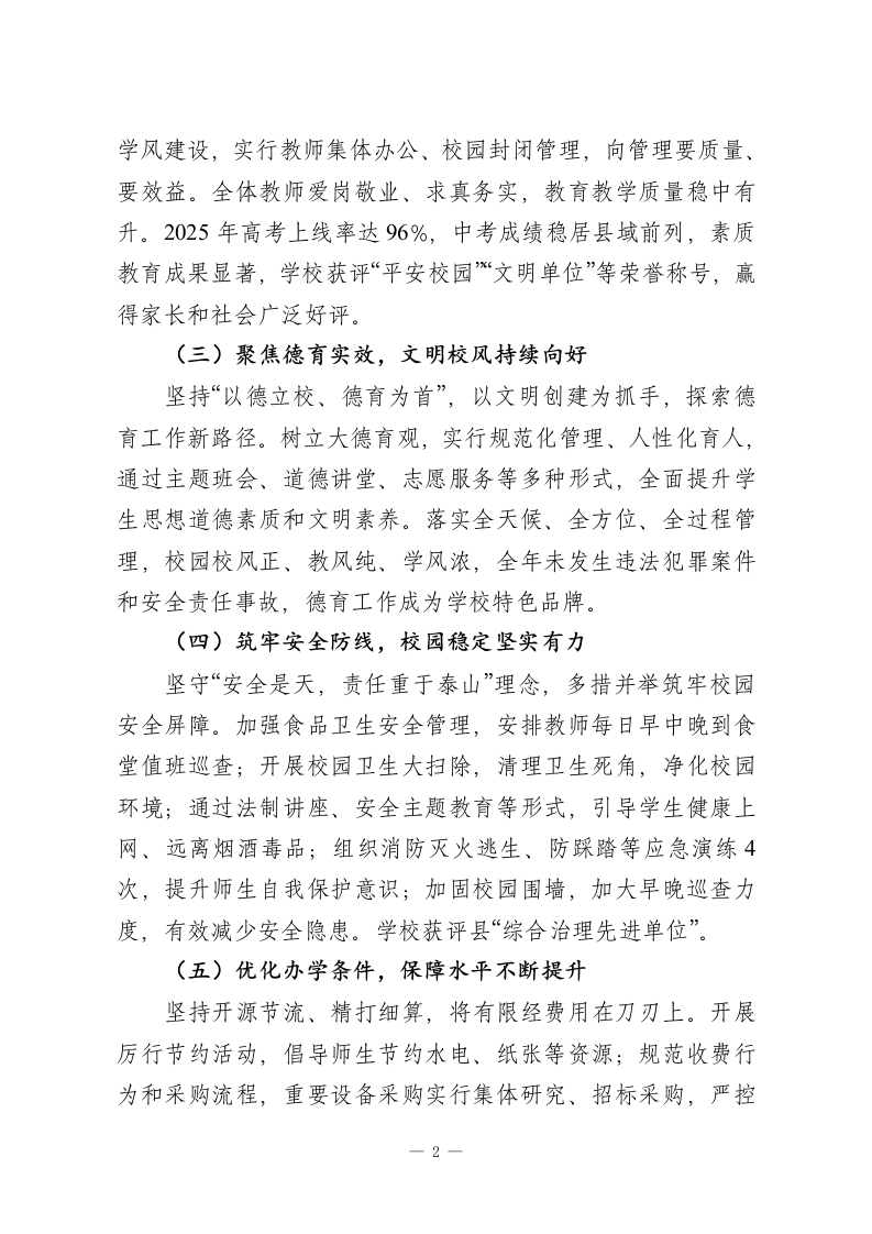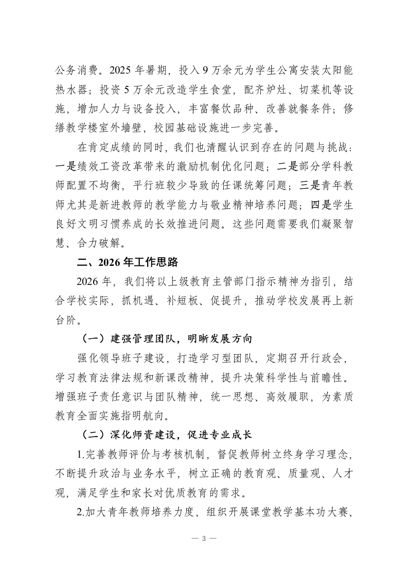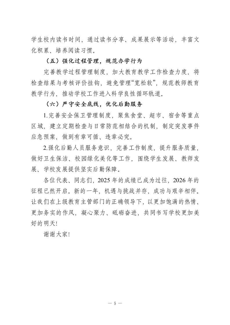 2025年终教职工代表大会校长工作报告:凝心聚力谋发展,砥砺奋进启新程各位代表、同志们:大家好!在全校上下凝心聚力、共谋发展的关键时期,我校2025年终教职工代表大会隆重召开。这是全校教职员工民主政治生活中的一件大事,是学校广开言路、民主办学、构建和谐校园的具体体现。在此,我代表学校向大会的胜利召开表示热烈的祝贺!向各位代表及全体教职员工,致以衷心的感谢和诚挚的问候!下面,我受大会委托作工作报告,请各位代表审议。一、2025年工作回顾2025年,在县教育局和中心学校的正确领导下,全校教职工同心同德、开拓进取,学校各项工作稳步推进、成效显著,在高质量发展道路上迈出了坚实步伐。(一)强化队伍建设,教师素养稳步提升秉持“科研兴教、质量强校”理念,完善教研教改激励机制,常态化开展校本研修、常规听评课活动。大力支持教师参加各级各类继续教育培训和信息技术培训,全年累计派出80余人次教师外出学习,助力教师更新教育理念、提升教学技能。教师队伍整体素质持续提高,在各级教学竞赛中屡获佳绩,12名教师获评县级及以上优秀教师、教学能手。(二)深化教学管理,教学质量再创新高始终把教学作为学校中心工作,强化教学常规管理和校风、1