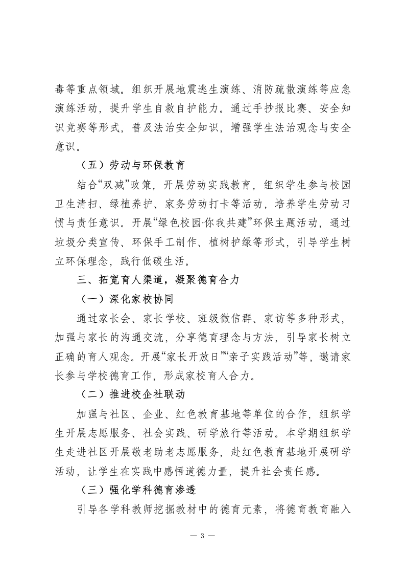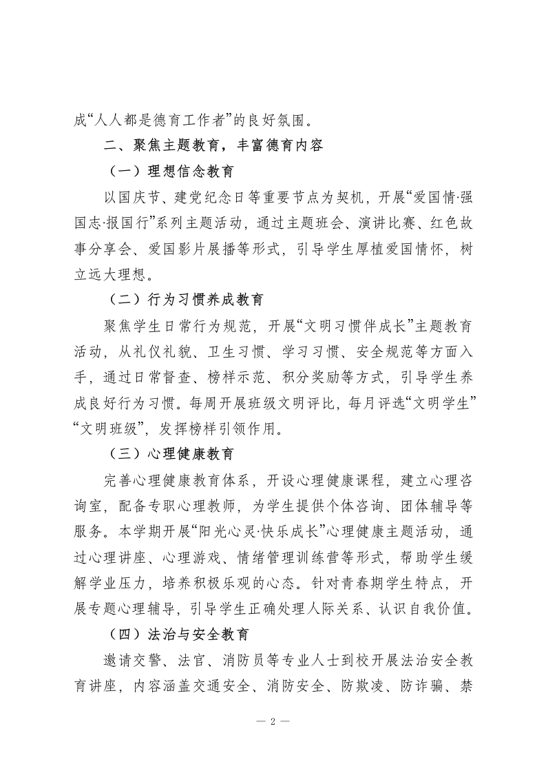 2025秋季第一学期德育工作总结本学期,我校德育工作紧紧围绕“立德树人”根本任务,以培育和践行社会主义核心价值观为核心,结合“双减”政策要求与学生身心发展特点,构建“全员、全程、全方位”育人体系,在上级教育部门指导、全体师生共同努力及家长支持配合下,各项工作扎实推进、成效显著。现将本学期德育工作情况总结如下:一、健全德育机制,筑牢育人根基(一)完善组织架构成立以校长为组长、分管副校长为副组长、德育处成员、班主任及学科教师为核心的德育工作领导小组,明确各级岗位职责,形成“校长统筹、德育处牵头、班主任为主力、学科教师协同、家长社会参与”的德育工作格局,确保德育工作有序开展。(二)细化德育计划结合学校发展规划与学生实际,制定《本学期德育工作计划》,明确本学期德育目标、重点任务、实施路径及评价标准。各班级、各教研组围绕学校整体计划,制定个性化德育实施方案,将德育要求融入日常教学与管理全过程。(三)强化制度保障修订完善《学生日常行为规范管理细则》《班级量化考核办法》《班主任工作评价方案》等制度,将德育工作成效与班级评优、教师绩效考核挂钩,激励教师主动参与德育工作,形1