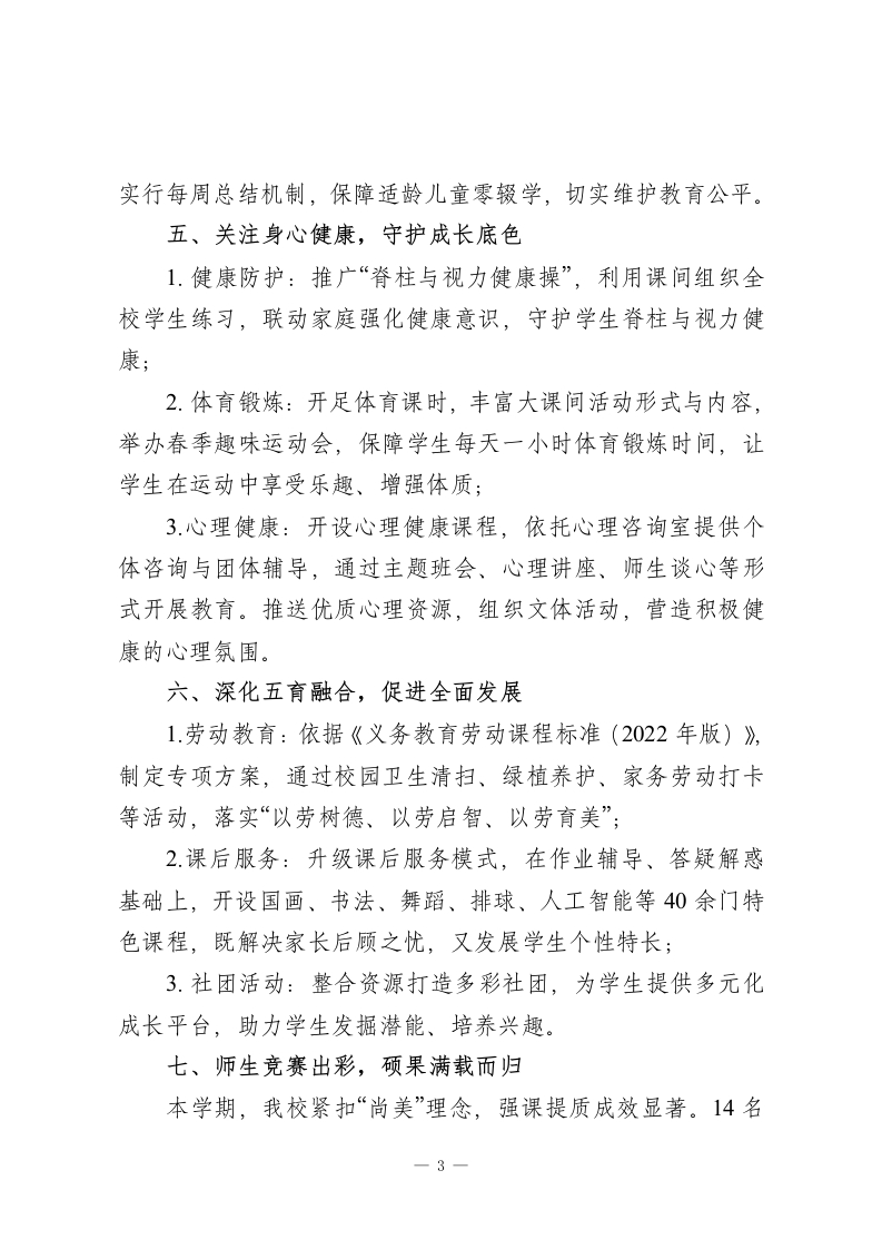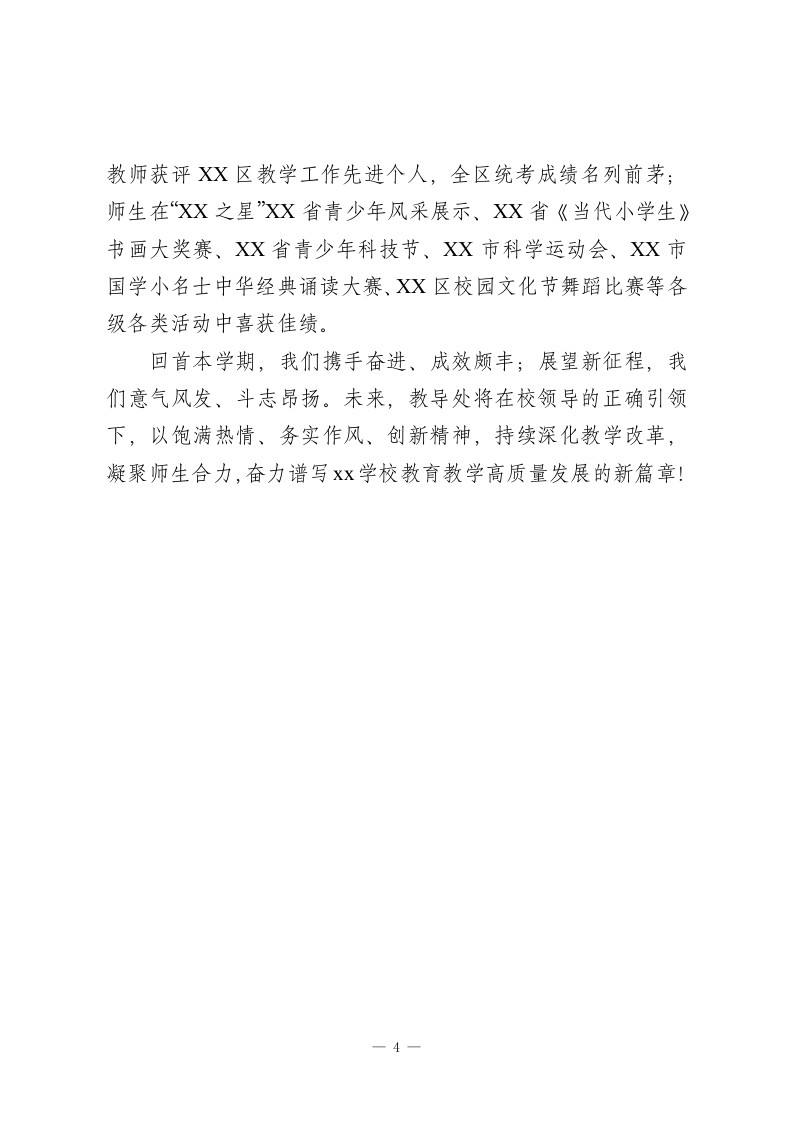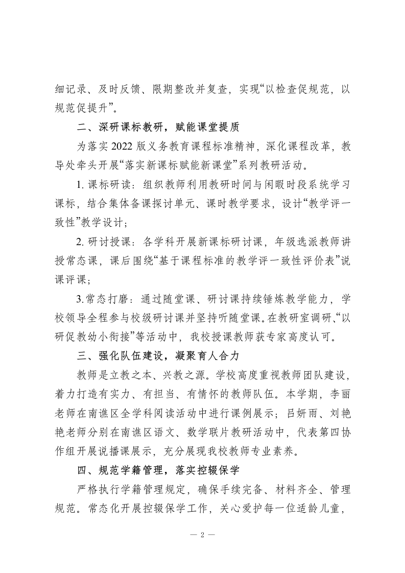 2025秋季第一学期小学教导处工作总结本学期,我校教导处紧紧围绕学年初既定的办学思路,科学统筹、扎实履职、大胆创新,充分发挥指导监督、整合推进的核心作用,严格落实“双减”政策与“五育并举”要求,向教学素质管理要质量,深化课堂教学改革,强化师资队伍建设,规范教学行为,推动学生德智体美劳全面发展。现将本学期工作总结如下:一、狠抓教学常规,筑牢质量根基学校严格执行《xx学校常规管理细则》,推行“听、看、谈、改”四步管理法,全程把关“备、教、批、辅、考”各环节,提升教学效率。1.精准备课:以新课标为指引,融合个人备课与集体备课优势,教师群策群力设计教学环节,确保教学设计贴合学情;2.推门听课:坚持教干包级部制度,教干下沉课堂一线,与教师共研问题、共商对策,规范课堂行为、提升教学质量;3.青蓝工程:发挥骨干教师“传帮带”作用,制定青年教师成长规划,通过示范课、达标课等活动,加速青年教师专业化成长;4.作业优化:围绕“科学分层、减负增效”开展专题研讨,实行级部与教导处双审核机制,每日在Xx教育云平台公示作业,杜绝无效作业;5.常规检查:每月按计划开展教案、作业等常规检查,详1