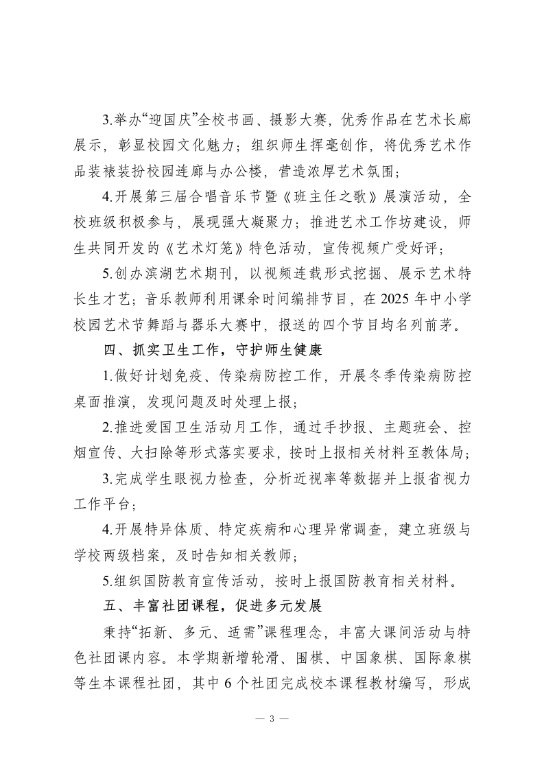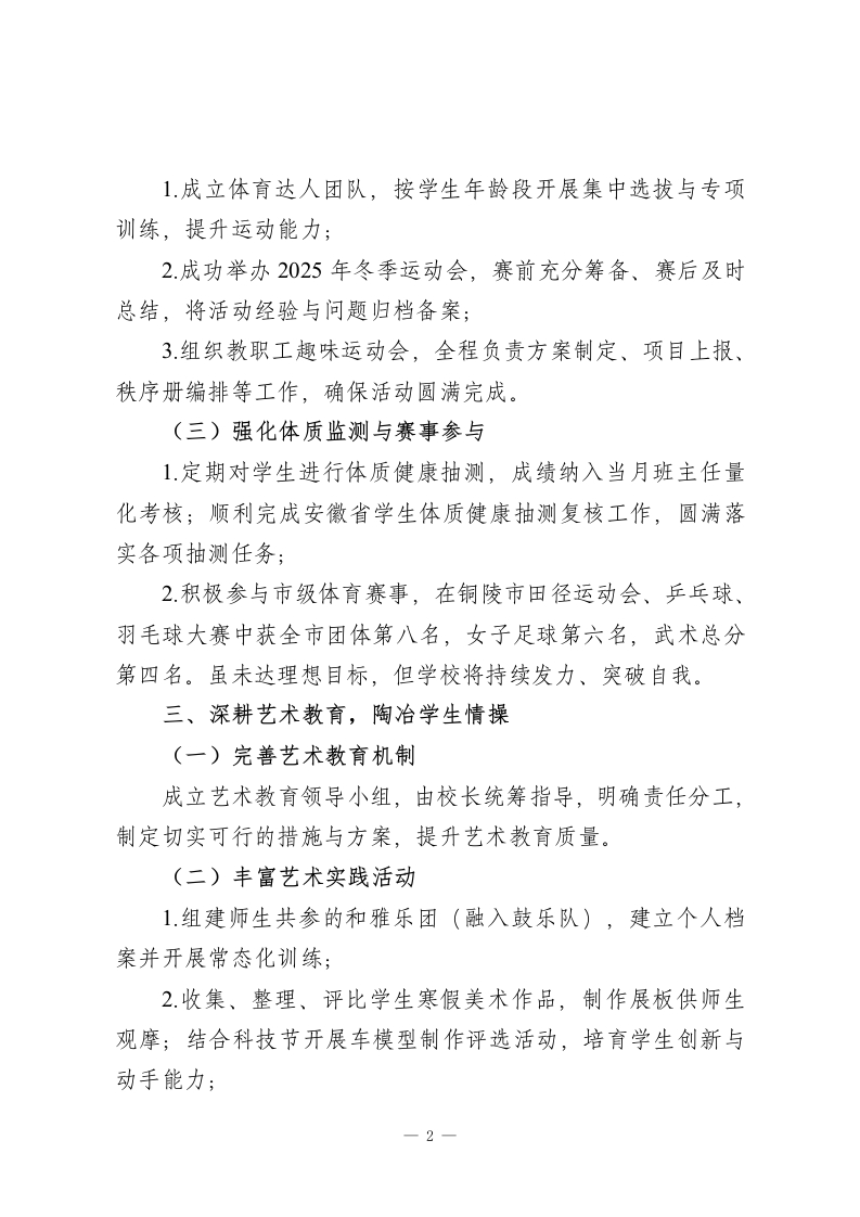 2025秋季第一学期小学体艺卫工作总结星海横流,岁月成碑,本学期已圆满落幕。本学期,学校体卫艺处在校领导的关心支持下,严格贯彻新版《体育艺术课程标准》,秉持“以人为本”理念,聚焦学生体质提升与艺术素养培育,扎实推进体育、卫生、艺术各项工作,逐步实现规范化、制度化发展。现将本学期工作总结如下:一、科学统筹管理,夯实工作基础(一)健全组织与制度建立健全体卫艺工作组织管理机构,明确分工、落实职责,完善各项规章制度,为教学工作有序开展提供保障。(二)明晰计划与教研1.开学初召开秋季体卫艺教学专项会议,以月历形式公示工作清单,传达学期计划,明确各岗位职责;2.音体美三学科围绕新课标培训内容与大单元教学开展集体备课,确定课程发展方向;定期组织评教议教活动,及时修正问题、提升教学质量。二、深化体育教学,增强学生体质(一)规范体育教学严格落实《学校体育工作条例》与国家课程标准,开齐开足体育课程,按教学大纲授课;全面推行大课间体育活动制度,规范组织学生做好两操。(二)丰富体育活动一1一