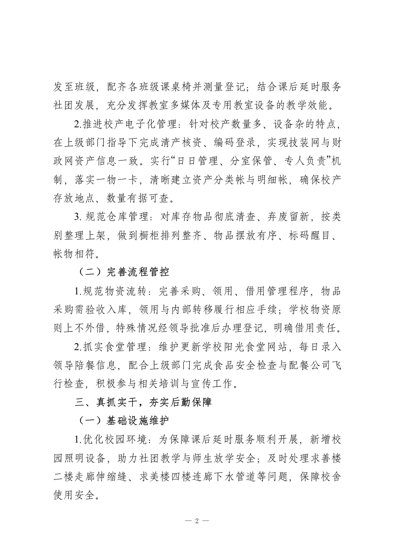 2025秋季第一学期学校总务工作总结本学期,总务处始终坚守“后勤服务教育教学”核心原则,秉持“速度、温度”服务宗旨,以“勤快、务实”的工作作风,凝心聚力做好各项后勤保障,为师生创造优美舒适的校园环境,确保学校整体工作有序运转与教育教学质量提升。现将本学期工作总结如下:一、强化服务理念,筑牢保障根基(一)凝聚团队合力后勤人员立足学校大局,秉持主人翁精神,相互协作、勇挑重担,形成团结奋进的工作氛围。以“眼勤、手勤、腿勤、嘴勤”为准则,深入校园排查隐患、补齐短板,认真记录总务工作日志与大事记,坚持遇事多请示、事后及时汇报。(二)提升服务效能实行校园每日巡视制度,专人检查水电、厕所等设施设备使用状况,做到问题早发现、早解决。针对故障报修、公物损坏、小型维修及办公用品申领等需求,推行“随喊随到、随报随修”机制,全力减少师生后顾之忧。同时,主动培养超前服务意识,周全规划服务内容与方式,为学校各项中心工作提供坚实保障。二、精细化管理,规范后勤运作(一)优化物资与装备管理1.助力教学开展:开学前提前完成全校一至六年级书本分-1