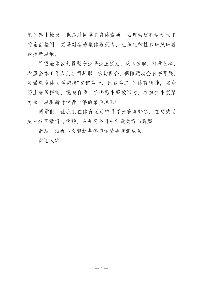 2025迎元旦新年冬季运动会活动校长讲话:燃动冬日,逐梦新年尊敬的老师们、亲爱的同学们:上午好!冬意渐浓,年味渐暖,新年的钟声即将敲响。今天,我们欢聚一堂,隆重举行迎新年冬季运动会。在这辞旧迎新的美好时刻,我谨代表学校,向一直关心支持学校发展的退休老教师们,致以最衷心的感谢和诚挚的新年祝福!向可爱的同学们,祝愿你们新的一年身体健康、快乐成长!向敬爱的老师们,祝愿你们工作顺遂、家庭幸福!给大家拜年啦!今年,是学校深耕细作、硕果盈枝的一年。我们顺利通过Xx区绿色学校验收,成功申报教育部相关规划课题,办学内涵持续提升。这一年,全校师生在各级各类竞赛中捷报频传:荣获Xx区班级演唱二等奖、X市剪纸比赛优秀组织奖、xx区第X届中小学生英语风采赛二等奖;王老师、张老师、吴老师分别斩获全国教学课竞赛一、二等奖,邹英老师获评X市德育工作先进个人,刘老师荣获xx区演讲比赛二等奖;毕业班统考及格率、优秀率稳居Xx区前茅。这一年,我们用奉献浇灌梦想,用激情书写精彩!荣誉属于过去,未来更需奋进,新的一年,让我们凝心聚力,续写学校发展的崭新篇章!老师们、同学们!体育运动是速度的较量、力量的角逐,更是激情的飞扬、意志的磨砺。一年一度的冬季运动会,既是对我校体育教学成1