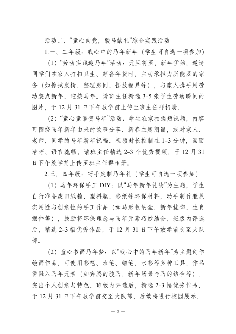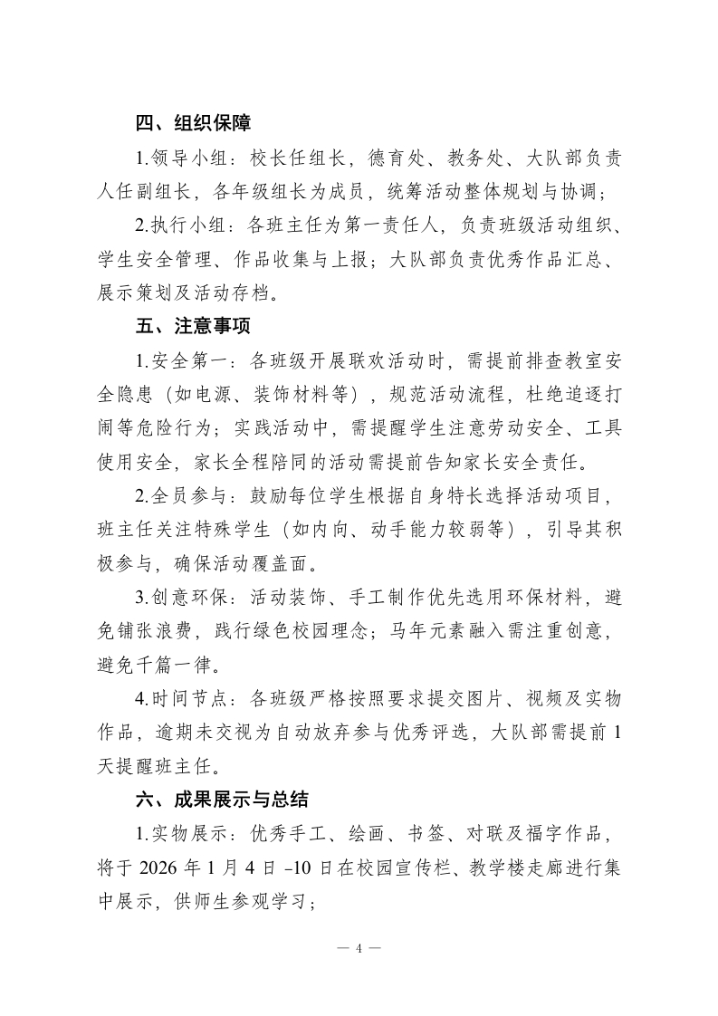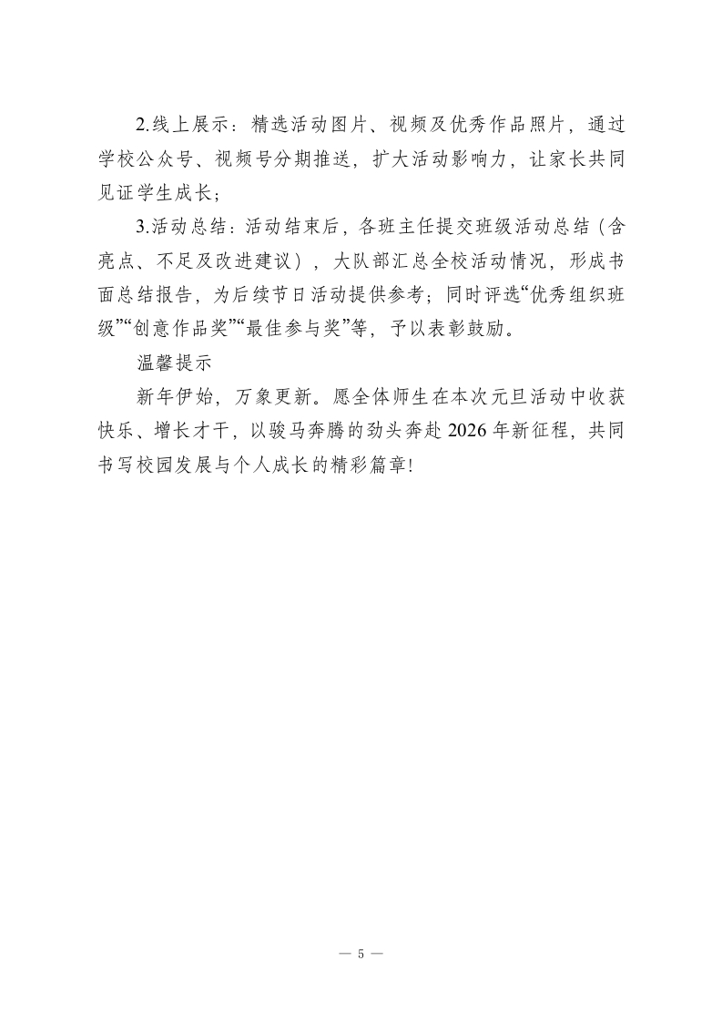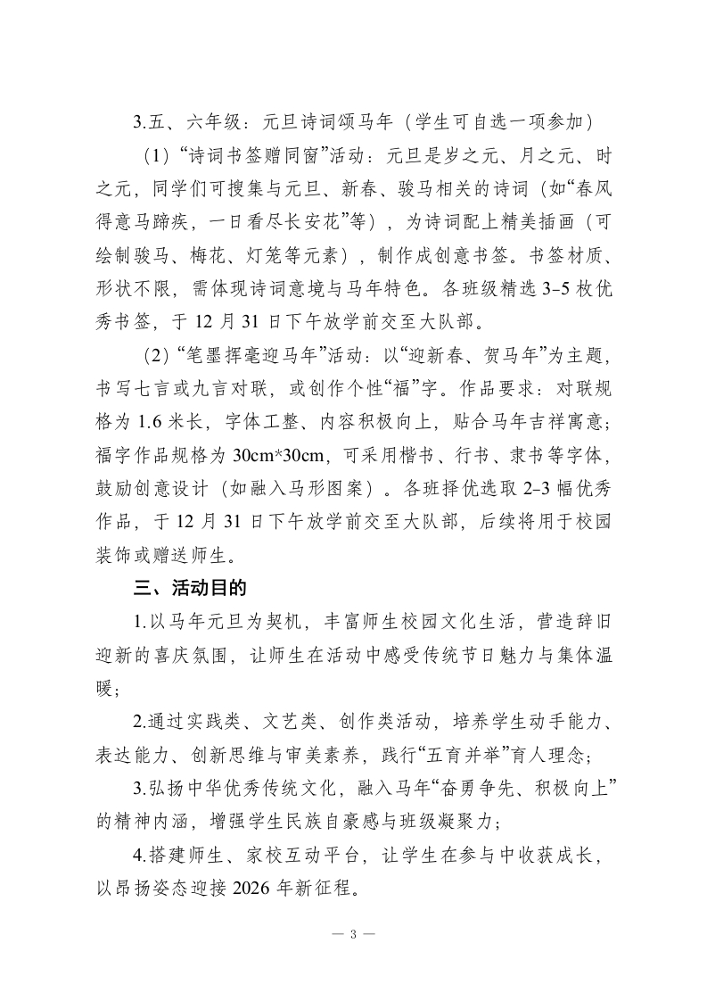 2026年(马年)学校庆元旦活动方案:骏马踏春启新程,多彩活动庆元旦春风化雨新时代,骏马奔腾踏征程。2026年新年的钟声即将敲响,值此辞旧迎新之际,为丰富我校师生学习文化生活,营造浓厚的元旦喜庆氛围,同时锻炼同学们的动手实践与综合素养,特开展“骏马踏春启新程多彩活动庆元旦”元旦主题活动,让师生在欢声笑语中迎接马年新春。一、活动主题“骏马踏春启新程多彩活动庆元旦”二、活动时间2025年12月28日至12月31日活动一、“骏马欢腾,逐梦新年”元旦联欢会参与对象:全体学生1活动内容:为进一步推进学校文艺活动蓬勃发展,丰富校园文化底蕴,活跃课余学习氛围,12月31日下午,各班级自行组织班级联欢活动。搭建展示自我风采、彰显青春活力的舞台,激发广大学生爱党、爱国、爱校、爱班的真挚情感,弘扬勤奋学习、奋勇争先的进取精神,让每一位学生在精彩的节目中尽情欢乐,以饱满的热情迎接2026马年新年。2.活动要求:各班级自行创意装扮教室,融入马年元素(如骏马贴纸、剪纸、灯笼等),营造浓厚新年氛围;活动结束后,各班级精选3-5张活动过程精彩图片,上传至班主任群相册存档。