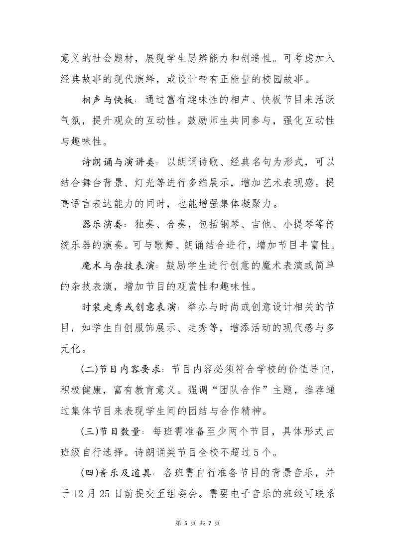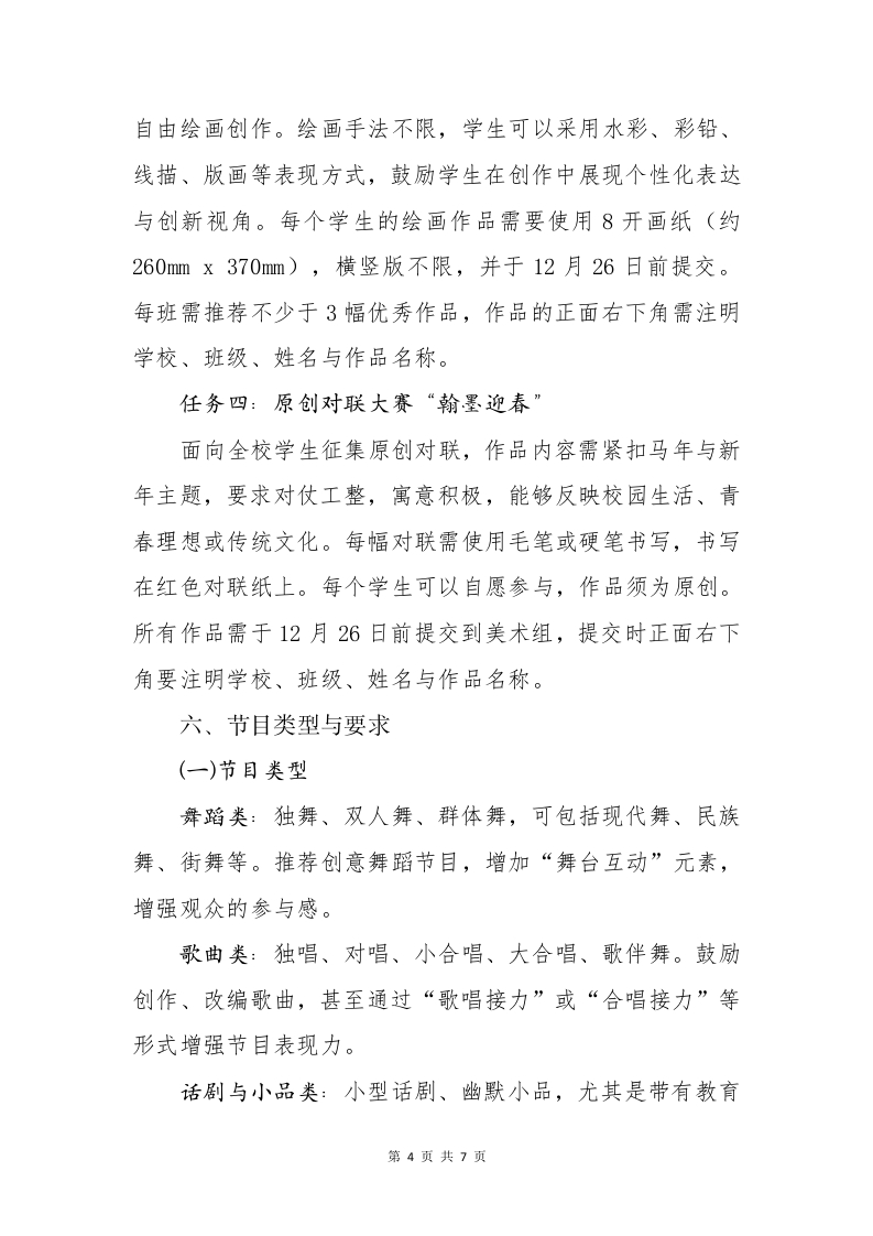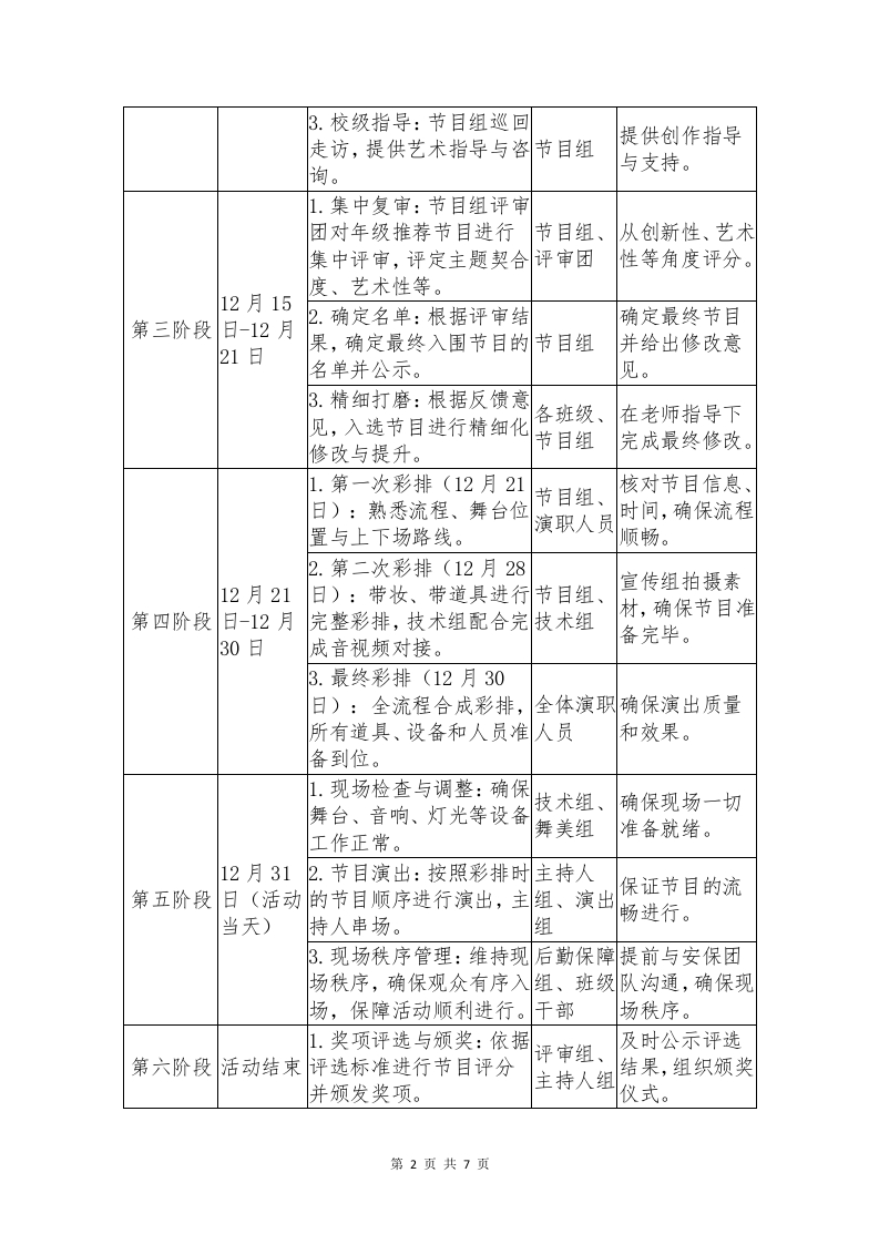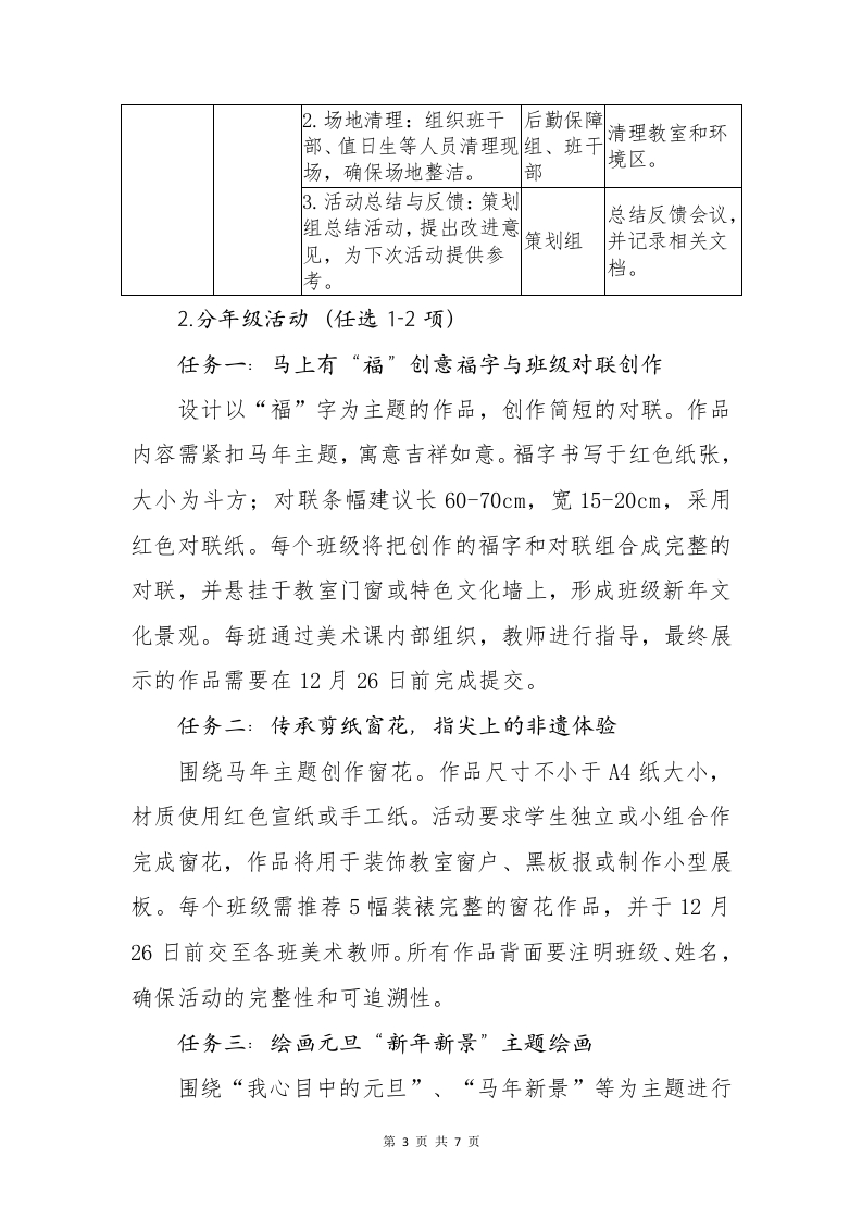 2026年马年元旦活动方案一骏马迎新,奔腾向前一、活动目的马蹄声声踏新程,春风得意迎新春。桃李满园知识树,桃红柳绿春常临。2026年元旦即将来临,马年象征着勇气与力量,充满了奋勇向前的正能量。为弘扬中华优秀传统文化,深化学校德育与美育融合,特举办本次元旦美育实践系列活动。通过创意手工、美术创作、文化表达等活动形式,学生将在亲身参与中感受传统节日的魅力,提升审美素养、动手能力与创新思维,增强班级凝聚力与文化自信。二、活动主题骏马迎新,奔腾向前三、活动时间2025年12月15日(周一)至12月31日(周三)四、参与对象全校学生五、活动内容设计1.活动阶段与具体安排阶段时间节点具体任务负责人备注1.学校发布活动总方案,召开全体教职工筹备会,宣传活动,营造组委会12月1日参与氛围。第一阶段12月7推送活动信息;日2.班级召开主题班会,成12月7日前汇立节目筹备小组,组织学各班主任总节目意向表,生创作与报名:提交至德育处。1.年级初选:各年级组自行组织节目初审,优选节各年级组挑选1-2个精品节目。12月8日目推荐至学校节目组。第二阶段12月142.节目创排:班级、社团日在班主任及指导老师带各班级、相关老师提供艺术指导与咨领下进行节目创作与排社团练,确保质量与安全。询。第1页共7页