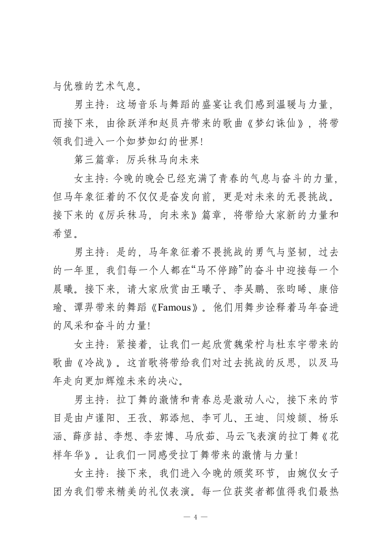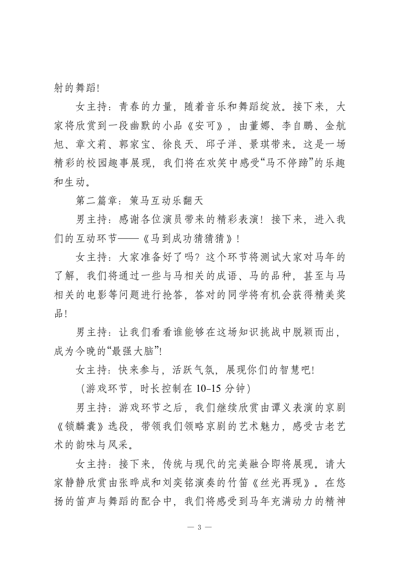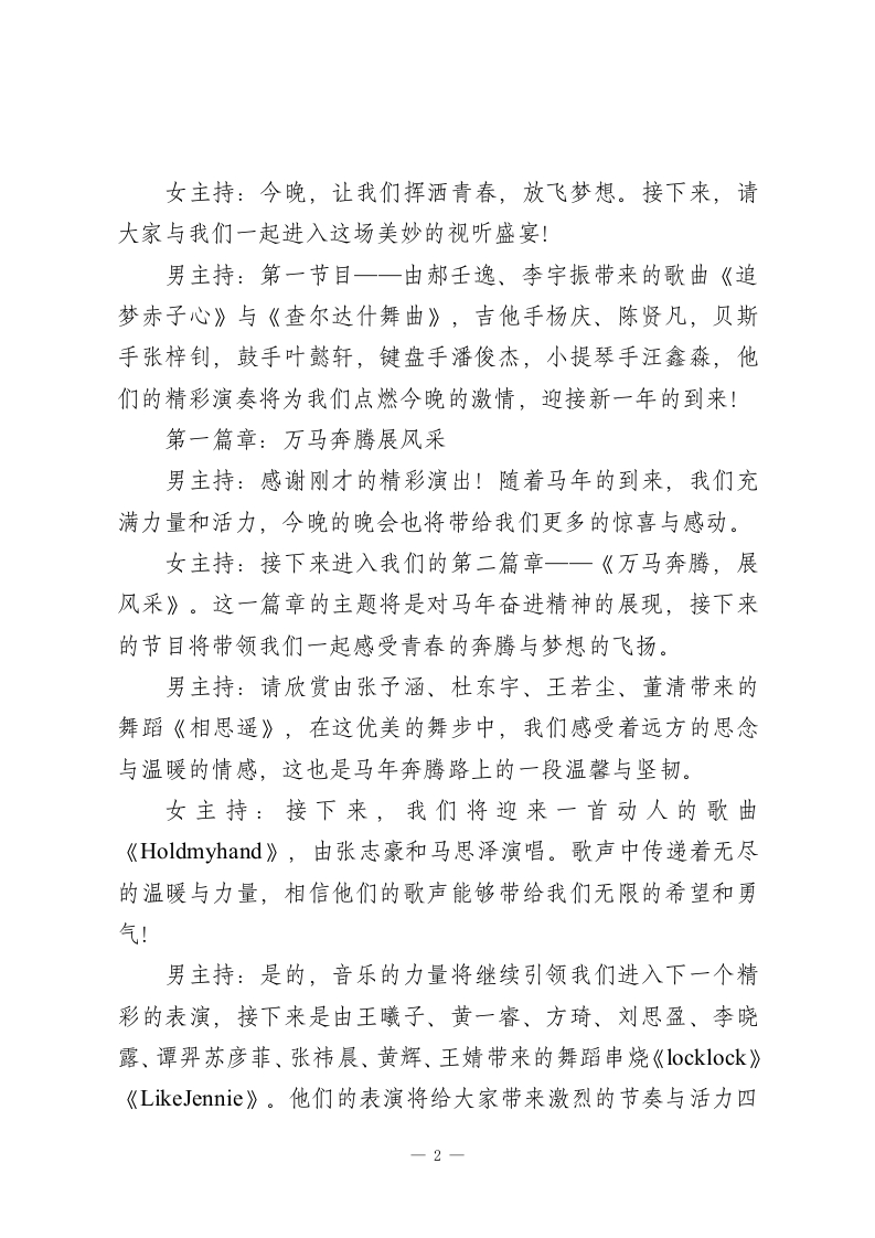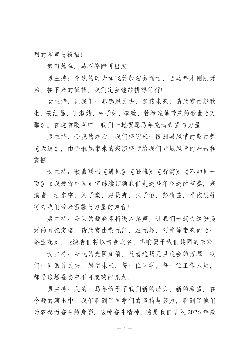 2026年马年元旦主持词骏马迎新,奔腾向前男主持:尊敬的各位领导,亲爱的老师们,亲爱的同学们,大家晚上好!女主持:在这辞旧迎新的时刻,我们相聚一堂,迎接2026年马年元旦的到来!男主持:今晚,我们带着对过去一年的感恩与怀念,走向新的起点;我们带着对未来的希望与梦想,策马扬鞭,踏上新的征程。女主持:是的,马年象征着奋进与速度,象征着无畏的勇气和坚定的决心。正如古人所说:“老骥伏枥,志在千里;烈士暮年,壮心不已。”我们每一个人,都应像那匹骏马一样,勇往直前,不畏艰难,追求卓越。男主持:“春风得意马蹄疾,一日看尽长安花。”今晚,随着这一句古诗,我们开启这场元旦晚会,用歌舞、诗词和戏剧,点亮马年梦想的星空!女主持:今晚,我们将通过歌舞、朗诵、戏剧等丰富的表现形式,回顾过去的辉煌,展望未来的辉煌。每一位同学的表现,都将是梦想与努力的结晶,也让我们每个人在追梦的路上更加坚定和勇敢。男主持:马年象征着奋斗与成功。今晚的每一场表演,都是我们共同奋斗、共同前行的见证!一1