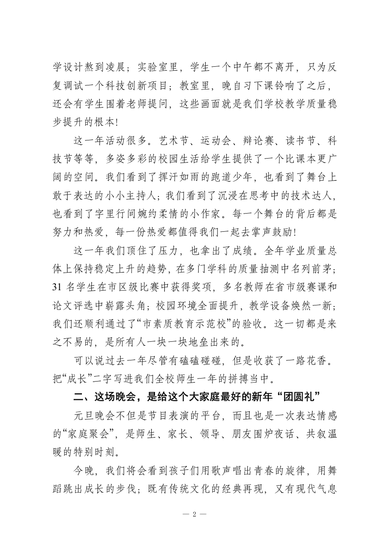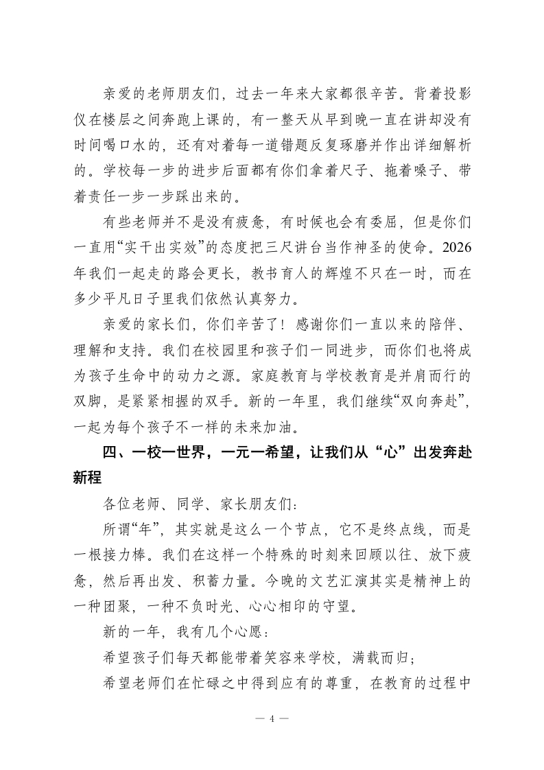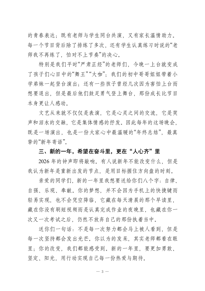 2026年元旦文艺汇演校长致辞:一岁一团圆,一校一梦想!尊敬的各位领导、各位来宾,亲爱的老师们、同学们、家长朋友们大家晚上好!进入冬月之后,天气越来越冷了,但是我们的心里却暖洋洋的。操场上的灯光照耀着每张笑脸,歌声、掌声、笑声汇成一片,把我们的校园装点得温馨又热闹。今天我们怀着喜悦的心情,在辞旧迎新的时刻齐聚一堂,举办一台精彩的文艺演出,给2025画上一个温暖的句号,也为即将到来的2026揭开新的希望篇章。我代表全校校领导,对百忙之中前来观看演出的各位领导、来宾表示最热烈的欢迎!对一年来辛勤付出的全体教职工表示最真诚的感谢!对支持学校各项工作的家长们致以最真挚的祝福!也向今晚晚会辛苦排练、认真准备的同学以及默默保障运转的后勤人员、音响统筹、舞台执行等“幕后小英雄”道一声:“你们辛苦了!”一、2025年,我们一起扛过压力,也一起收获了喜悦回过头来看一下刚刚过去的2025年,用“忙碌”二字来形容,恐怕还是轻了点。每一位老师、每一名同学、每一位家长都是这一年一路前行的“同行者”。今年的教学任务也不轻。但是在课堂上,学生认真听课,老师上着一节又一节激情四射的课。教研室里,老师为一份教-1