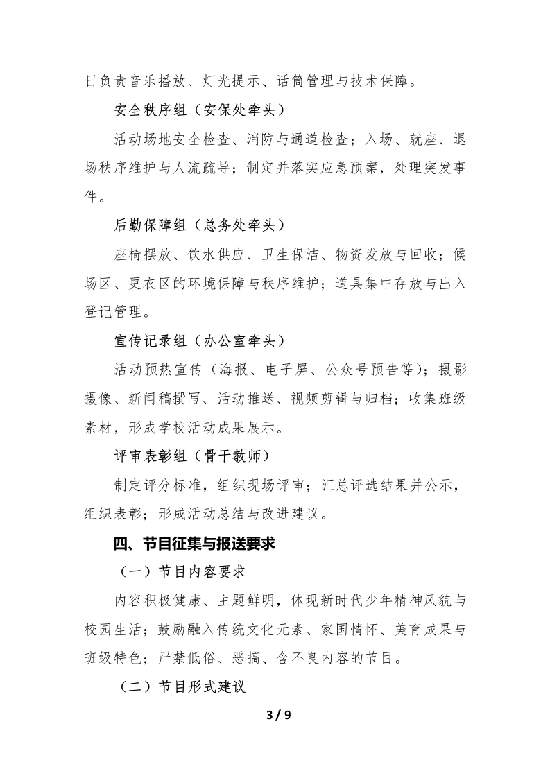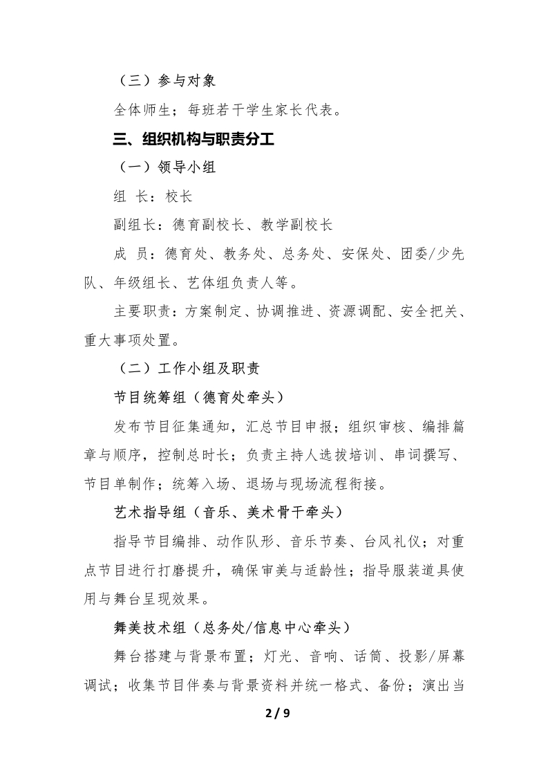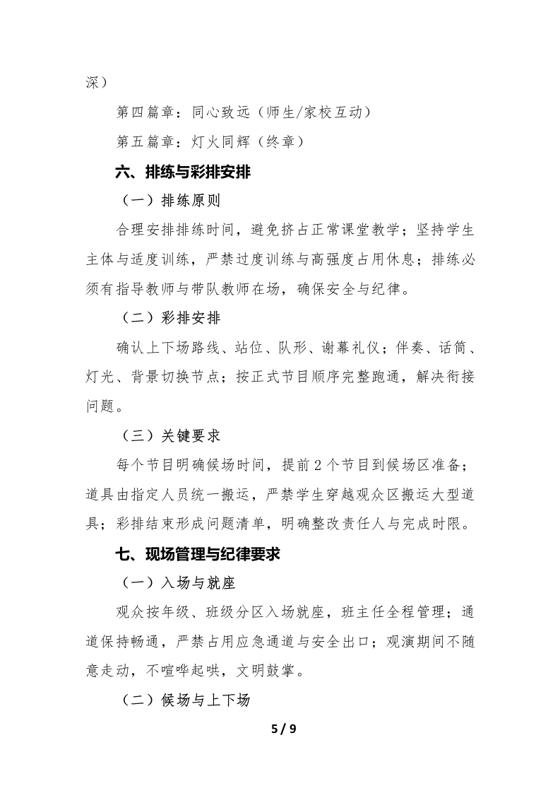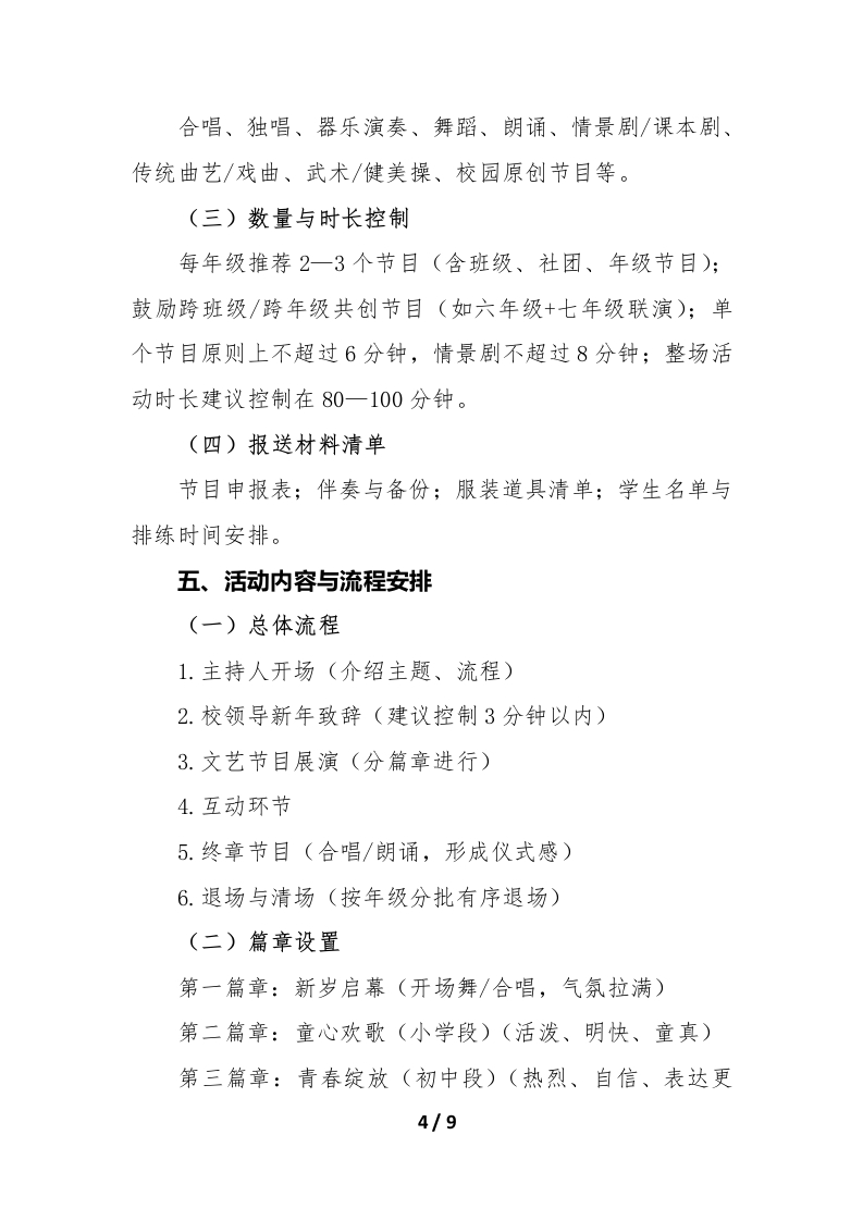灯火迎新岁,舞台见成长2026年元旦文艺展演活动方案为深入推进学校美育工作与校园文化建设,营造欢乐祥和、文明向上的节日氛围,集中展示学校艺术教育成果、班级文化风采与学生综合素养,增强师生凝聚力、归属感与集体荣誉感,学校决定组织开展2026年元旦文艺展演活动。一、活动主题与目标(一)活动主题灯火迎新岁,舞台见成长(二)总体目标1.营造温暖喜庆、健康文明的校园迎新文化氛围。2.展示学校美育课程、社团活动与班级文化建设成果。3.实现“班班有节目或岗位、人人有角色或任务”。4.提升学生舞台表达、合作意识与审美素养。二、活动时间、地点与参与对象(一)活动时间正式展演时间:2025年12月31日下午彩排联排时间:2025年12月24日一30日成果展示时间:2026年12月31日(二)活动地点学校报告厅1/9