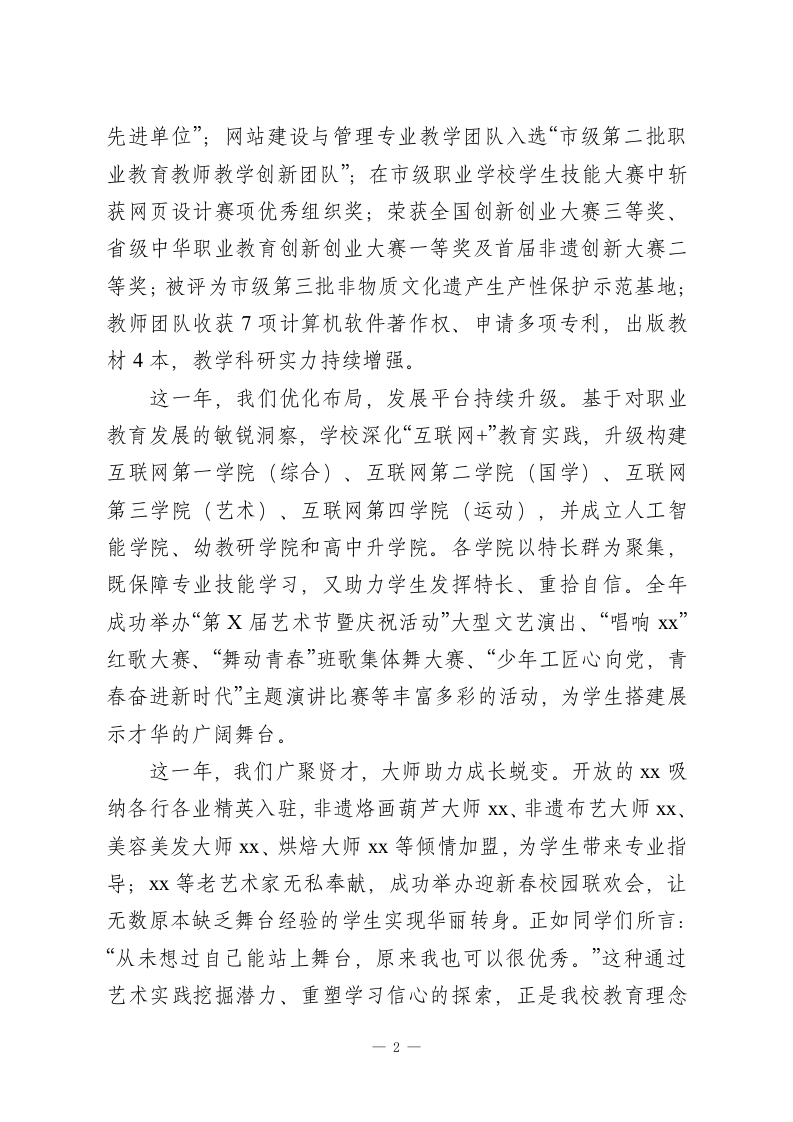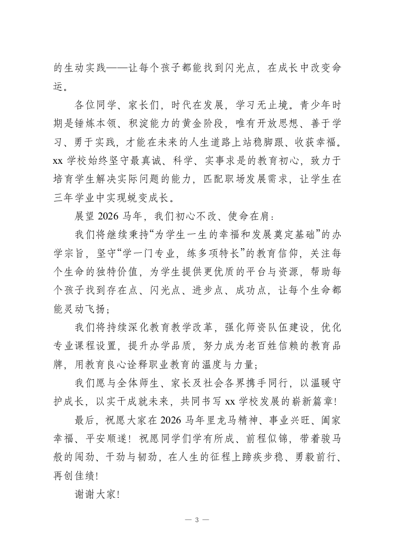 2026年元旦新年职业高中校长致辞:骏马踏春启新程,匠心智育谱华章尊敬的老师们、家长们,可爱的同学们,关心支持x发展的社会各界朋友们:大家好!骏马奔腾携福至,春风送暖启新篇。满载收获的2025年已悄然远去,充满希望的2026马年正向我们阔步走来。值此辞旧迎新的美好时刻,我谨代表学校,向全体师生、家长朋友们及社会各界同仁,致以最诚挚的新年祝福和最衷心的感谢!2025年,我校始终坚守“挖掘学生潜力,改变学生命运”的办学思想,以“学一门专业,练多项技能”为核心抓手,以“学能学会的先进知识,练能掌握的前瞻技能”为坚实保障,以“让学生带着沉甸甸的成果回家”为教学目标,深耕职业教育沃土,推动学校各项事业实现高质量发展。这一年,我们扩容提质,办学规模再上新台阶。向高一级学校和社会输送605名优秀毕业生,升学率高达99.6%,学校社会知名度与美誉度显著提升;成功招录909名优秀学子,为学校发展注入新鲜血液,为教育质量提升增添强劲动力。这一年,我们深耕实干,发展成就硕果盈枝。我校特色教学模式获得社会各界广泛认可,省领导专程到校考察,高度赞扬学校在服务城市经济发展中的特殊作用;省政府教育督导组对我校办学思想、教育理念、环境设施、校园文化等给予充分肯定。在各类评比竞赛中,我校屡获佳绩:获评“学校安全工作1