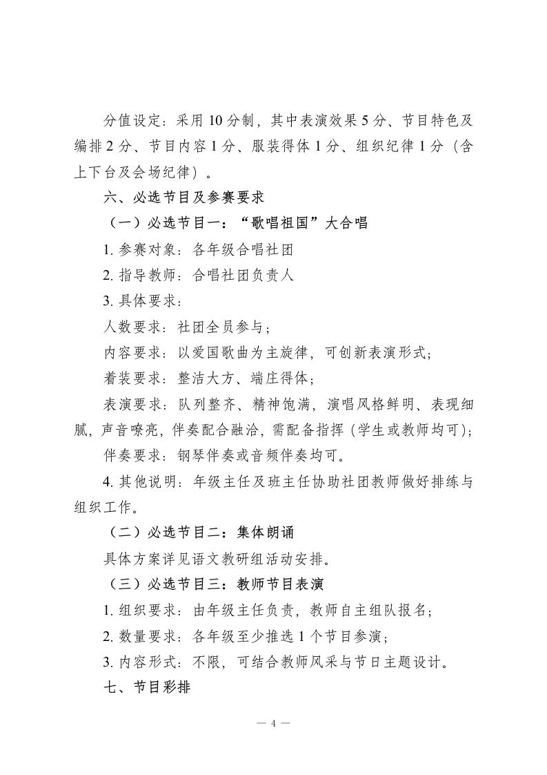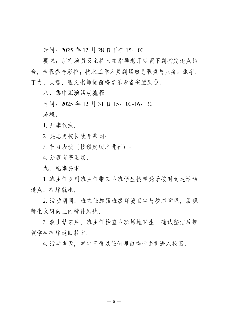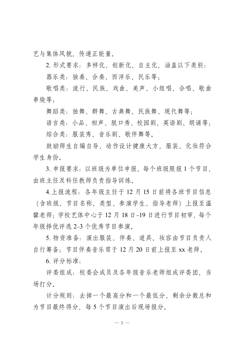 2026年中小学“金马启新程艺彩耀校园”元旦文艺汇演方案一、指导思想深入学习贯彻党的最新精神,唱响时代主旋律,丰富师生校园文化生活,倡导高雅健康的文化艺术风尚,培育师生文化品位与艺术修养。值2026年元旦来临之际,我校特举办本次元旦文艺汇演,引导广大师生陶冶高尚情操、厚植家国情怀,树立正确人生价值观,让校园文化焕发蓬勃生机。二、活动宗旨以班级为单位,面向全体学生,倡导人人参与迎新年;搭建展示平台、提供成长机会、彰显个性才艺、培育时代新人,让每一位师生在活动中感受节日氛围、收获成长快乐。三、活动时间2025年12月31日(暂定)四、成立组织机构成立“xx学校元旦文艺汇演领导小组”及职能组,统筹指导活动开展与评选工作,确保活动有序高效推进。(一)领导小组成员组长:Xx副组长:Xx、Xx、Xx组员:XX、XX、Xx、Xx(二)职能组成员及职责1