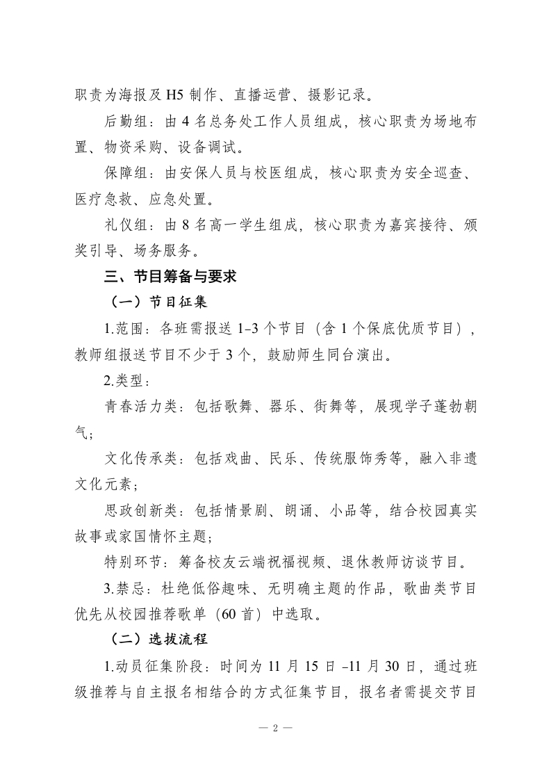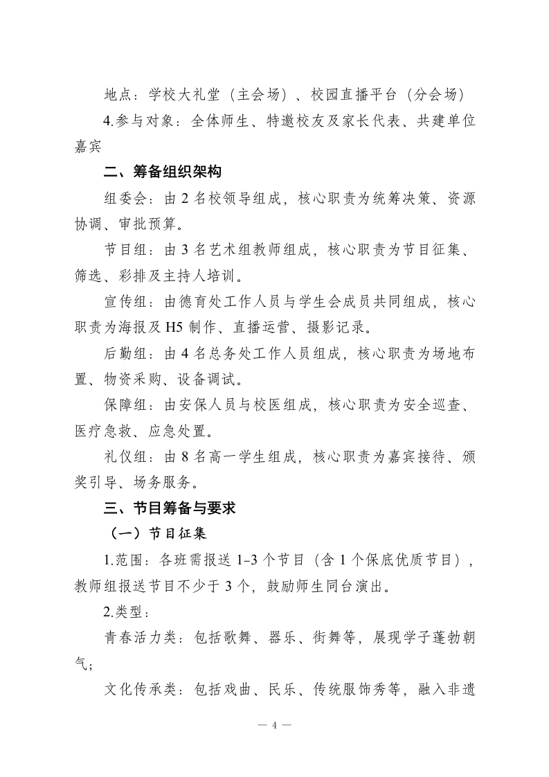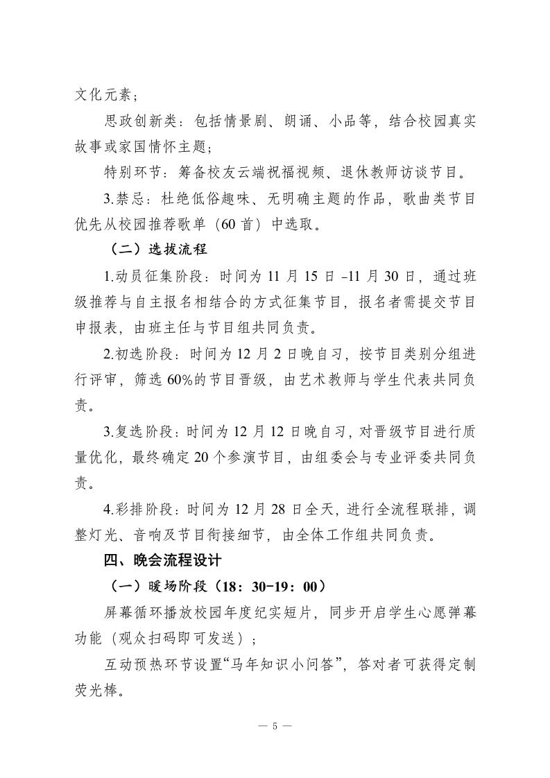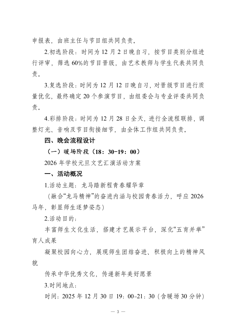 2026年中学元旦文艺汇演活动方案:龙马踏新程,青春耀华章一、活动概况1.活动主题:龙马踏新程青春耀华章(融合“龙马精神”的奋进内涵与校园青春活力,呼应2026马年,彰显师生逐梦姿态)2.活动目的:丰富师生文化生活,搭建才艺展示平台,深化“五育并举”育人成果凝聚校园向心力,展现师生团结奋进、积极向上的精神风貌传承中华优秀文化,传递新年美好愿景3.时间地点:时间:2025年12月30日19:00-21:30(含暖场30分钟)地点:学校大礼堂(主会场)、校园直播平台(分会场)4.参与对象:全体师生、特邀校友及家长代表、共建单位嘉宾二、筹备组织架构组委会:由2名校领导组成,核心职责为统筹决策、资源协调、审批预算。节目组:由3名艺术组教师组成,核心职责为节目征集、筛选、彩排及主持人培训。宣传组:由德育处工作人员与学生会成员共同组成,核心一1