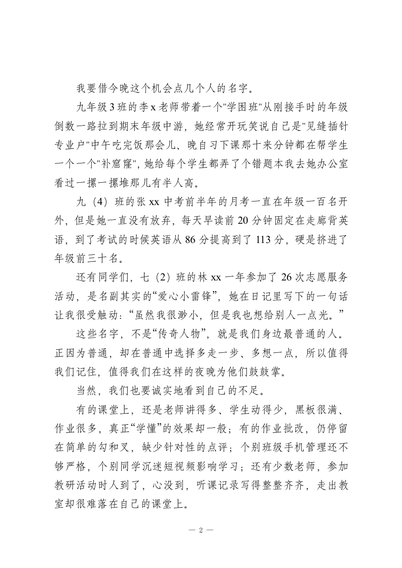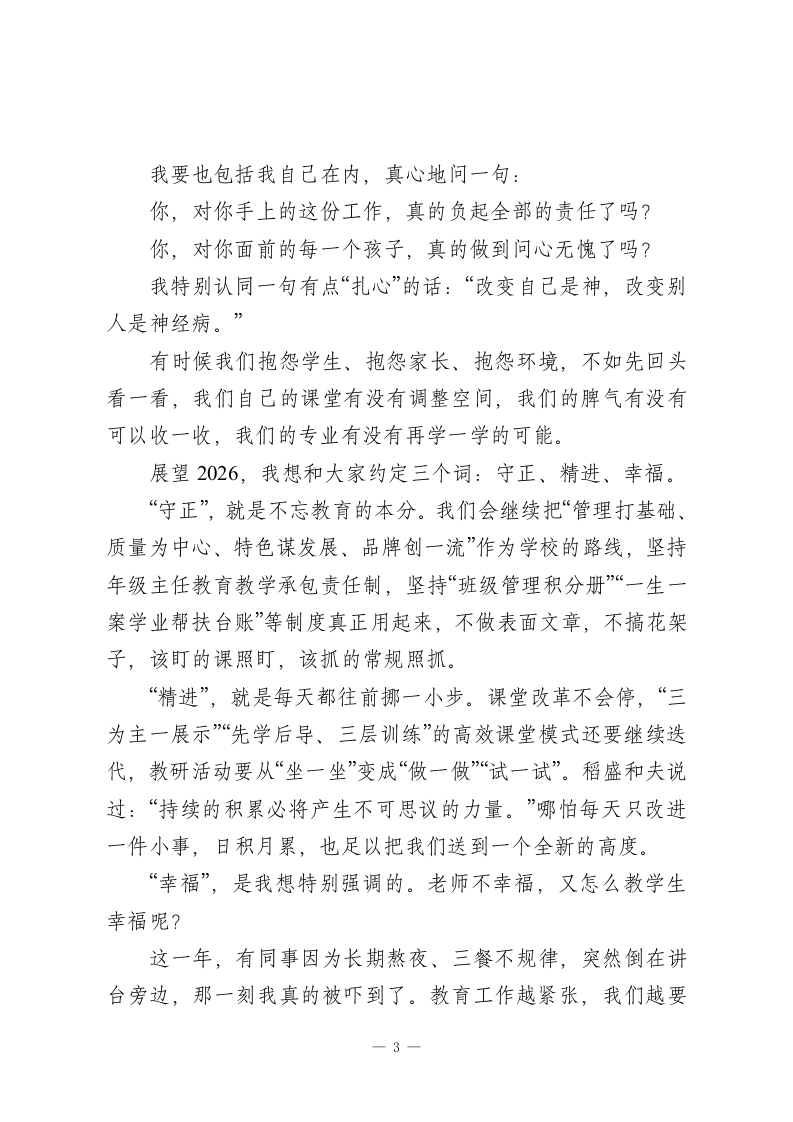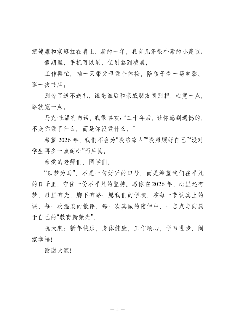 2026元旦文艺汇演,校长致辞:致敬奋斗的你,点亮平凡的光一一共赴2026教育新征程!尊敬的各位老师、亲爱的同学们:大家晚上好!龙歌辞旧岁,马啸启新程。金马贺岁迎新局,丹心育才谱华章。在这个灯光璀璨、笑语盈盈的夜晚,看着同学们精心准备的节目,看到老师们难得放松地坐在台下,我心里只有一句话一这一年,我们都不容易,这一晚,我们都该好好享受。2025年,我们大家都很辛苦。清晨六点多,教学楼的灯已经一层层亮起来;夜里十点,办公楼还有老师在对着试卷一笔一画地改。一个个家长会、一场场质量分析会、一回回安全演练,有紧张、有压力,也有一次次咬牙坚持。经历过焦灼与担忧,也经历过无数次被学生、被同事感动的瞬间。这一年,我们围绕“生源、质量、安全、改革”这四个关键词下了真功夫。中考中,本科上线率达到96.8%,比去年提高了3.5个百分点;九年级数学年级平均分112.4分,是近三年最好的一次;全年无一例重大学校安全事故,家长满意度问卷中“非常满意和“满意”的比例达到了972%。这些数字背后,是一间间教室里真实的汗水,是一张张写满板书的黑板,是一次次被我们自己推迟的下班时间。一1