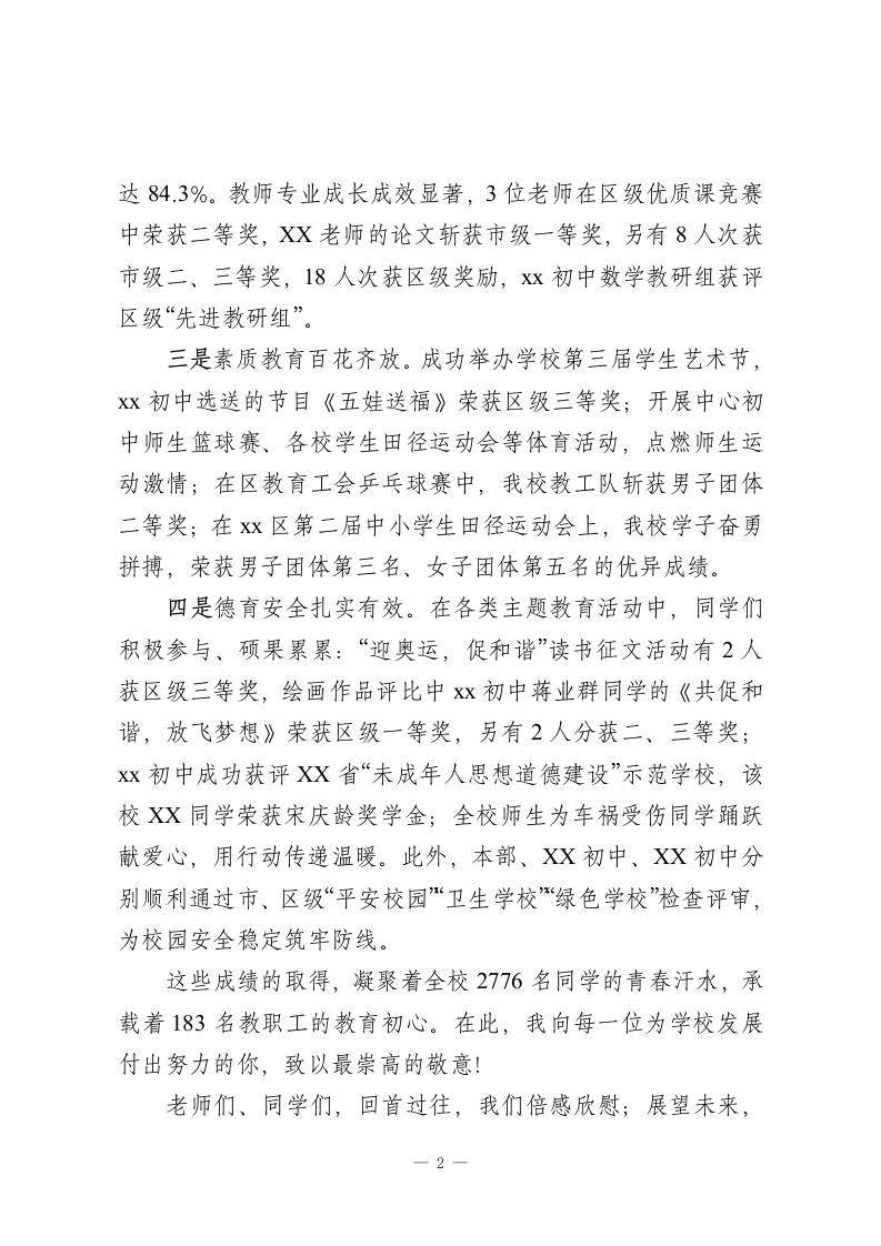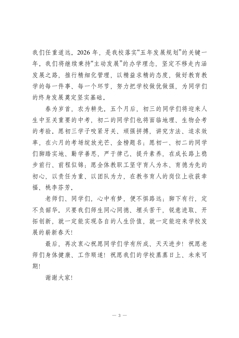 2026元旦校长致辞:匠心守教铸品牌笃行致远迎新春尊敬的各位老师、亲爱的同学们:新年好!岁序更替,华章日新。值此辞旧迎新的美好时刻,我谨代表学校党支部、校委会,向一年来辛勤耕耘在各个岗位、为学校发展倾情奉献的全体师生员工,致以最诚挚的感谢!并通过你们,向一直关心支持学校工作的家属们、家长们,送上最热烈的新年祝福一一祝大家新年快乐、阖家幸福、学业精进、万事顺意!岁月不居,天道酬勤。回望2025年,在各级领导的亲切关怀下,在全校师生的同心协力下,我们的学校在高质量发展的道路上稳步前行,每一项成绩都闪耀着奋斗的光芒:一是办学条件持续升级。本部综合实验楼、x初中新食堂及标准化运动场全面建成并投入使用,四校计算机房完成智能化升级,全校实现“班班通”多媒体教学全覆盖,校园照明、绿化等基础设施进一步优化,为师生营造了更舒适、便捷的教学与生活环境。二是教学教研硕果盈枝。2025年中考再创佳绩,801名考生中,119人达省级示范高中录取线,236人达XX高中线,573人达普通高中线,111人顺利升入优质职业高中,综合升学率高1