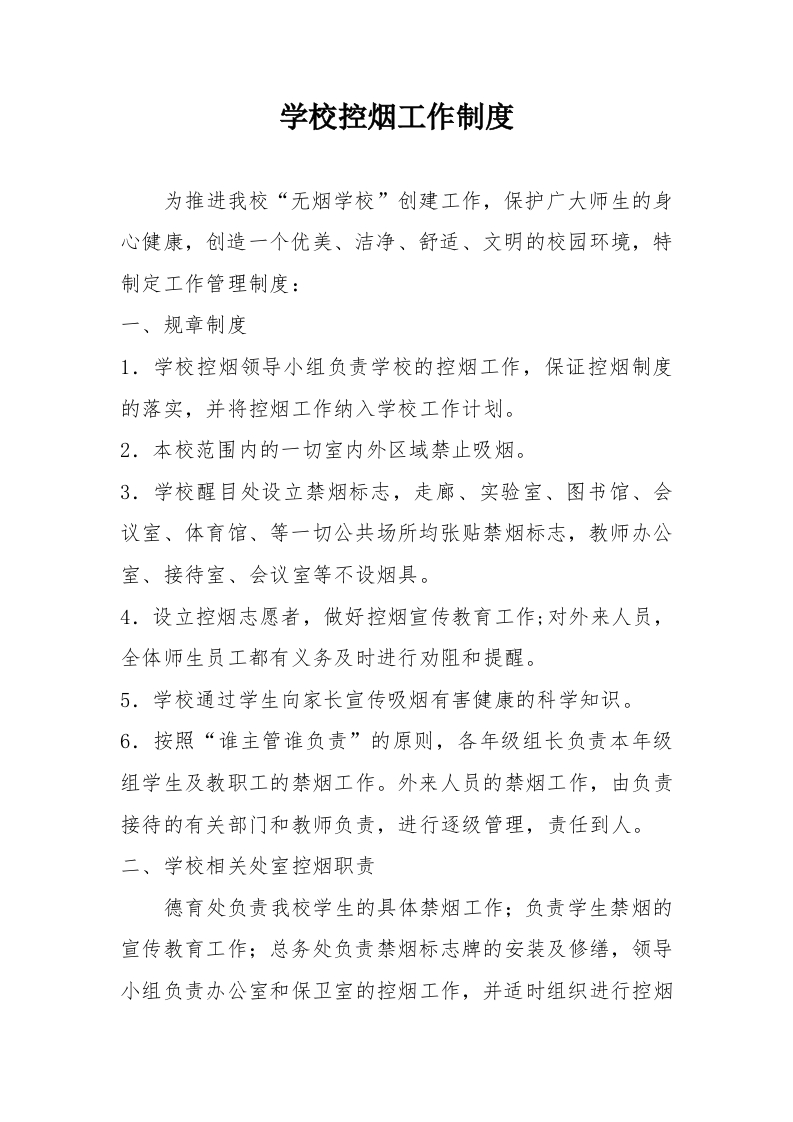 学校控烟工作制度为推进我校“无烟学校”创建工作,保护广大师生的身心健康,创造一个优美、洁净、舒适、文明的校园环境,特制定工作管理制度:一、规章制度1.学校控烟领导小组负责学校的控烟工作,保证控烟制度的落实,并将控烟工作纳入学校工作计划。2.本校范围内的一切室内外区域禁止吸烟。3.学校醒目处设立禁烟标志,走廊、实验室、图书馆、会议室、体育馆、等一切公共场所均张贴禁烟标志,教师办公室、接待室、会议室等不设烟具。4.设立控烟志愿者,做好控烟宣传教育工作;对外来人员,全体师生员工都有义务及时进行劝阻和提醒。5.学校通过学生向家长宣传吸烟有害健康的科学知识。6.按照“谁主管谁负责”的原则,各年级组长负责本年级组学生及教职工的禁烟工作。外来人员的禁烟工作,由负责接待的有关部门和教师负责,进行逐级管理,责任到人。二、学校相关处室控烟职责德育处负责我校学生的具体禁烟工作:负责学生禁烟的宣传教育工作;总务处负责禁烟标志牌的安装及修缮,领导小组负责办公室和保卫室的控烟工作,并适时组织进行控烟
