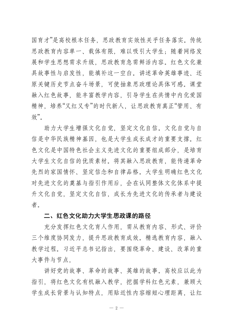 XX大学党支部书记:红色文化助力大学生思政课建设大学生是民族复兴的生力军,肩负着新时代的历史使命。红色文化是中国共产党领导人民在革命、建设、改革中积淀的精神财富,是培育大学生爱国主义情怀、塑造正确价值观的重要载体。在民族复兴新征程中,激活红色文化育人功能,引导大学生厚植爱国情怀、砥砺强国之志、践行报国之行,助其成为拥护中国共产党的领导、投身中国特色社会主义事业的合格人才,是高校思政教育的重要课题。一、红色文化助力大学生思政课的意义红色文化是党和国家宝贵的物质与精神资源,具有先进性、革命性、实践性、人民性与民族性。作为重要思政教育资源,其对大学生思政教育有不可替代的价值,主要体现在三方面:强化大学生对党和国家的认同。培养大学生对党和国家事业的认同感,是高校思政教育的重要目标。红色文化承载着党的百年革命、奋斗与英雄史,能具象化激发大学生的爱国情感。大学生走进革命遗址、英烈纪念馆,真实的历史场景与文物展陈会带来强烈思想触动。这既能帮助他们深入理解党史、新中国史等,又能引导其抵制历史虚无主义,增强历史定力。在认知历史、感悟成就中,大学生会更珍视国家发展成果,树立正确历史观,深化对党和国家的情感与价值认同。增强思政教育的丰富性、生动性与实效性。“为党育人、为一1