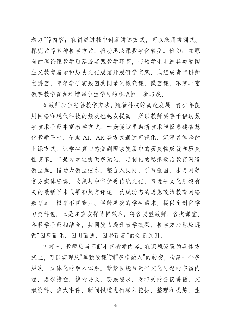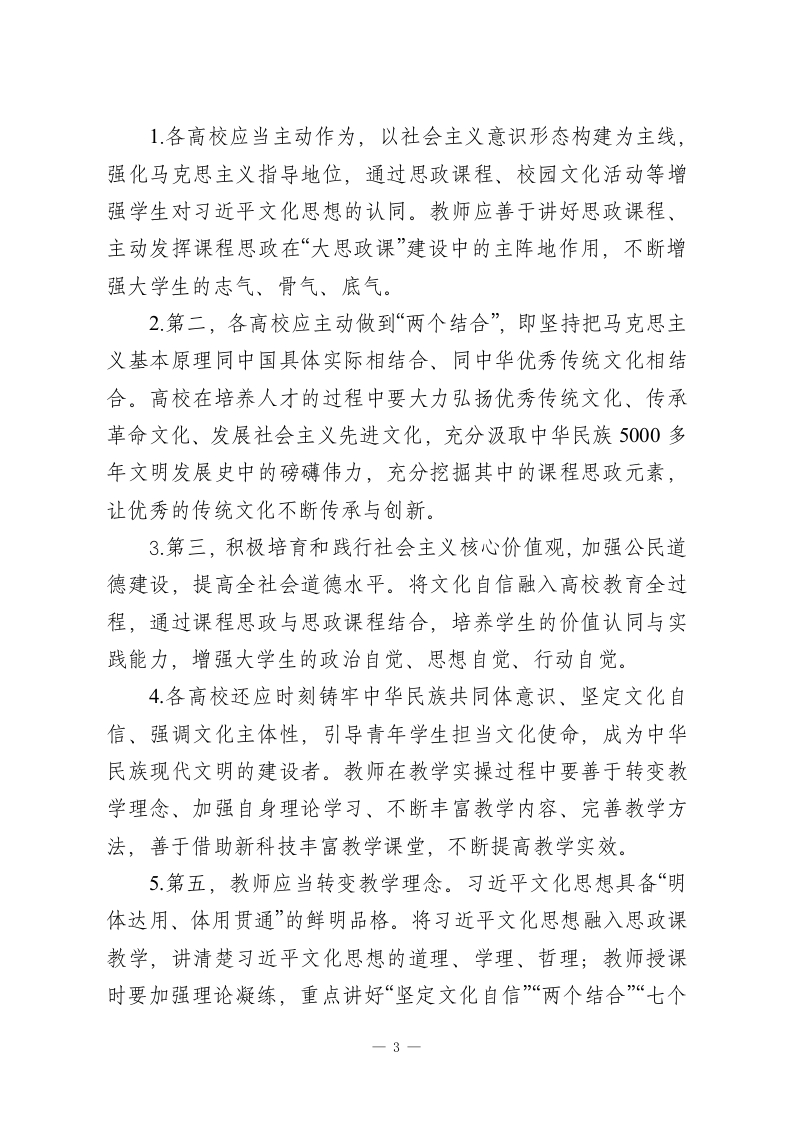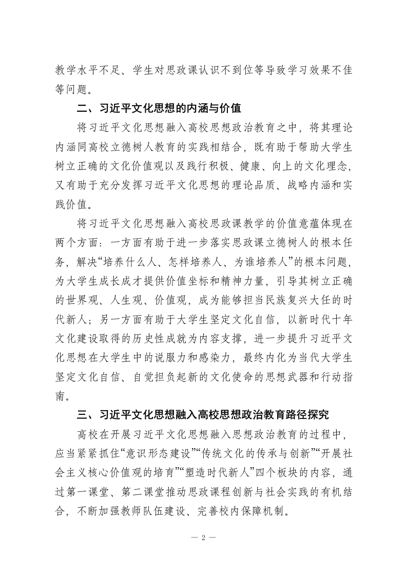 XX大学关于习近平文化思想融入高校思想政治教育路径探究2023年10月,在全国宣传思想文化工作会议上正式提出了习近平文化思想,明确了我国建设社会主义文化强国的前进方向,为推进中国特色社会主义文化建设提供了行动指南与根本遵循。浇花浇根,育人育心。高校作为立德树人的主阵地,更应以习近平文化思想引领高校思想政治教育,主动将其与高校思想政治教育相结合,与人才培养过程相结合,引导学生树立正确的世界观、人生观、价值观。一、高校开展习近平文化思想融入思想政治教育的现状分析目前,许多高校已将习近平文化思想融入高校思想政治教育,并结合各自特点产出了大量的成功案例。例如:西安邮电大学打造“红色场馆+思政课”新模式、西安交通大学思政选修课将“延安精神”和“西迁精神”等红色精神融入课堂;西北工业大学打造“领航!领航!”课程剧,以沉浸式教学反哺课堂,让课堂“活”起来,还在校内成立青年宣讲团,形成了“硕博为引、本科为主”的框架模式,汇青年之力,宣时代之声,广泛开展理论宣讲活动。这些创新举措非常值得推广与借鉴。与此同时,也存在“重理论、轻实践”的现象,绝大多数高校对习近平文化思想的理论研究较为重视,但部分高校习近平文化思想融入学生课堂学习与社会实践的模式不够丰富、教师—1