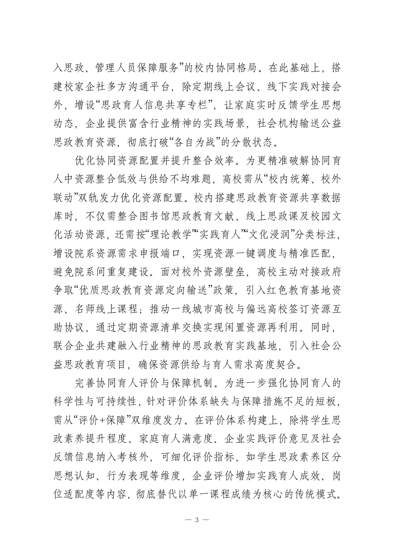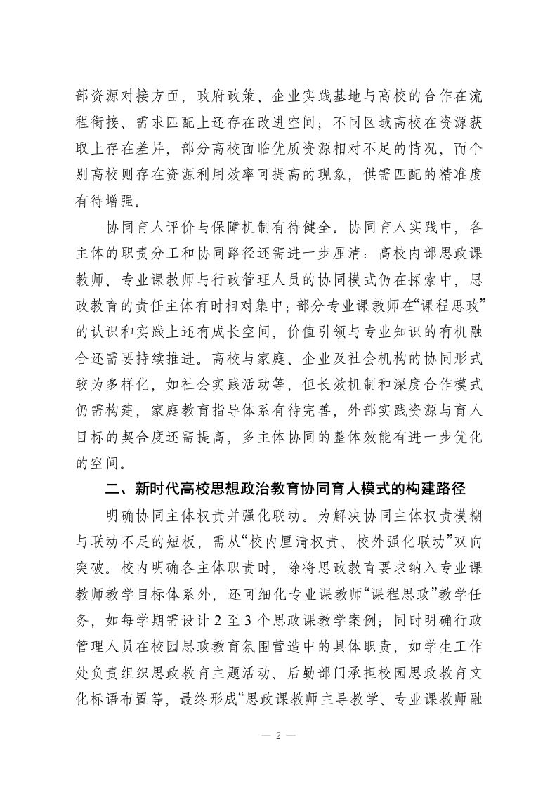XX大学校长:加快构建新时代高校思政教育协同育人模式新时代背景下,高校思想政治教育肩负培养时代新人的使命,其质量直接影响国家人才培养战略的实施成效。当前,思政教育实践中显现出育人主体联动效能不足、资源整合效率偏低等短板,传统单一育人模式难以适应新时代需求。在此背景下,构建多元主体参与的协同育人模式,成为突破思政教育瓶颈、提升育人实效的重要方向。笔者结合高校思政教育现状,围绕协同育人模式的构建路径、实践方法及保障机制展开探讨,为其高质量发展提供支撑。一、新时代高校思想政治教育协同育人的发展现状协同育人主体权责边界有待进一步明晰,联动机制仍需加强。当前协同育人实践中,高校内部各主体的协同职责尚需进一步明确,思政教育在一定程度上仍以思政课教师为主导;部分专业课教师对“课程思政”的理解和参与度还有提升空间,价值引领与专业教学的融合深度有待加强。高校与家庭、企业、社会机构的合作多以项目制为主,长效协同机制还需完善,家庭育人功能的发挥尚显不足,外部资源与育人需求的精准对接仍需探索,多主体协同的系统性有待提升。协同育人资源整合效率有提升空间,供给均衡性需要改善。高校内部思政教育资源分布于图书馆文献、校园文化活动、线上平台等多个载体,但统筹调度与共享机制还不够健全,院系间资源互通的积极性有待激发,育人合力的形成尚需优化。外1