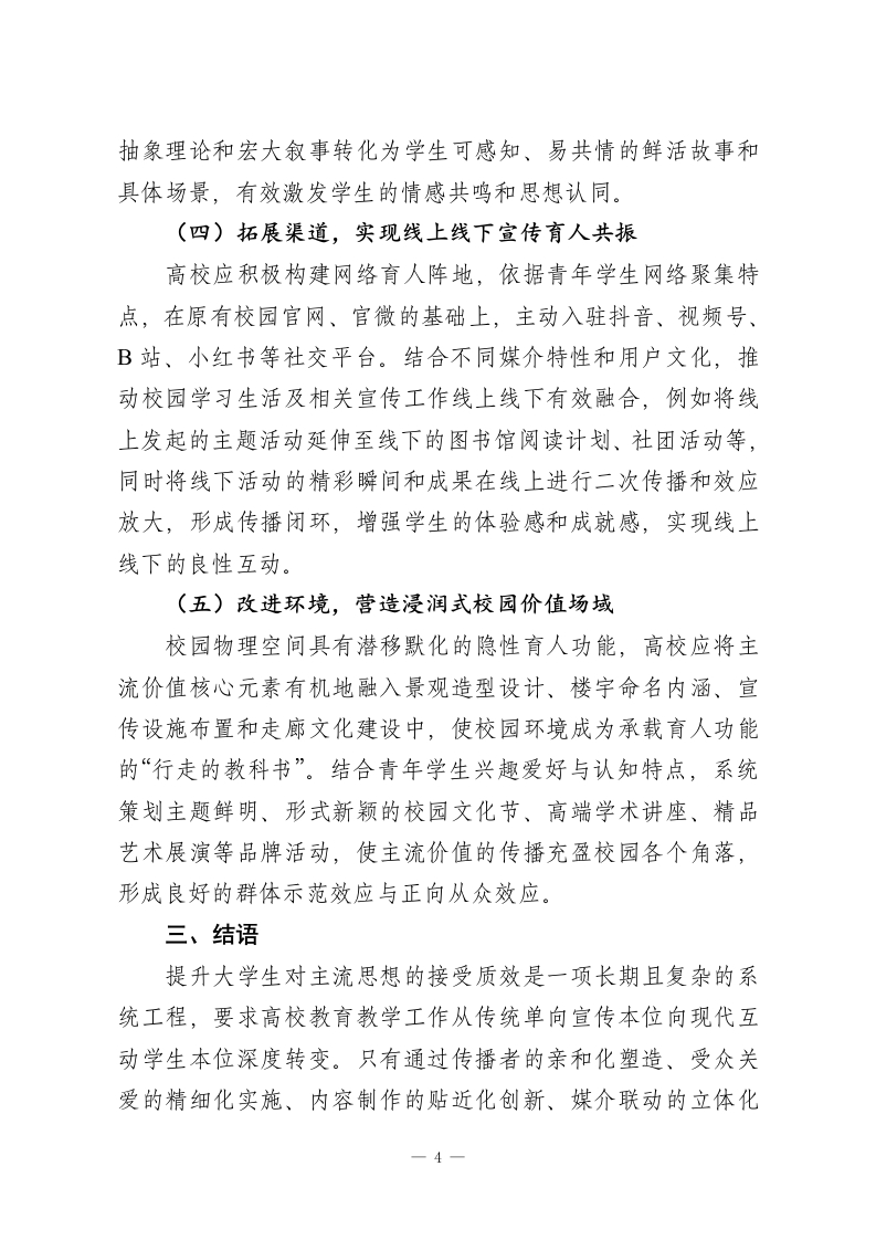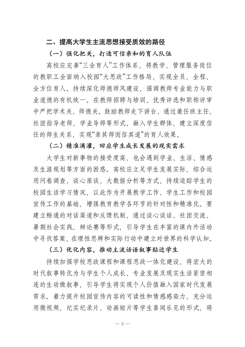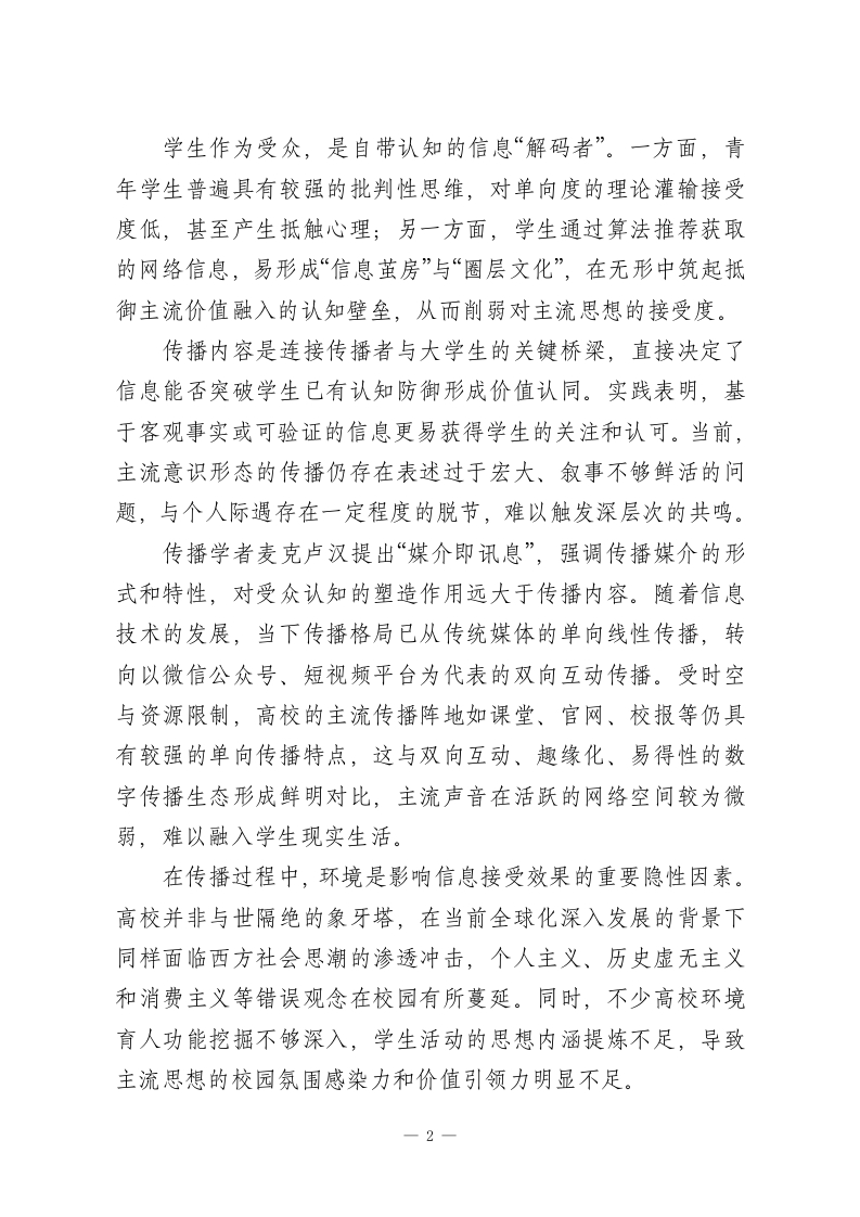 XX大学校长:加强高校育人阵地建设,提升大学生主流思想接受质效大学生作为国家与民族未来建设的生力军,其在校期间对中华民族主流思想的认同和内化,是高校落实立德树人根本任务的关键环节。青年大学生正处于世界观、价值观形成的阶段,具有高度的可塑性,在思想多元交织和信息海量芜杂的背景下,其价值认同的建构受诸多复杂因素的影响。从传播学视角来看,作为信息受众的大学生,其思想观念的形成不仅取决于自身的认知,也受到传播主体、传播内容、传播媒介、传播环境等多重因素的作用。高校能否充分发挥育人主体功能,构建有利于学生成长成才的校园生态,对于大学生树立科学的世界观和价值观具有重要意义。一、大学生主流思想接受的影响因素及现实挑战根据哈罗德拉斯韦尔在1948年提出的信息传播过程模型,信息接受的有效性(接受效度)受五个关键因素的综合影响:传播者、受众、内容、煤介和传播环境。这五大要素相互作用,共同决定着信息传递和接受的实际效果。从高校的育人语境来看,学生对主流思想的接受同样受到这些因素的影响。从传播者的维度来看,在高校的教育教学环境中,教师、管理服务人员及同辈群体都能影响到学生的价值观,其中承担课程讲授任务的教师对大学生思想观念的形成影响最为显著。高校教师凭借其专业身份与学术成就,易被学生看作高可信度传播者而受到信任,学生倾向于接受其所传递的价值观。1