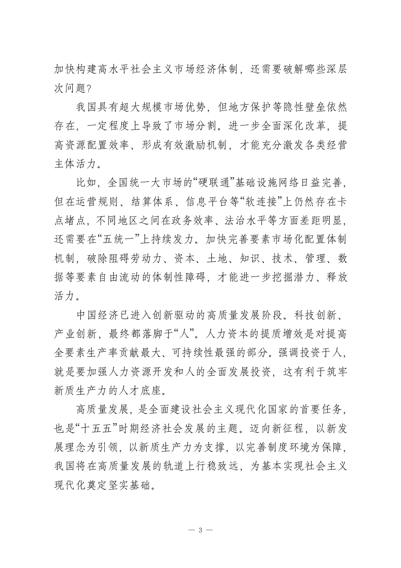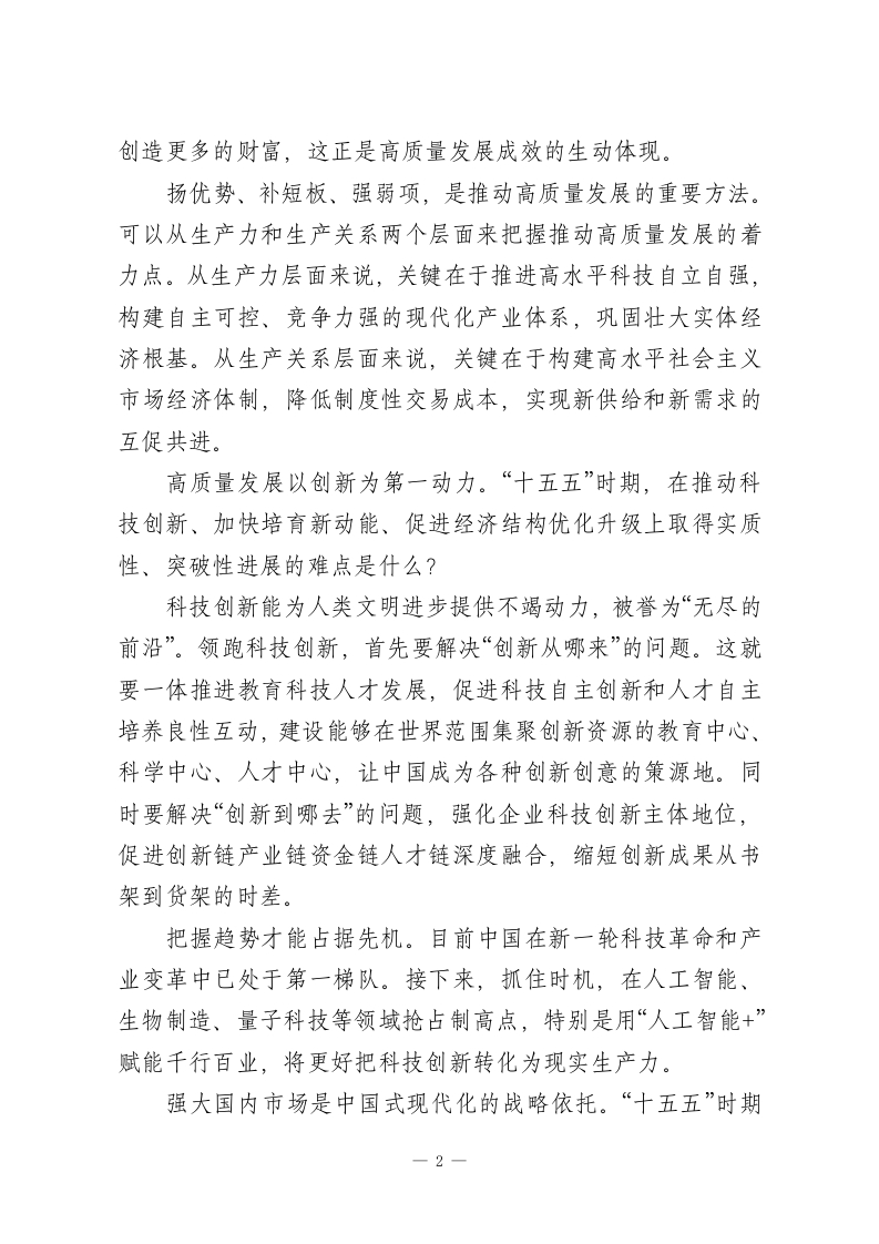 XX大学院长:高质量发展,破解矛盾赢长远党的二十届四中全会擘画了“十五五”时期的发展蓝图。习近平总书记强调:“2035年基本实现社会主义现代化,一个重要标志性指标就是人均国内生产总值达到中等发达国家水平,这要求‘十五五’时期经济社会发展保持适当速度。”同时,未来5年继续以推动高质量发展为主题。2024年,我国人均国内生产总值超1.3万美元,但距离中等发达国家水平还有不小差距。保持适当速度,才能创造更多就业和社会财富,为到2035年基本实现社会主义现代化奠定更加坚实的基础。高质量发展与保持适当速度,是一种动态的、积极的战略协调关系。我国经济在如此大体量的基础上保持适当速度,必须依靠高质量发展,通过创新驱动和全要素生产率提升来实现一种更可持续、更有韧性的增长。反过来,保持适当速度也为进一步全面深化改革、推动高质量发展提供了必要的回旋空间。“十四五”时期,我国高质量发展迈出坚实步伐。“十五五”时期是破解高质量发展面临突出矛盾问题的关键时期,具体有哪些着力点?有几个数据可以提供观察视角:2024年,我国全员劳动生产率达到173898元/人,单位GDP能耗比“十三五”末下降11.6%,企业对全社会研究与试验发展经费增长贡献率达到77.1%。这表明,中国经济能够以更高的效率、更少的能耗、更多的创新,1