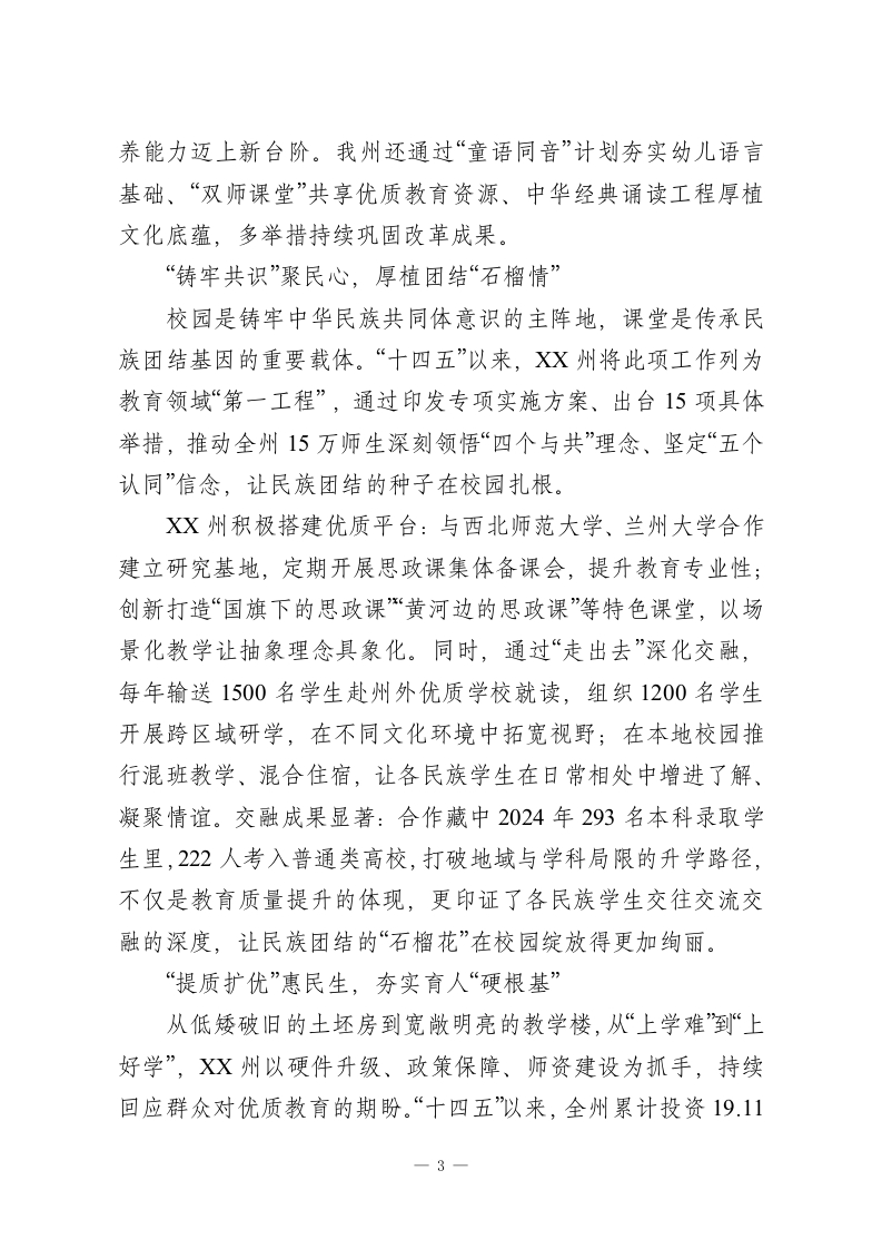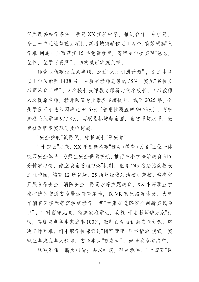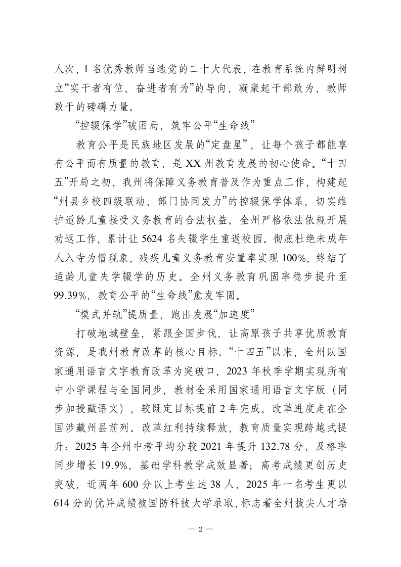 XX高原学校校长年终总结:高原教育展新姿,杏坛华章映雪域雪山脚下书声琅,黄河之畔育新苗。在平均海拔3000米以上的XX高原,教育既是阻断贫困代际传递的根本之策,更是铸牢中华民族共同体意识、滋养各族群众心灵的精神纽带。“十四五”以来,我州以教育公平为基石、以质量提升为核心、以改革创新为动力,锚定“1234678”教育高质量发展思路,攻克886项具体任务,奏响教育跨越发展的激昂乐章,从“有学上”到“上好学”,为中国式现代化美丽新XX建设注入源源不断的教育动能,让人民群众的教育获得感、幸福感、满意度显著提升。“党建领航”强方向,筑牢教育“定盘星”方向明则路径清,党建强则教育兴。我州教育系统始终将党的领导贯穿办学治校各环节全过程,以高质量党建为教育高质量发展定向领航、固本培元。理论武装筑根基,严格执行“第一议题”制度,党组织负责人带头深入校园、课堂开展宣讲,累计宣讲中央精神超500场次,推动习近平总书记关于教育的重要论述进校园、进课堂、进头脑,让理论学习转化为教育实践的“指南针”。组织建设强堡垒,全面落实中小学校党组织领导的校长负责制,精准调整180所学校领导班子,创新将302个党支部建在年级组、教研组,实现党组织与教育教学工作深度融合,构建起覆盖全州教育领域的坚强战斗堡垒。队伍引领聚合力,充分发挥党员先锋模范作用,全州90%的教学骨干为党员;州直教育系统优化干部队伍结构,累计调整配备干部2201