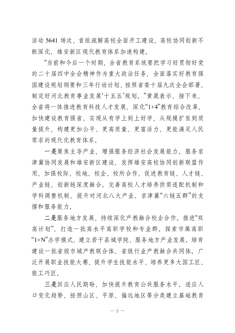 XX教育局党组书记:构建更加公平更高质量的现代化教育体系党的二十届四中全会对一体推进教育科技人才发展、办好人民满意的教育等作出系列新部署,充分彰显了以习近平同志为核心的党中央对教育的高度重视。省委十届九次全会是党的二十届四中全会精神在河北落地落实的行动指引,为做好我省教育工作提供了重要遵循。省委教育工委书记,省教育厅党组书记、厅长黄晟介绍,“十四五”以来,在省委、省政府的领导下,在全社会的大力支持下,全省教育系统深入贯彻习近平总书记关于教育的重要论述和在河北考察时的重要讲话精神,始终把教育摆在优先发展的战略位置,统筹教育领域改革发展稳定大局,推动教育事业发展取得历史性成就,发生格局性变化。“十四五”以来,全省教育普及水平迈上新台阶,学前教育三年毛入园率达到92.03%、九年义务教育巩固率达到98.23%、高中阶段教育毛入学率达到96.15%、高等教育毛入学率达到60.9%,均高于全国平均水平,提前实现“十四五”规划目标。服务支撑能力实现新突破,培养高校毕业生264.36万人,高校战略性新兴产业和现代服务业相关专业占比达44.9%,建设1个国家级市域产教联合体,5个全国重点实验室,专利产业转化率提高到14.56%。教育协同发展取得新成就,与京津314所基础教育学校、29所普通高校、9所高职院校密切合作,开展周末专家河北行1