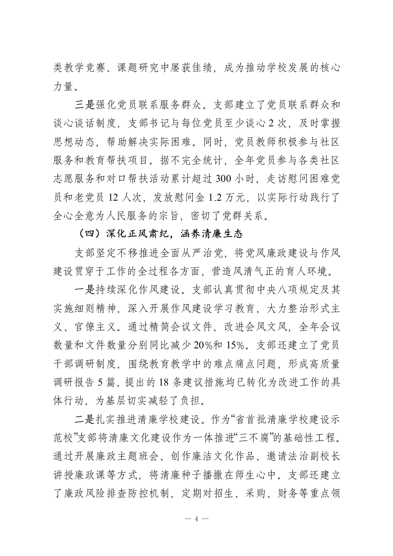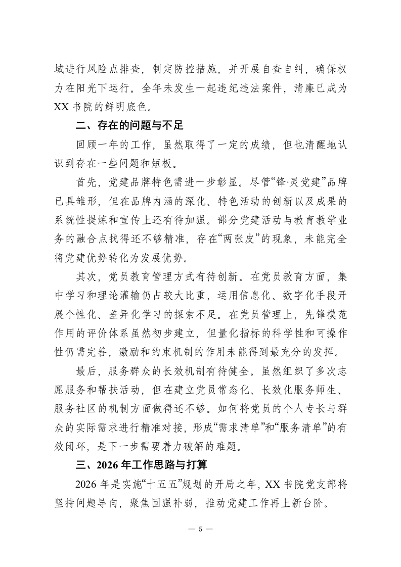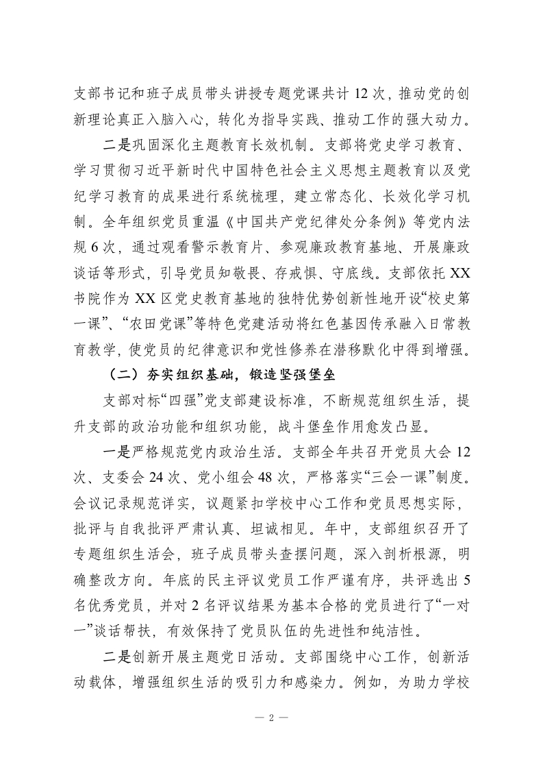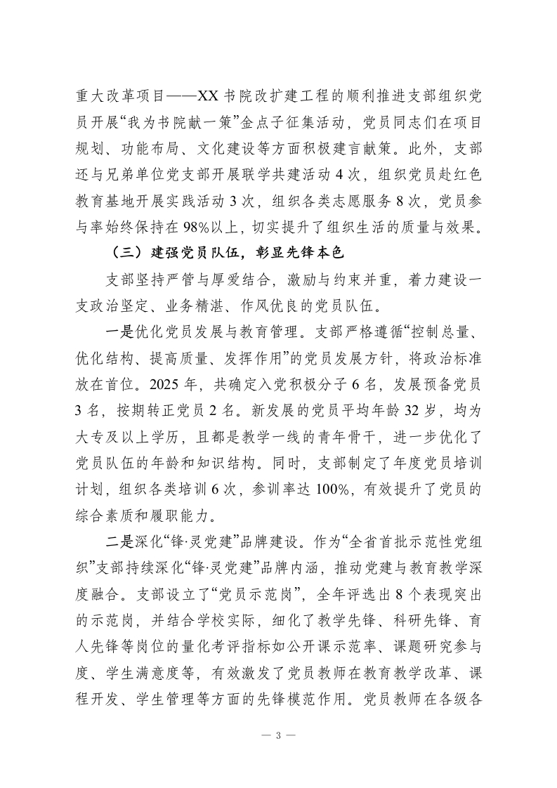 XX区XX书院党支部2025年工作总结2025年是“十四五”规划的收官之年,也是全面深化改革向纵深推进的关键一年。在这一年中,XX区XX书院党支部在XX区教育局党委的坚强领导下,始终坚持以习近平新时代中国特色社会主义思想为根本遵循,全面且深入地学习贯彻党的二十大及二十届二中、三中、四中全会精神。支部聚焦“党建引领、业务融合”的核心思路,以提升组织力为重点,以创建省级示范性党组织为契机,不断深化“锋·灵党建”品牌建设将党建工作与学校立德树人的根本任务紧密结合,有力推动了书院各项事业实现高质量发展,取得了显著成效。一、2025年主要工作情况(一)聚焦理论武装,筑牢思想根基支部始终将思想政治建设摆在首位,确保全体党员在思想上、政治上、行动上同以习近平同志为核心的党中央保持高度一致。一是系统学习党的最新理论成果。支部严格执行“第一议题”制度,将学习习近平总书记最新重要讲话和指示批示精神作为支部委员会、党员大会的首要内容。四中全会胜利召开后,支部第一时间组织全体党员学习全会公报及系列解读文章。通过集中学习、专题研讨、个人自学相结合的方式,组织学习24次,其中围绕《中共中央关于进一步全面深化改革、推进中国式现代化的决定》和“十五五”规划建议等重大议题开展专题研讨8次,确保党员深刻领会新时期改革发展的总目标与宏伟蓝图。1