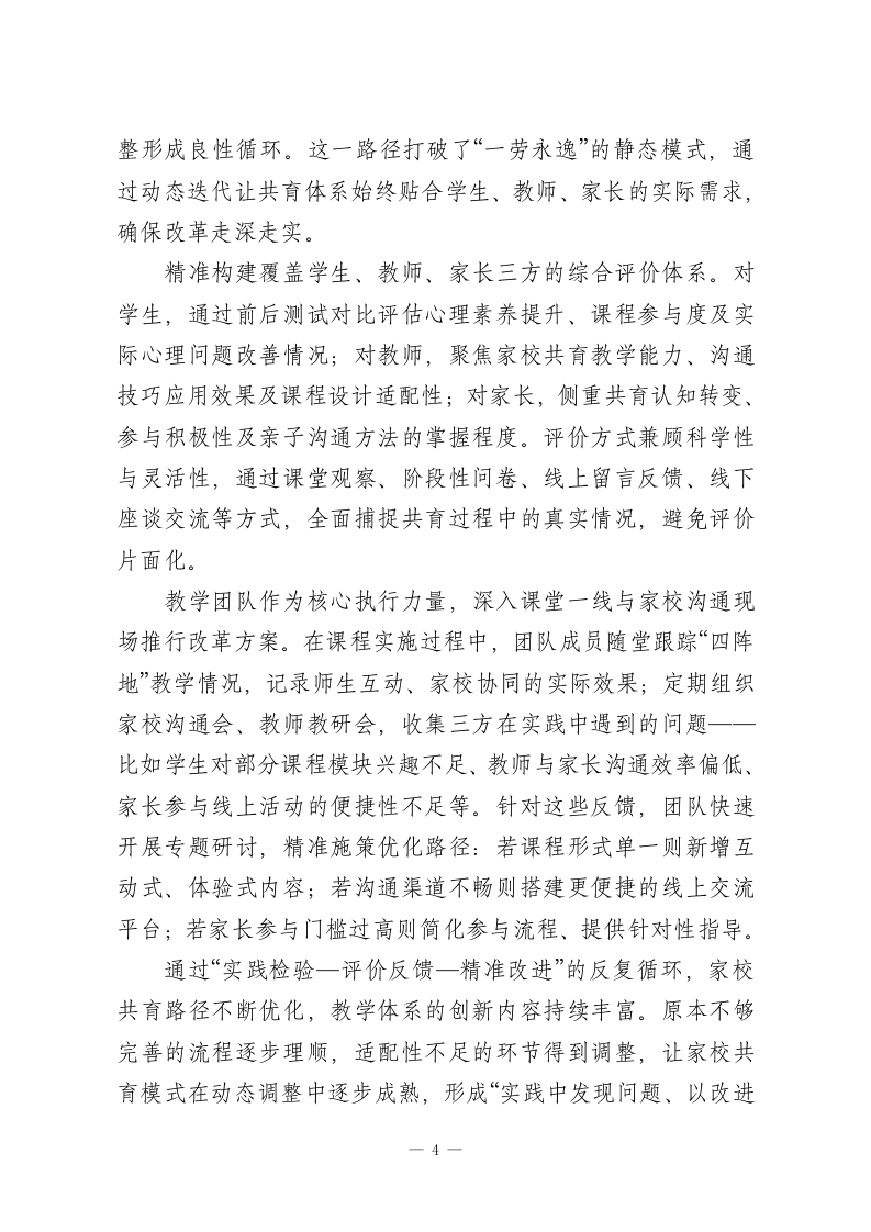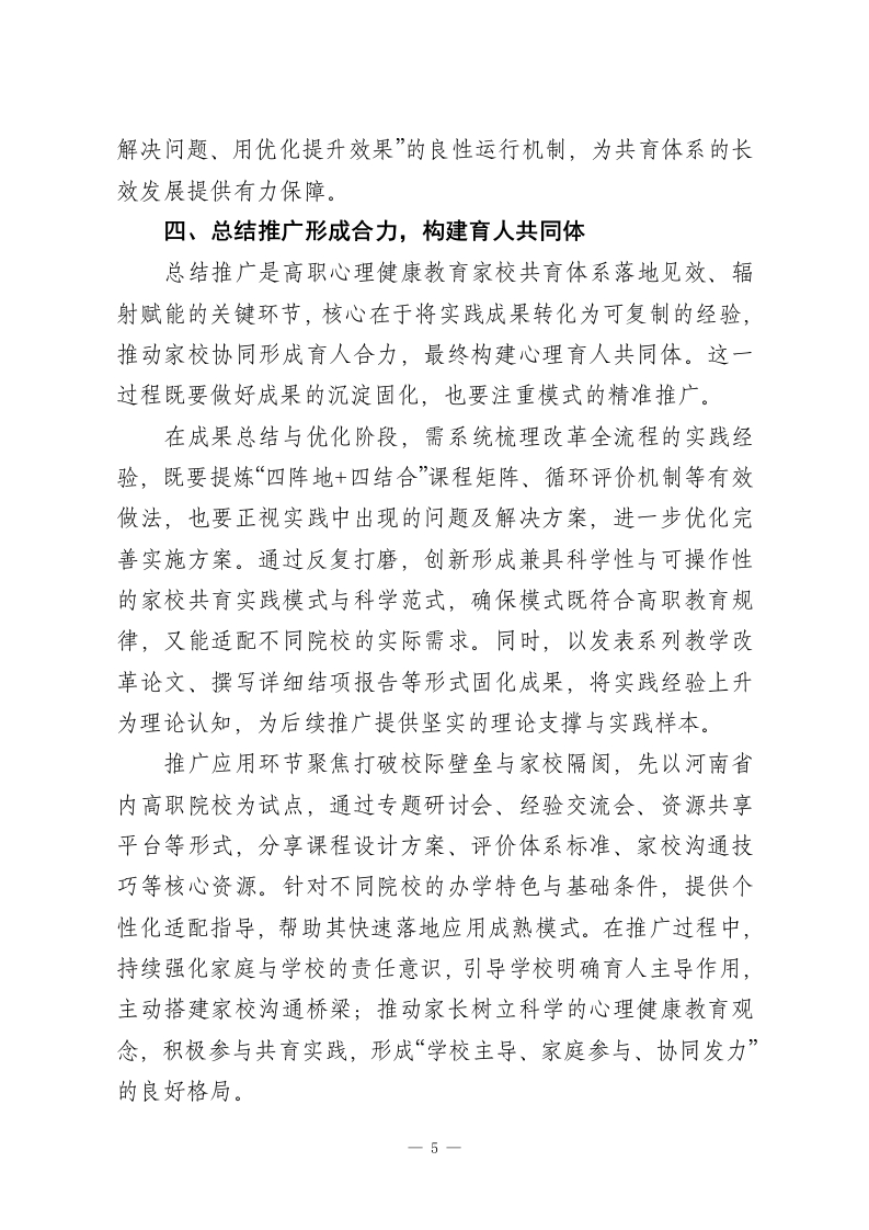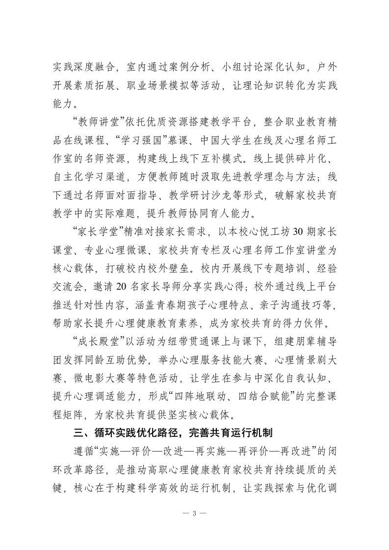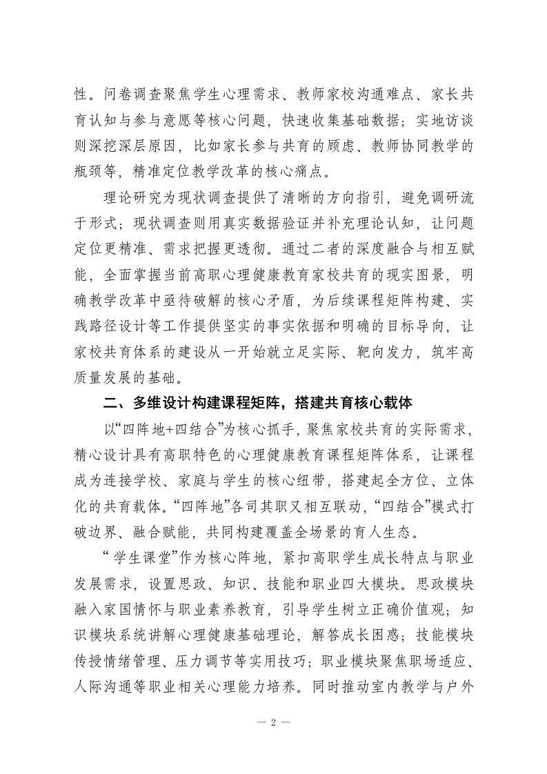 XX学院副教授:高职心理健康教育家校共育建设路径探索与实践当前,高职学生心理健康问题日益受到关注。高职院校通过系统化心理健康教育,为学生职业适应与长远发展筑牢心理根基,家校共育则是提升心理健康教育实效的关键抓手。教育部等部委多次强调家校社协同育人的重要性,为高职心理健康教育改革指明方向。当前,部分高职院校存在家校协同机制不健全、课程体系适配性不足等问题。本文立足实践,从理论调研、课程矩阵构建、循环实践优化、总结推广四大路径展开探索,为打造高职特色心理健康教育家校共育模式、构建心理育人共同体提供实践参考。一、理论调研双轮驱动,筑牢建设基础建设高职心理健康教育家校共育体系,理论研究与现状调查的双轮协同是首要根基,直接决定后续建设的科学性与针对性。理论研究层面,需系统搜集国内外家校共育、高职心理健康教育相关的学术文献、实践案例及政策文件,重点梳理教育部等部委关于家校社协同育人的指导要求,厘清该领域的研究脉络、核心观点与实践短板。通过深度分析提炼,明确理论应用的契合点,为共育体系建设提供坚实学理支撑,避免改革方向跑偏。现状调查环节,采用“问卷调查+实地访谈”的组合方式全面摸底。调研对象覆盖本校及河南省内多所高职院校的学生、心理健康教师、班主任与家长代表,确保样本兼具代表性与多样一1一
