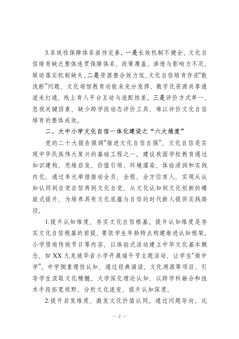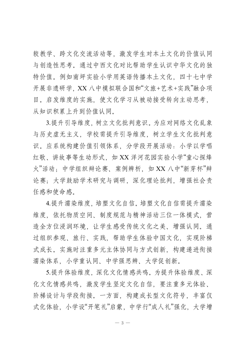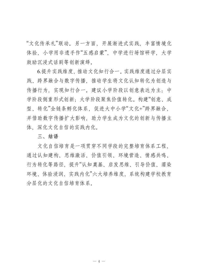 XX艺术学院校长讲话:“六大维度”构建大中小学文化自信培育的实践框架文化是一个国家、一个民族的灵魂。我国将文化建设置于治国理政突出位置。《教育强国建设规划纲要(2024一2035年)》指出要加强文化教育并融入思政教育。学校构建文化自信培育体系,是时代任务,更是筑牢国家文化软实力根基的必然要求。一、大中小学文化自信一体化建设存在的问题在当前全面推进文化自信自强的时代背景下,大中小学一体化培育体系作为传承中华优秀传统文化、康续红色基因的重要途径,其建设成效直接关系到立德树人根本任务的落实。然而面临现实困境,需从多方面破解。1.一体化工作格局尚未健全。一是缺乏协同育人机制,大中小学不同学段文化自信培养上下未贯通,学校与家庭、社会联合培养的制度化平台少,各学段教育资源分散、目标互斥或断层。二是理论研究有限,分类研究多但实证研究少,未形成全学段动态目标体系,实践支撑弱。2.跨学段统筹机制存在短板。一是内容梯次性不够明晰。各学段的教学内容有重复或脱节的情况。二是方法论不匹配。机械套用教学方法,小学阶段过度依赖灌输式讲解,而高校则弱化实践体验。三是跨学科协作力量欠缺。课程教学中部分教师对文化自信相关要素的挖掘尚显不足,未能有效实现文化自信培育内容与专业课程体系的深度融合与有机衔接。1
