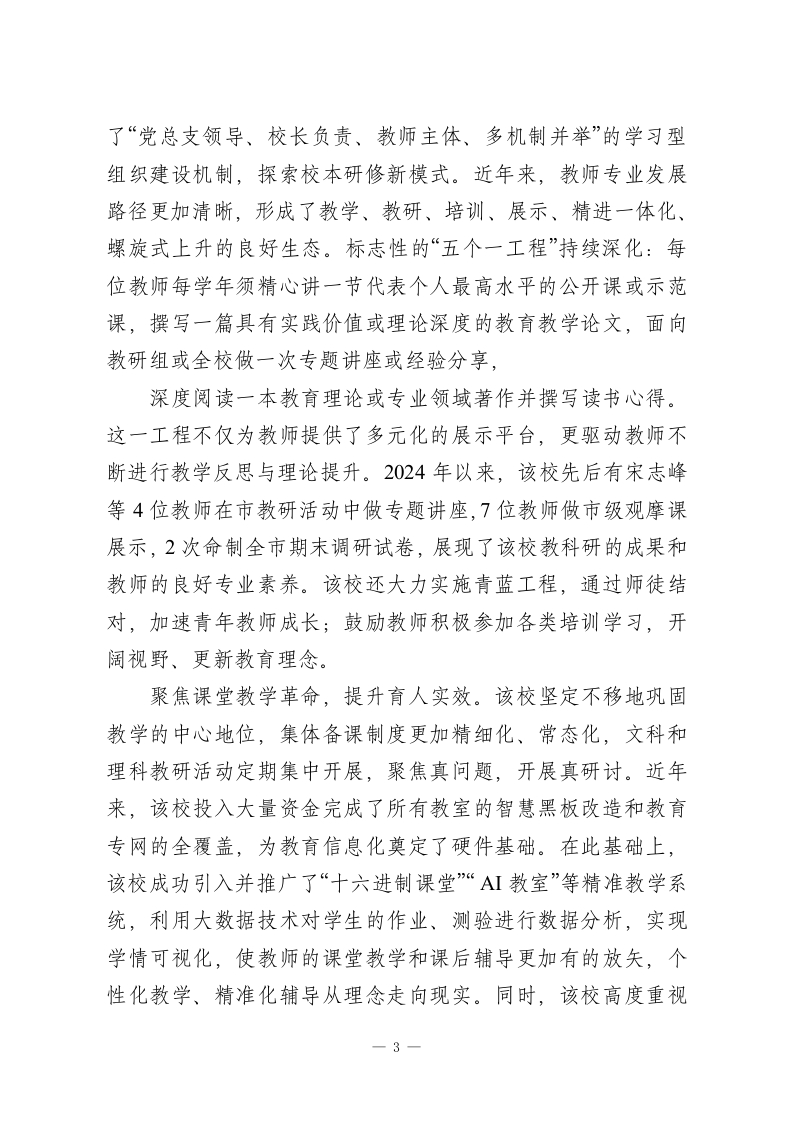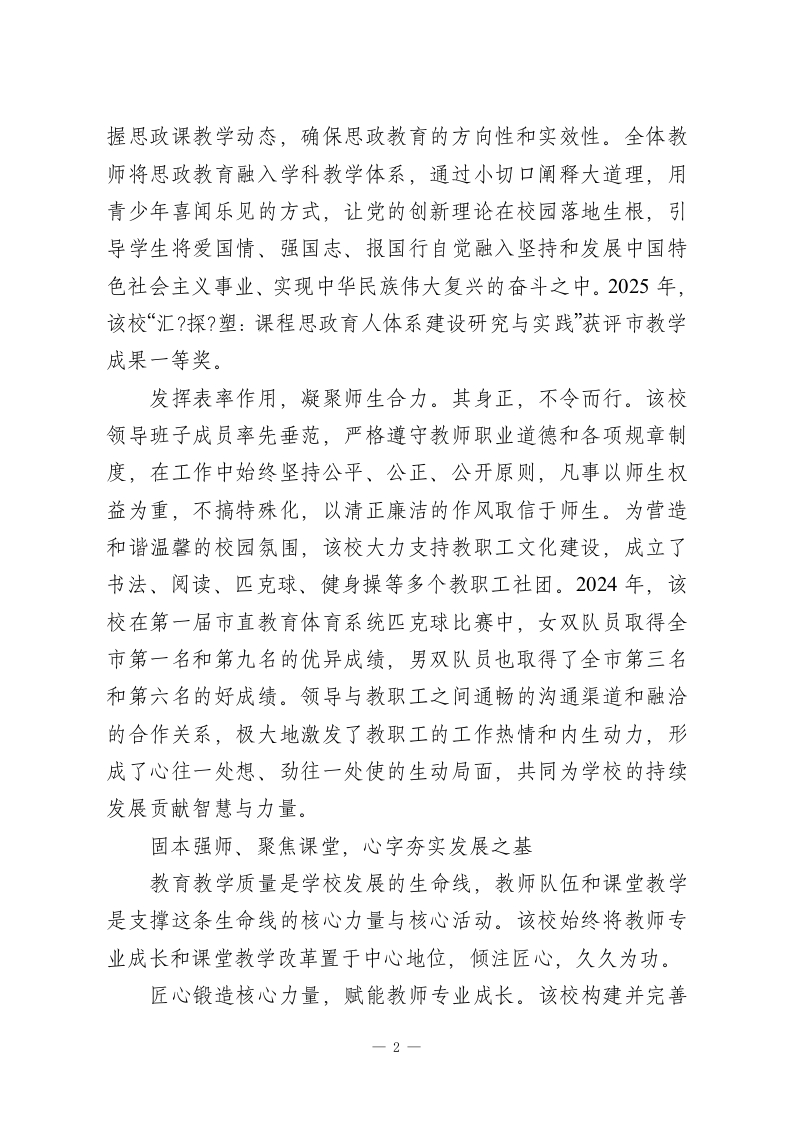 XX中学教育教学改革纪实:念好六字诀,砥砺奋进结硕果在新时代教育改革的澎湃浪潮中,XX市XX中学全面贯彻党的教育方针,牢牢把握立德树人根本任务,致力于培养德智体美劳全面发展的社会主义建设者和接班人。学校全体师生凝心聚力、锐意进取,在实践中凝练并深入践行“信、心、德、研、联、赛”六字诀,推动教育教学质量实现跨越式提升,书写了令人瞩目的奋进篇章。铸魂育人、擎旗奋进,信字铸就办学之魂“培养什么人、怎样培养人、为谁培养人”是教育的根本问题,也是XX市XX中学办学的逻辑起点和价值归宿。该校始终坚持党对教育工作的全面领导,将党建与教育教学融为一体,通过加强队伍建设和丰富活动载体为学校高质量发展插上“两翼”,提供坚强的政治保证和强大的精神动力。2022年7月,XX市XX中学党支部被XX市委直属机关工作委员会评为“五星”党支部;2024年4月,该校被市委组织部、市教育体育局联合命名为全市首批中小学校“一校一品”党建品牌特色校,“体两翼”党建品牌熠熠生辉。强化理想信念教育,筑牢思想根基。该校深刻认识到思政课是落实立德树人根本任务的关键课程,校党总支书记、校长坚持每学期带头讲“开学思政第一课”,以深厚的理论功底和鲜活的案例,为学生“扣好人生第一粒扣子”。该校领导班子成员常态化深入班级思政课堂,听课、评课、与师生交流,及时掌1