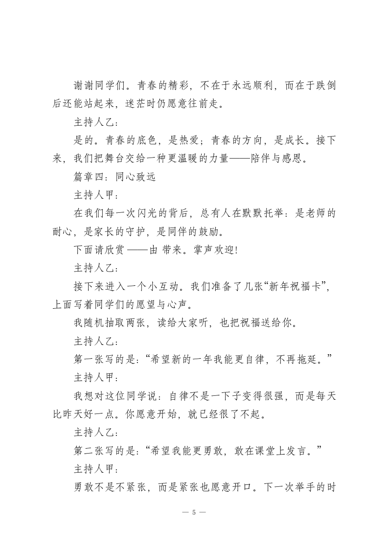 灯火迎新岁,舞台见成长2026元旦文艺展演主持词主持人甲:尊敬的各位领导、老师,亲爱的同学们,现场的家长朋友们一大家下午好!欢迎来到学校2026年元旦文艺展演的现场。此刻,灯光亮起,舞台打开,新的时间也在悄悄翻页。我们站在岁未与岁首交汇的这一刻,听见的不只是欢歌笑语,更是成长在时间里发出的回响。主持人乙:大家好!我是主持人乙。站在这个舞台上,我突然有一种很真实的感觉:原来“新年”并不是日历上简单的一页更替,而是我们一起走过的每一天,在这一刻都被温柔地照亮。这一年里,校园里有过清晨跑操的口令,有过教室里专注的眼神,有过运动场上冲刺的汗水,也有过舞蹈房里一次次的排练与磨合。今天,我们把这些努力、这些热爱、这些坚持,统统搬到舞台上,让它们在掌声里发光。主持人甲:元旦,是告别,也是出发。它提醒我们:过去的一年,可能有收获也有遗憾,有高光也有坎坷;但无论如何,那些走过的路、熬过的夜、咬牙坚持的时刻,都不会白费。因为它们共同组成了一个更成熟、更坚定的我们。1