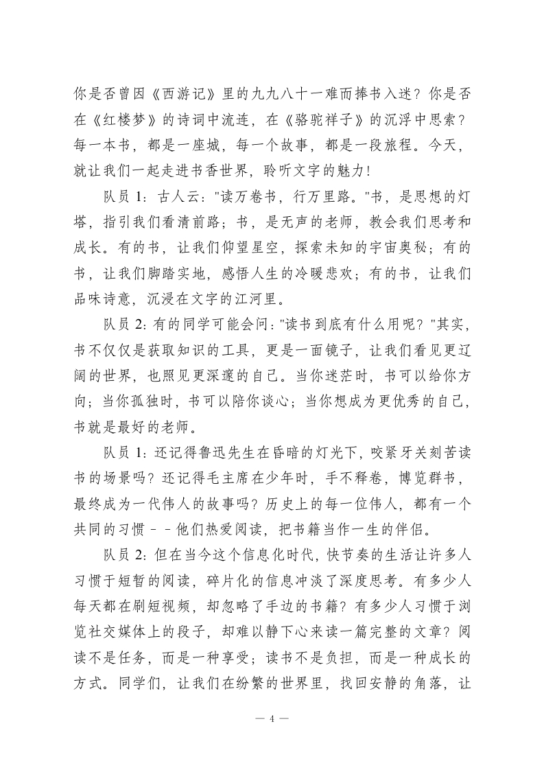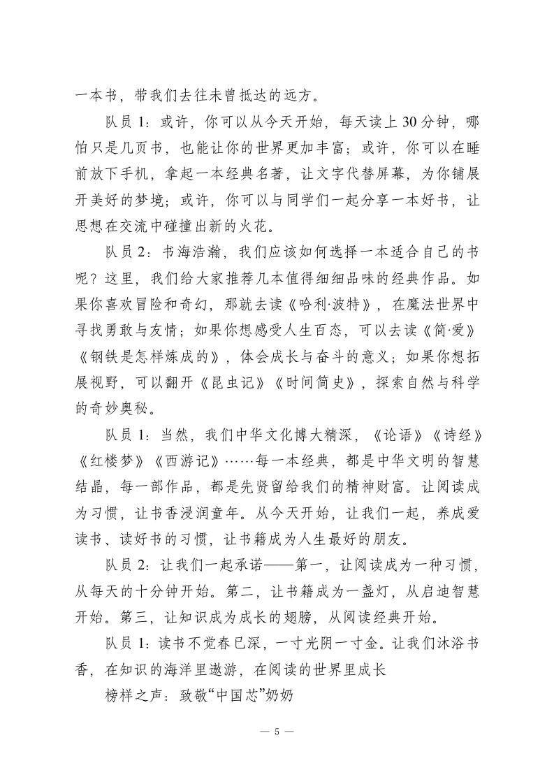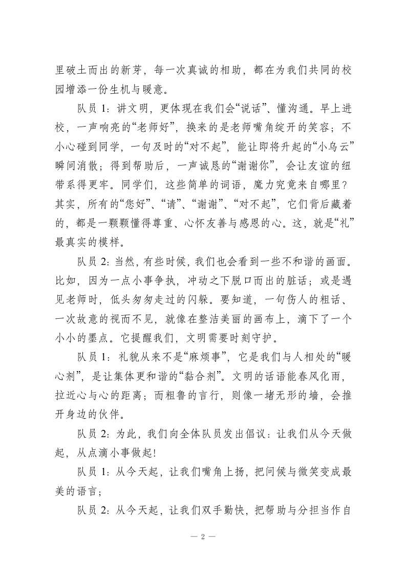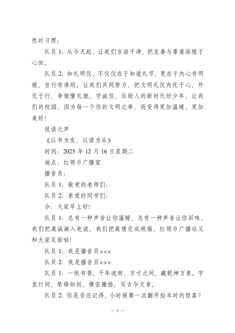第16周广播稿:德育之声《知礼明仪,与“礼”同行》时间:2025年12月15日星期一地点:红领巾广播室播音员:队员1:敬爱的老师们:队员2:亲爱的同学们:合:大家早上好!队员2:唤醒你的耳朵,触摸你的心灵,用电波传递温暖,用声音传播正能量,红领巾广播站与你相约。让我们一起在广播中绽放光彩,书写美好校园篇章。队员1:我是播音员×××队员2:我是播音员×××队员1:今天,我们红领巾广播站想和大家再次聊一聊特别重要的话题一一文明礼仪。它就像空气一样,融入在我们校园生活的每一个角落,影响着我们和同学的相处、和老师的交流,更塑造着我们每个人的品格。队员2:首先,让我们把掌声和赞美,送给校园里那些“藏不住”的美好。清晨走进教室,总有同学悄悄擦干净黑板、摆齐课桌椅;看到有同学身体不适,会立刻跑去告诉老师,还细心递上温水;在操场捡到财物,没有丝毫犹豫就交给了值周老师。同学们,这样的温暖身影,你是否也见到过?你自己,是不是也做过这样闪着光的“小事”呢?这些举动看似微小,却像春天一1
